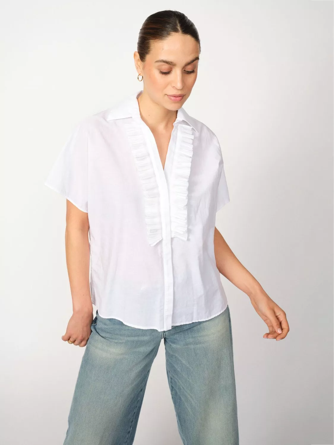 Elevating your everyday style with ease, this cotton blended blouse from MOS MOSH features a v-neckline, short sleeves and comes in a relaxed ruffled design.