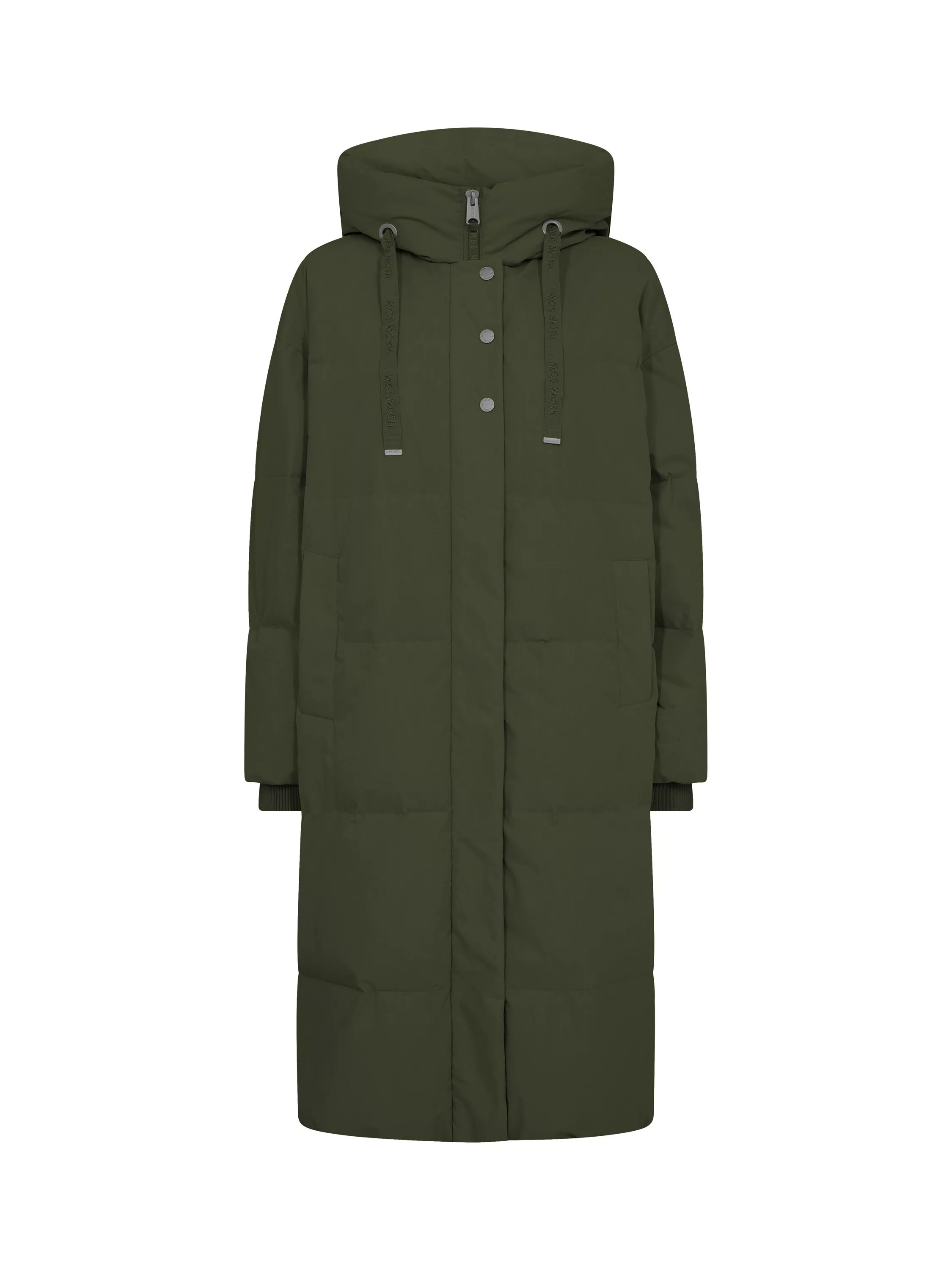 An oversize down coat is a must have this season! This coat is designed in an oversize and longer fit, making it much younger and up to date. It has warm-down filling and cool quilted panels. The big hoodie and ribbed details on the cuffs are great to cover you from heavy wind and keep you warm. It has a magnet closure on the bottom hem as a cool little detail. The matte finish of the fabric makes it very modern an adds even more coolness to the jacket.