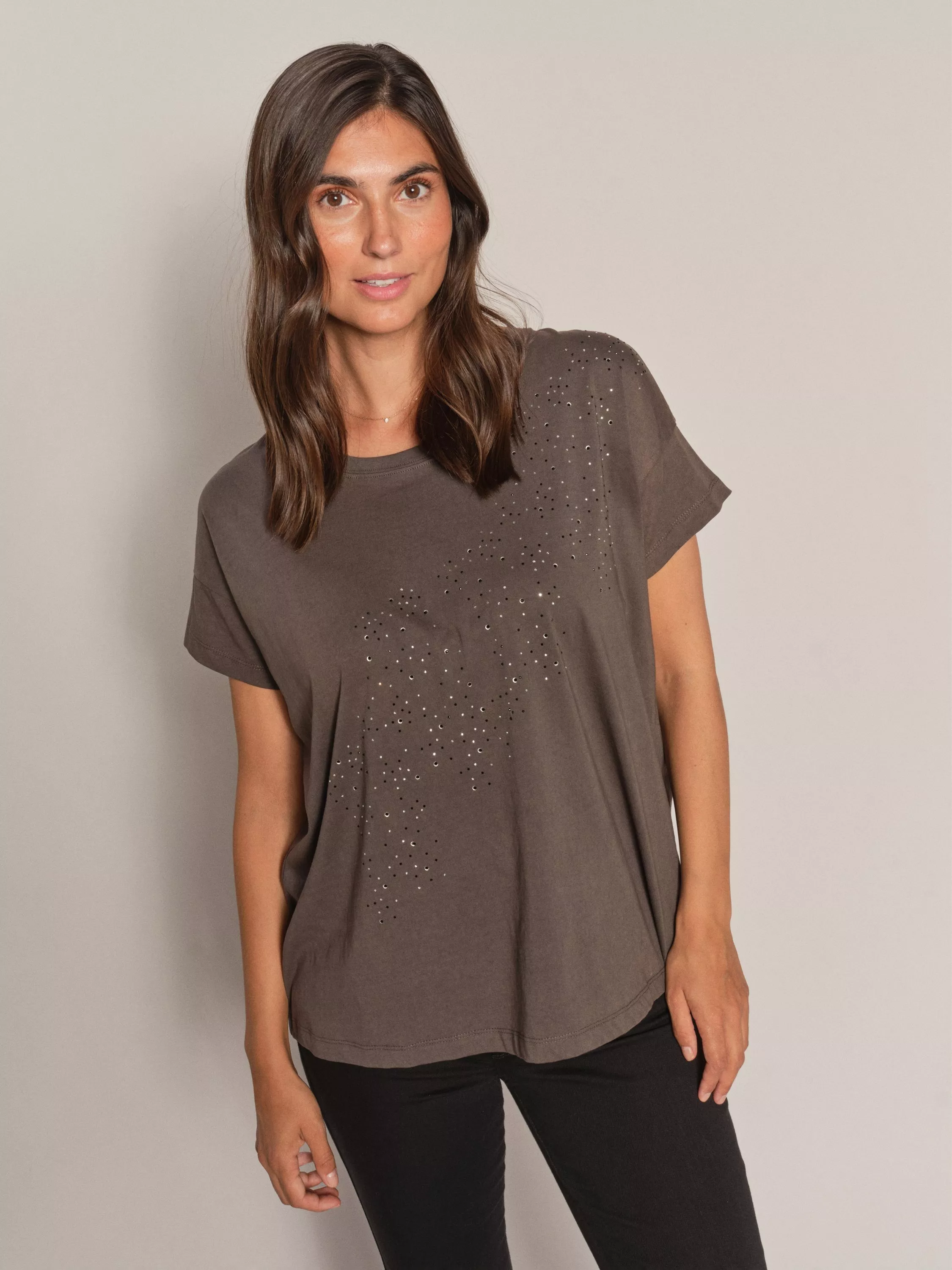 Regular fitted tee, finished with studs and rhinestones across the chest. It has an edgy rock n roll feel which looks amazing with worn-in jeans.