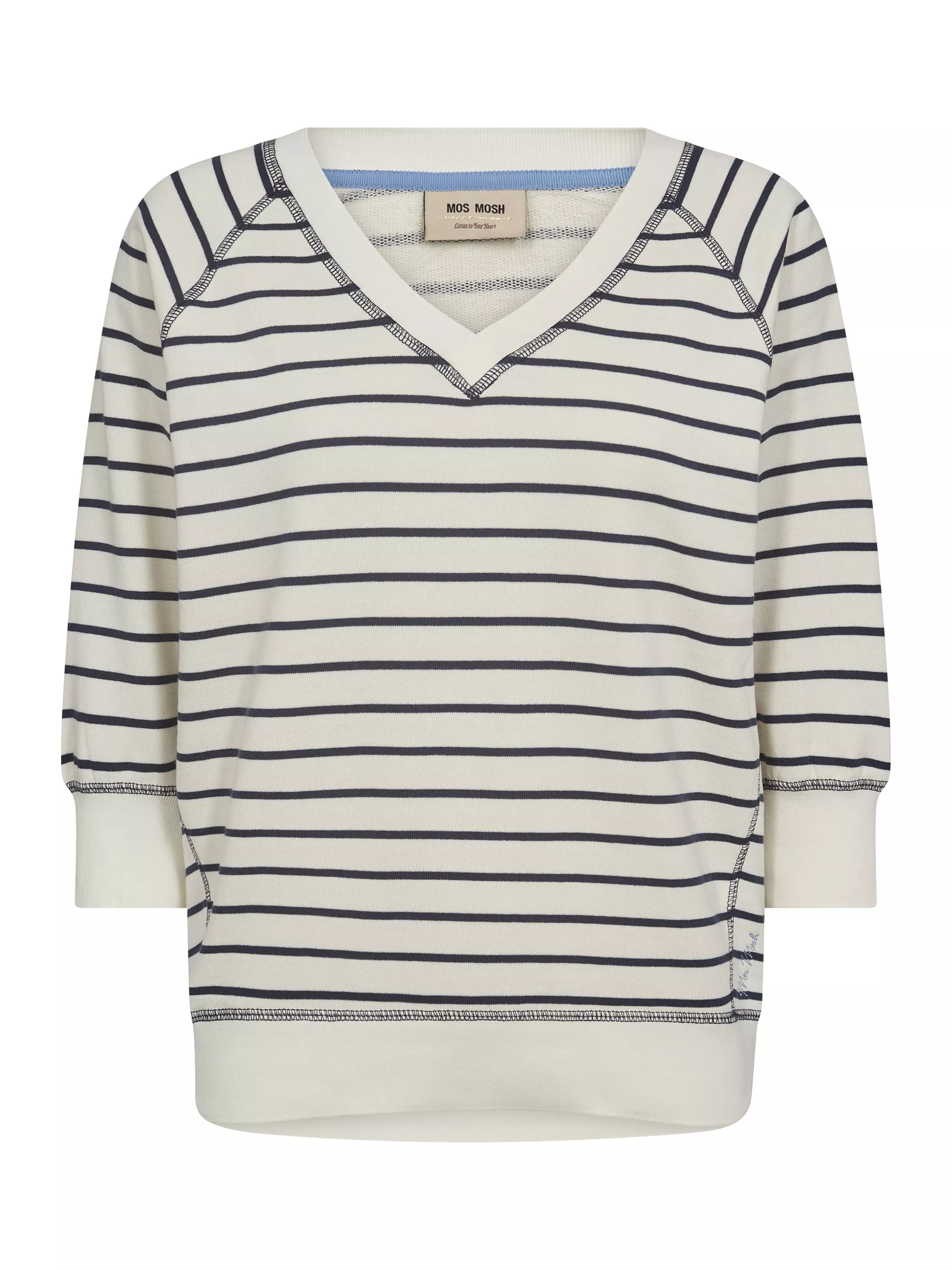 Preppy-inspired stripe sweatshirt designed in a relaxed fit. Finished with solid coloured collar, cuffs and bottom hem. Tuck into dark blue high-waist denim to complete the preppy look.