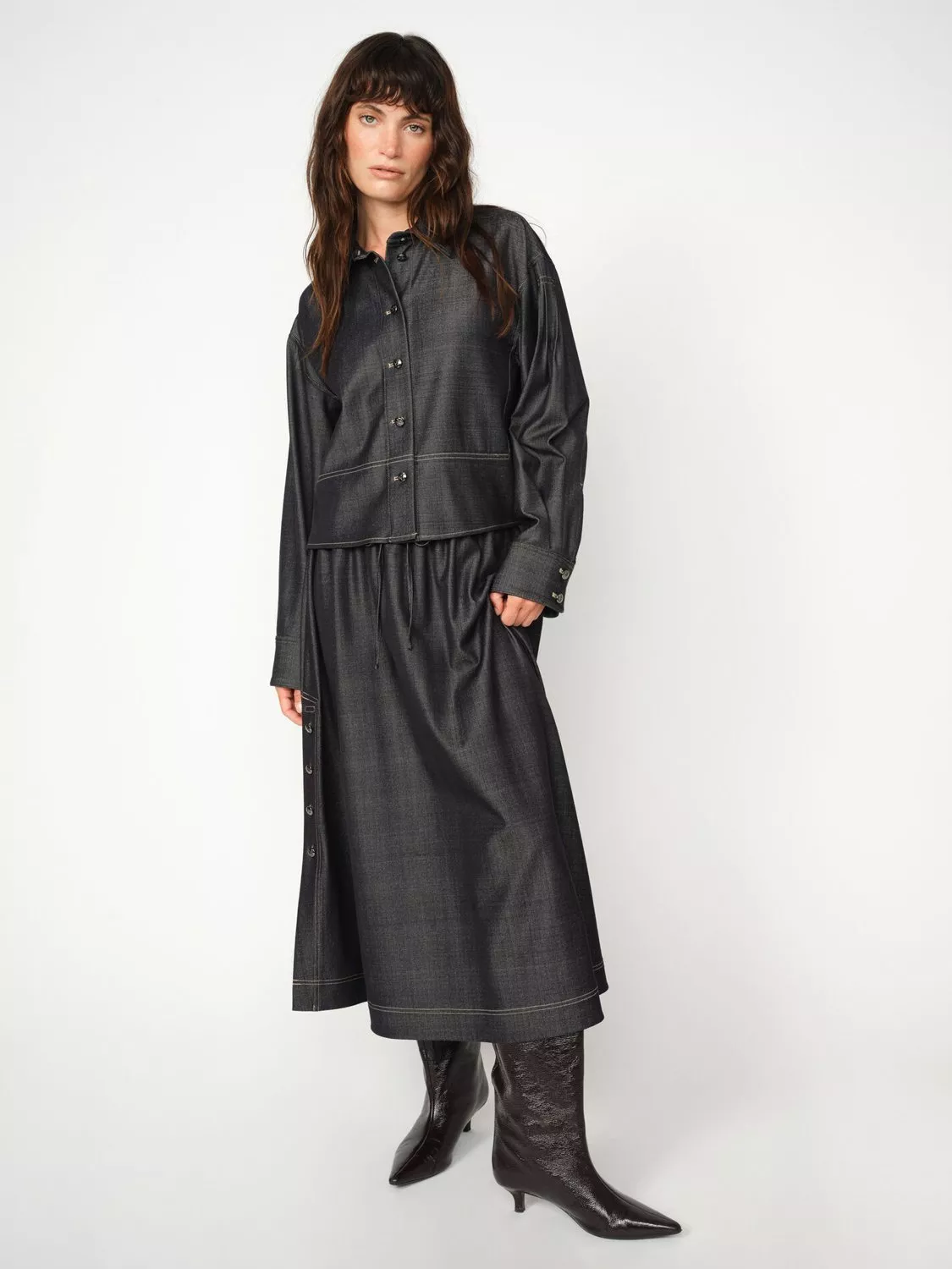 Experience elegance with the Poy Cilla Skirt, featuring premium TENCEL™ Lyocell fabric, elasticated waist, and drawstrings for blend of comfort and style.