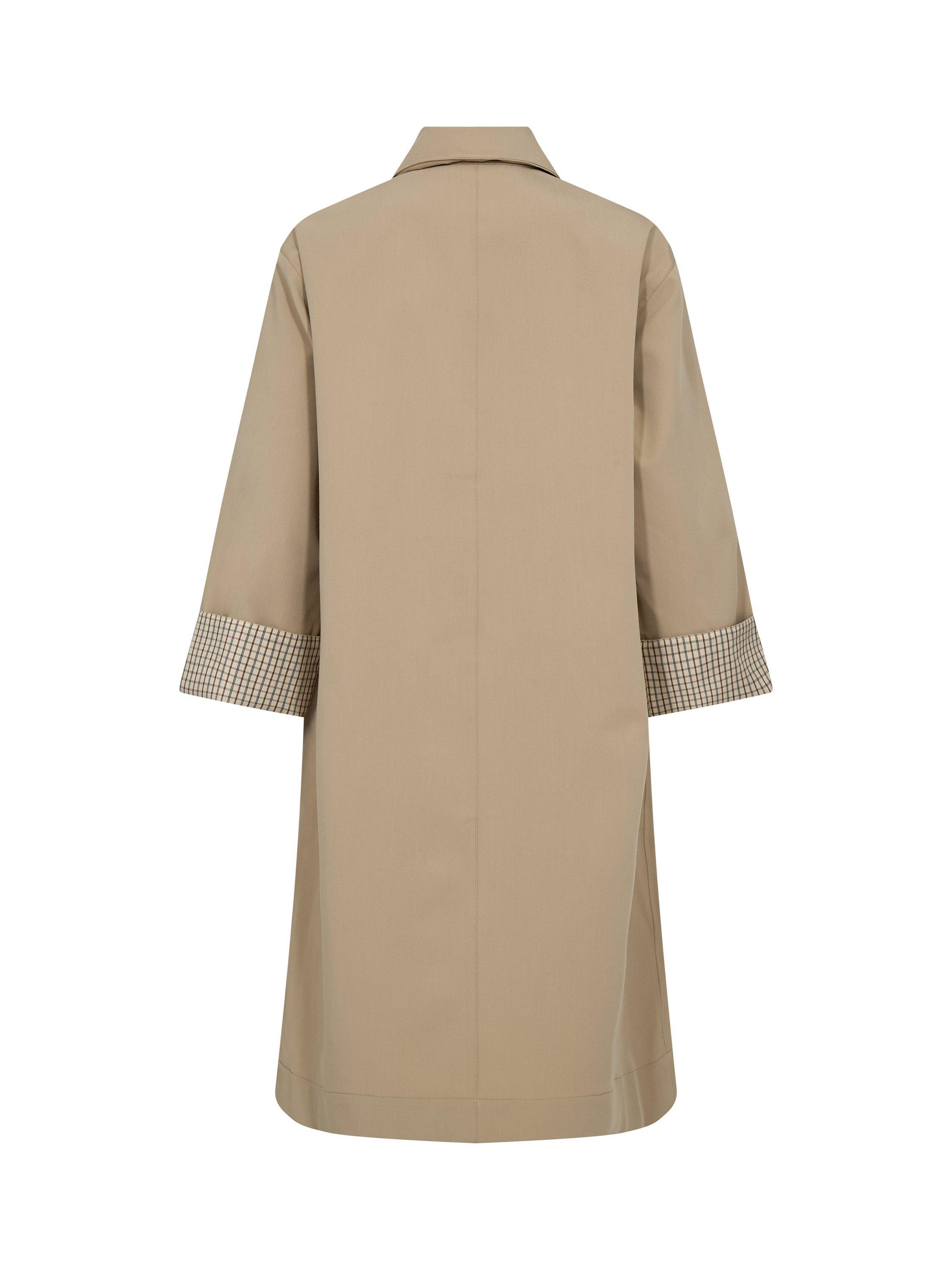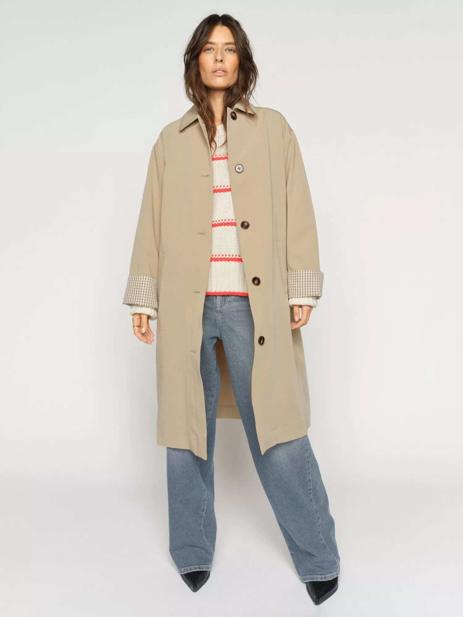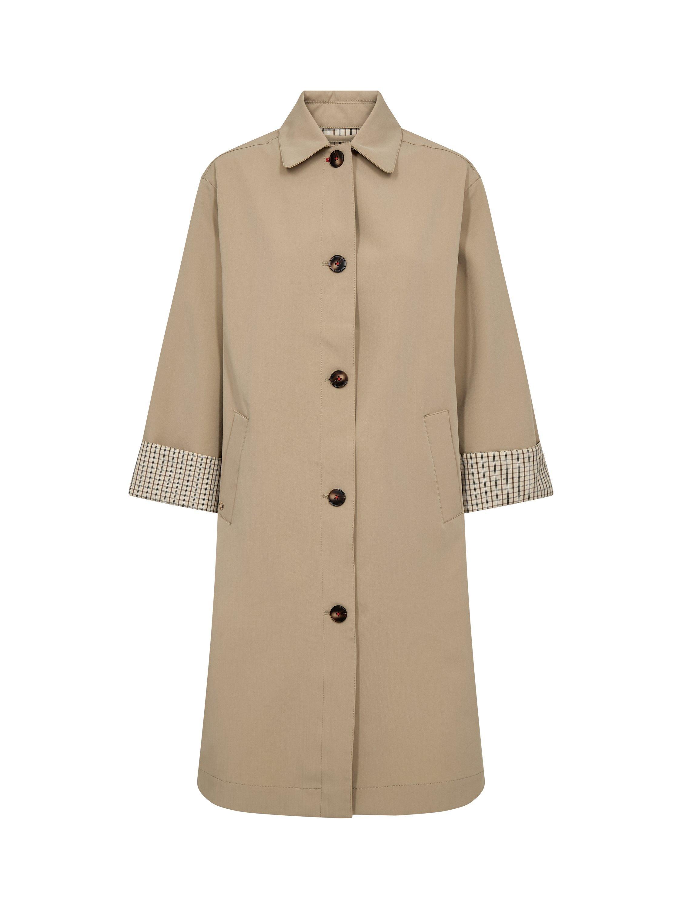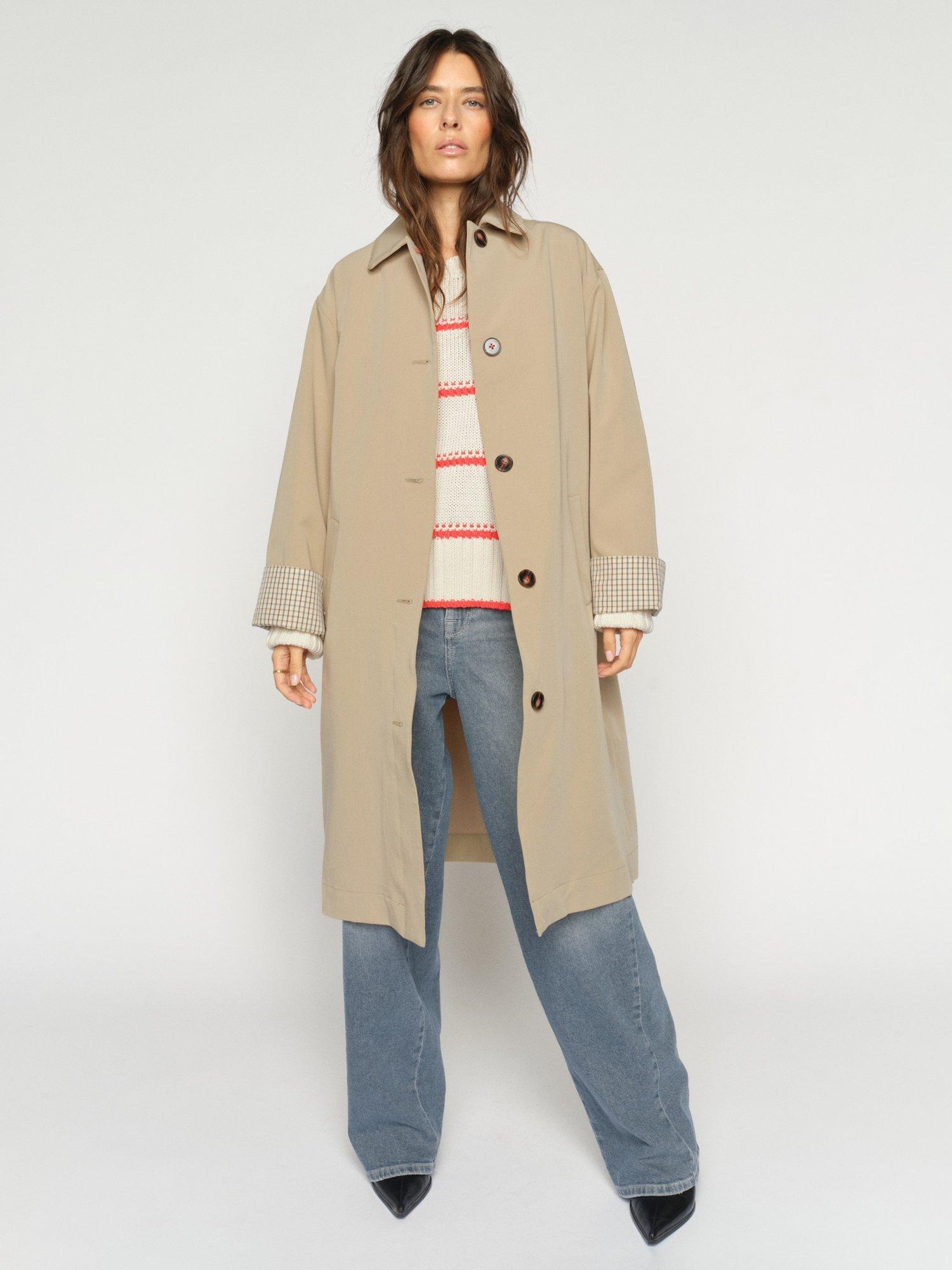 A modern twist on the timeless trench. This relaxed-fit coat features a classic collar, button closure, and cropped sleeves with contrasting striped cuffs for a refined touch. Crafted from a smooth, slightly stretchy blend, it offers effortless sophistication, perfect for layering over both tailored and casual looks.