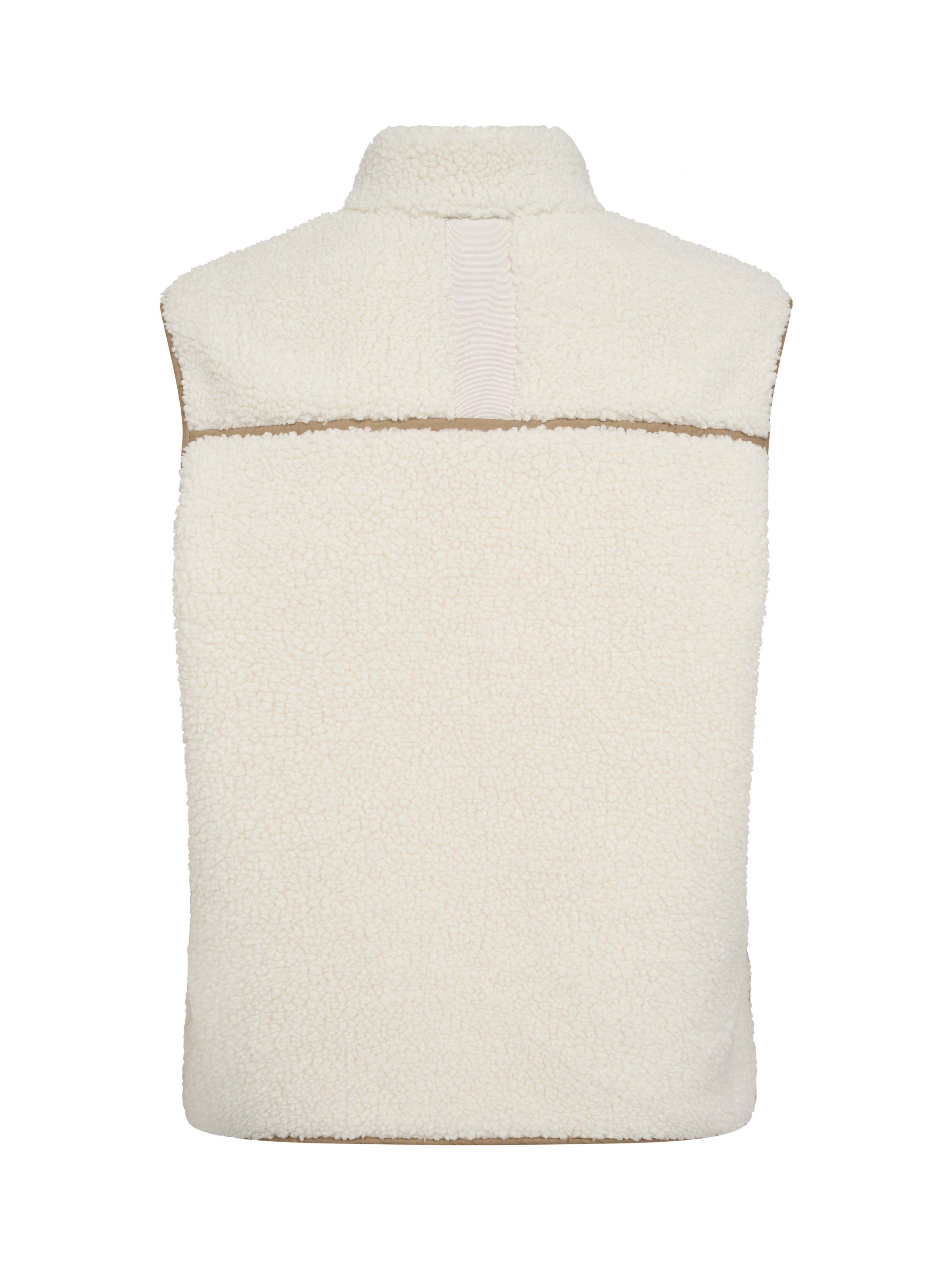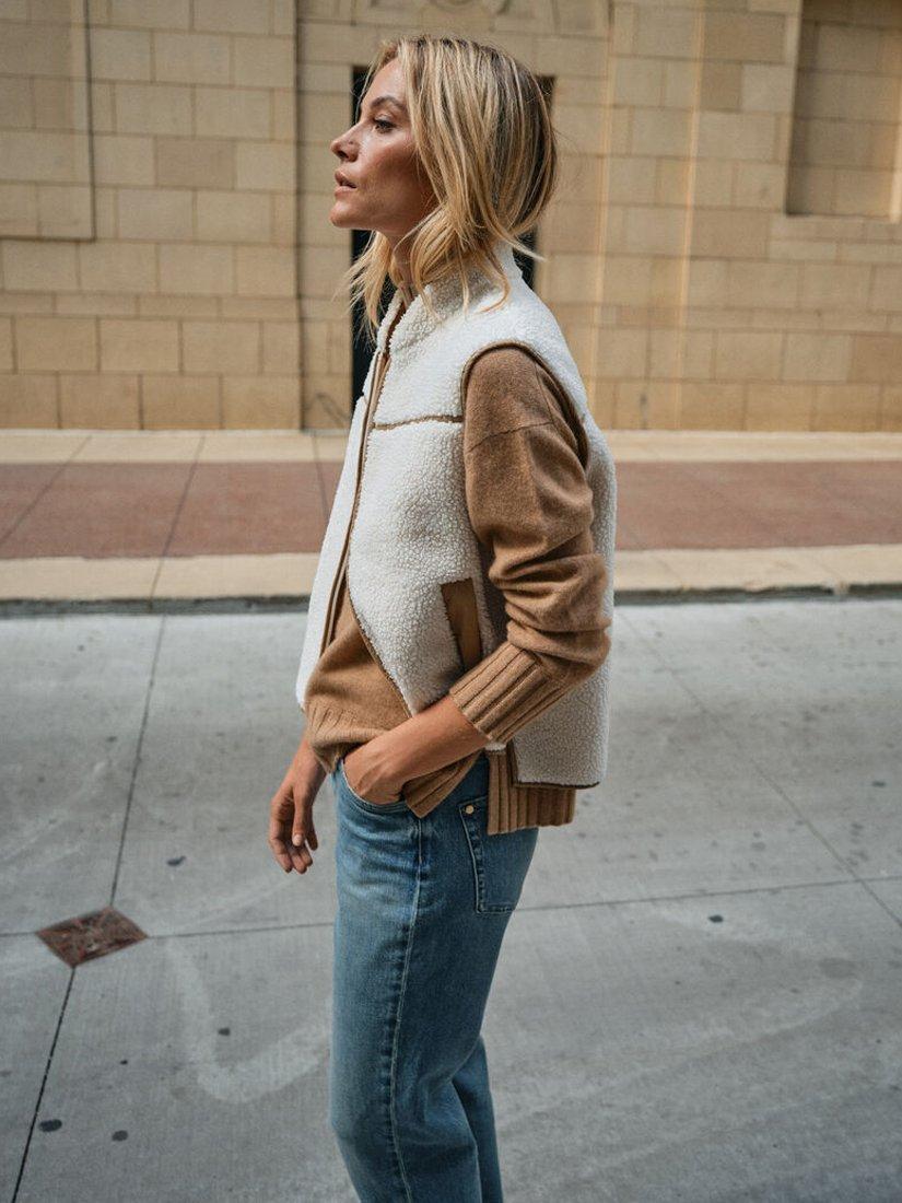 A teddy waistcoat is a great layering piece for cold autumn days. This is designed in a relaxed fit with contrast coloured piping, zipper closure and front pockets. It has a slightly longer hem in the back and graphic cut side slits. We added tape detail on the back as a signature twist. Pair yours with a chunky knit on cold days or layer it over a trench coat for a cool and trendy look.