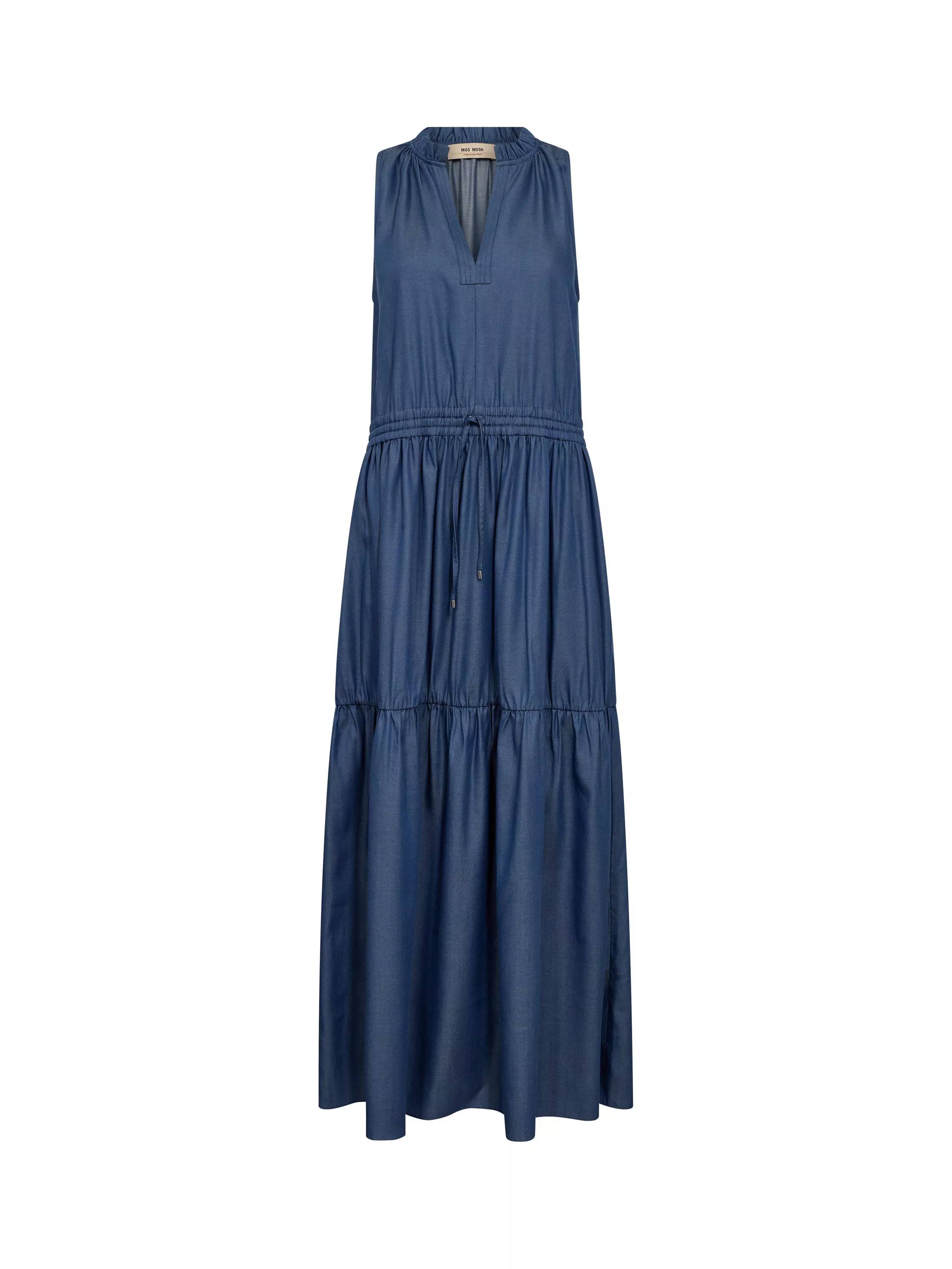 This denim dress is such a chic piece! It's designed in a loose silhouette with a flattering V-neck and drawstrings, so you can highlight the waist or leave them hanging for a more relaxed look. This dress is detailed with soft pleats and frills.