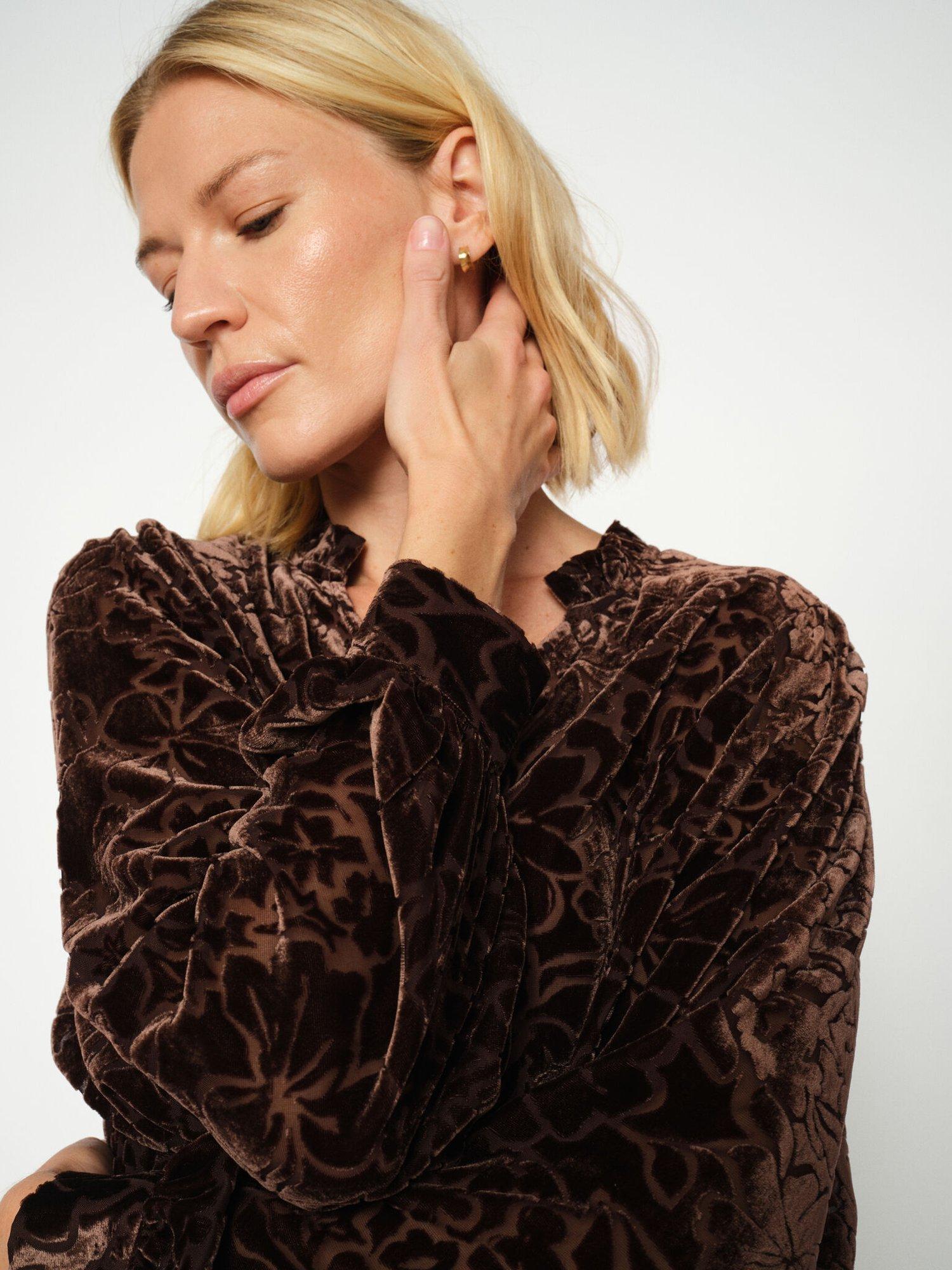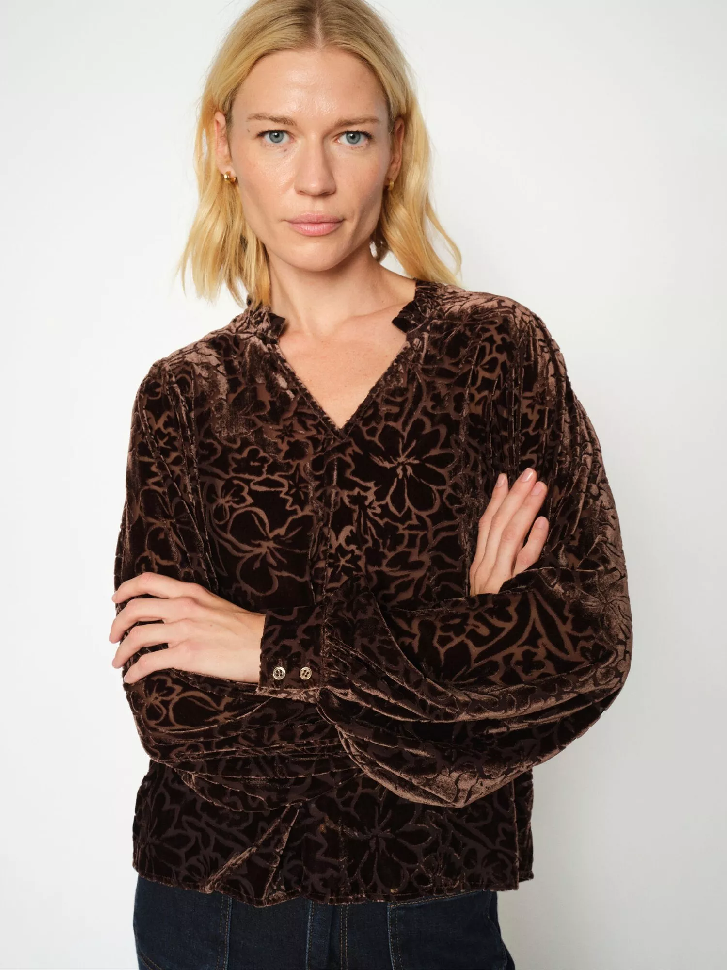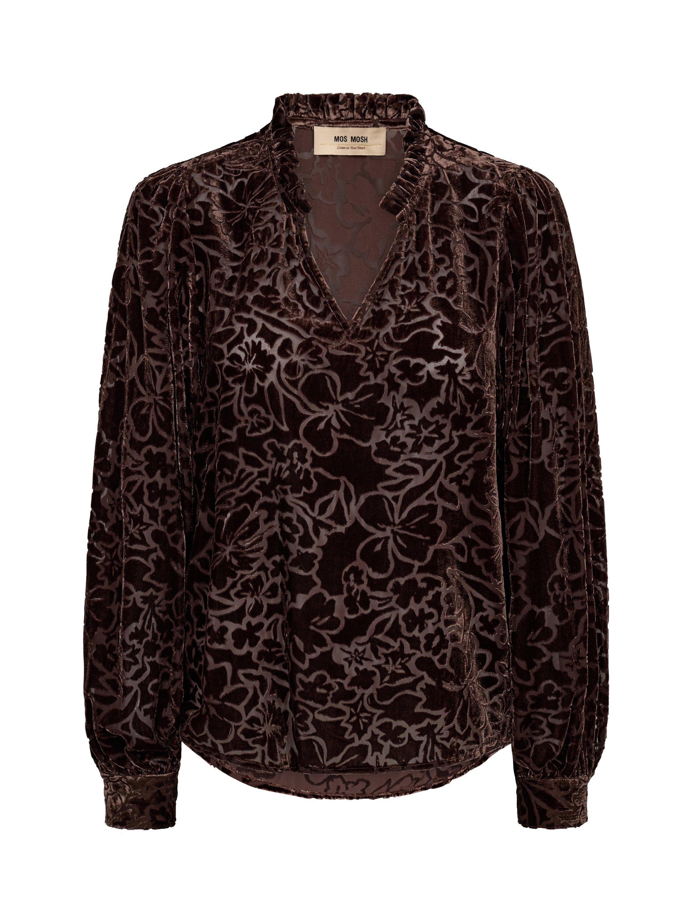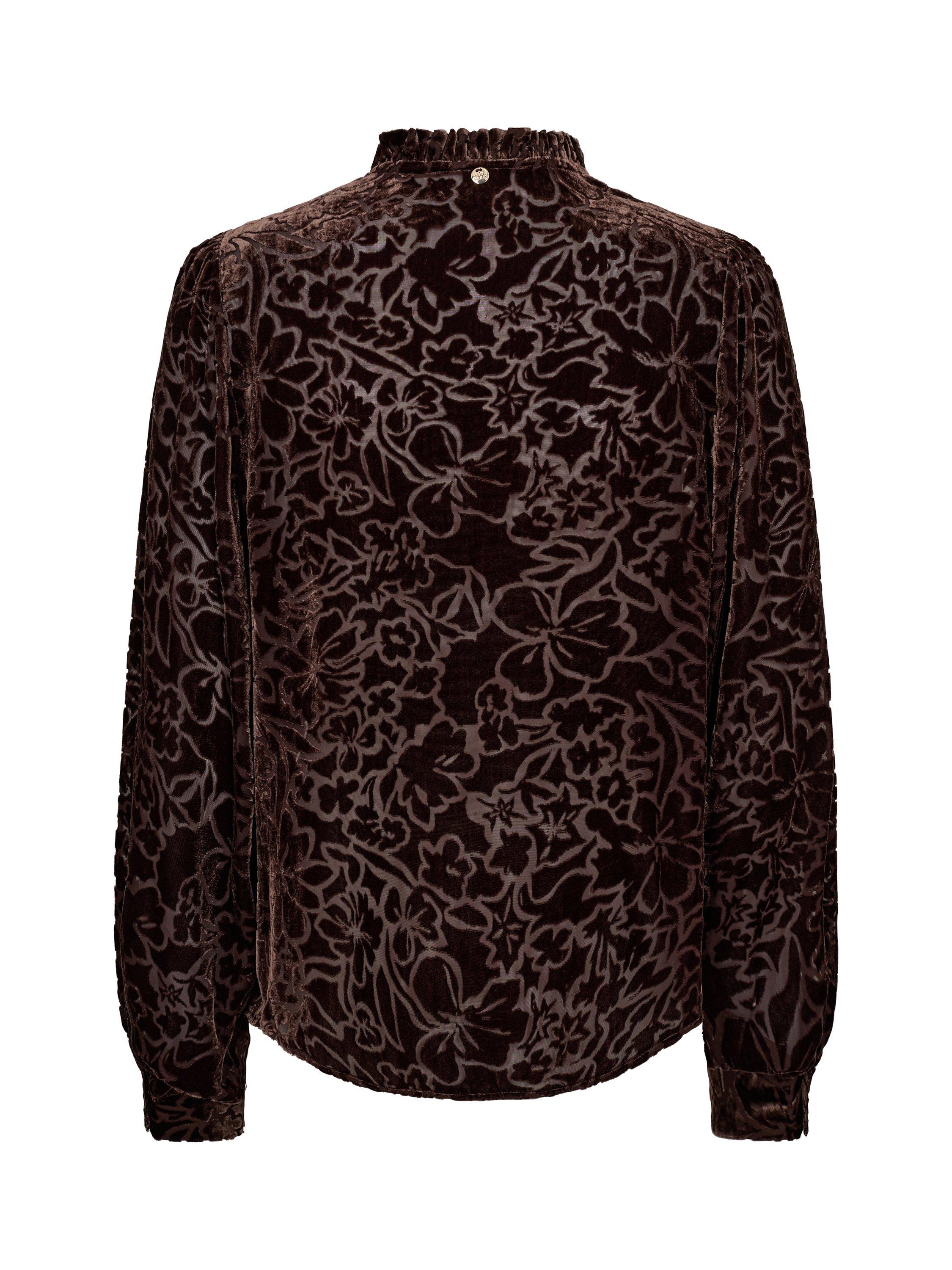 This V-neck blouse features a detailed velvet burnout floral design with long sleeves, perfect for elegant evenings or chic day wear.