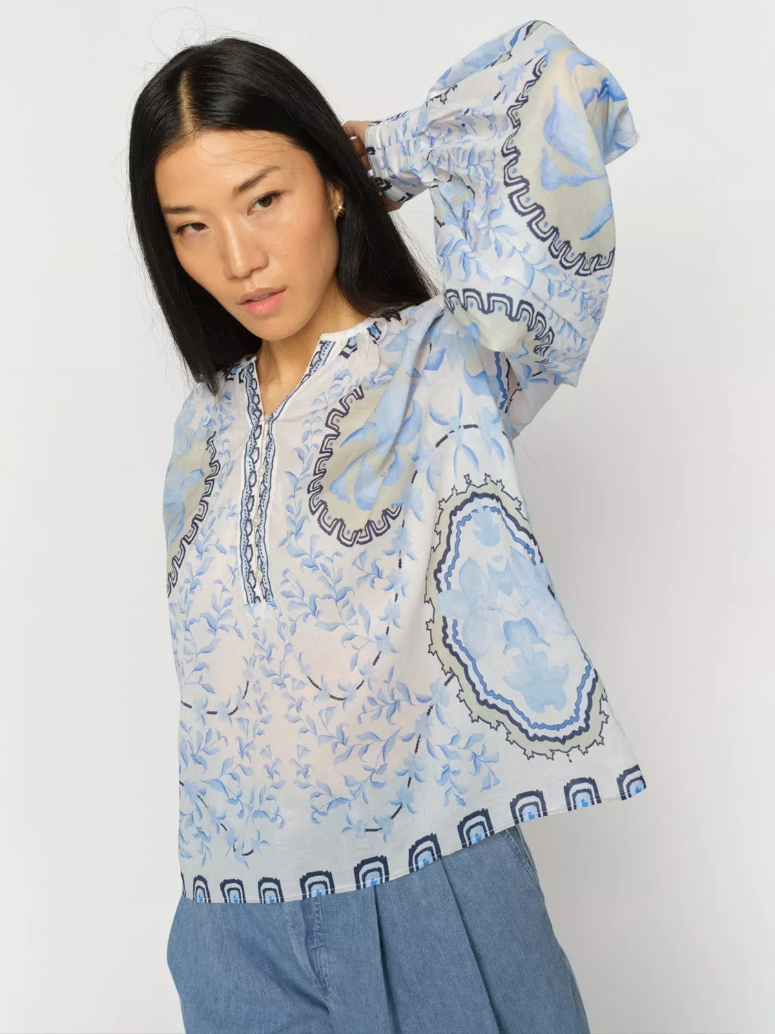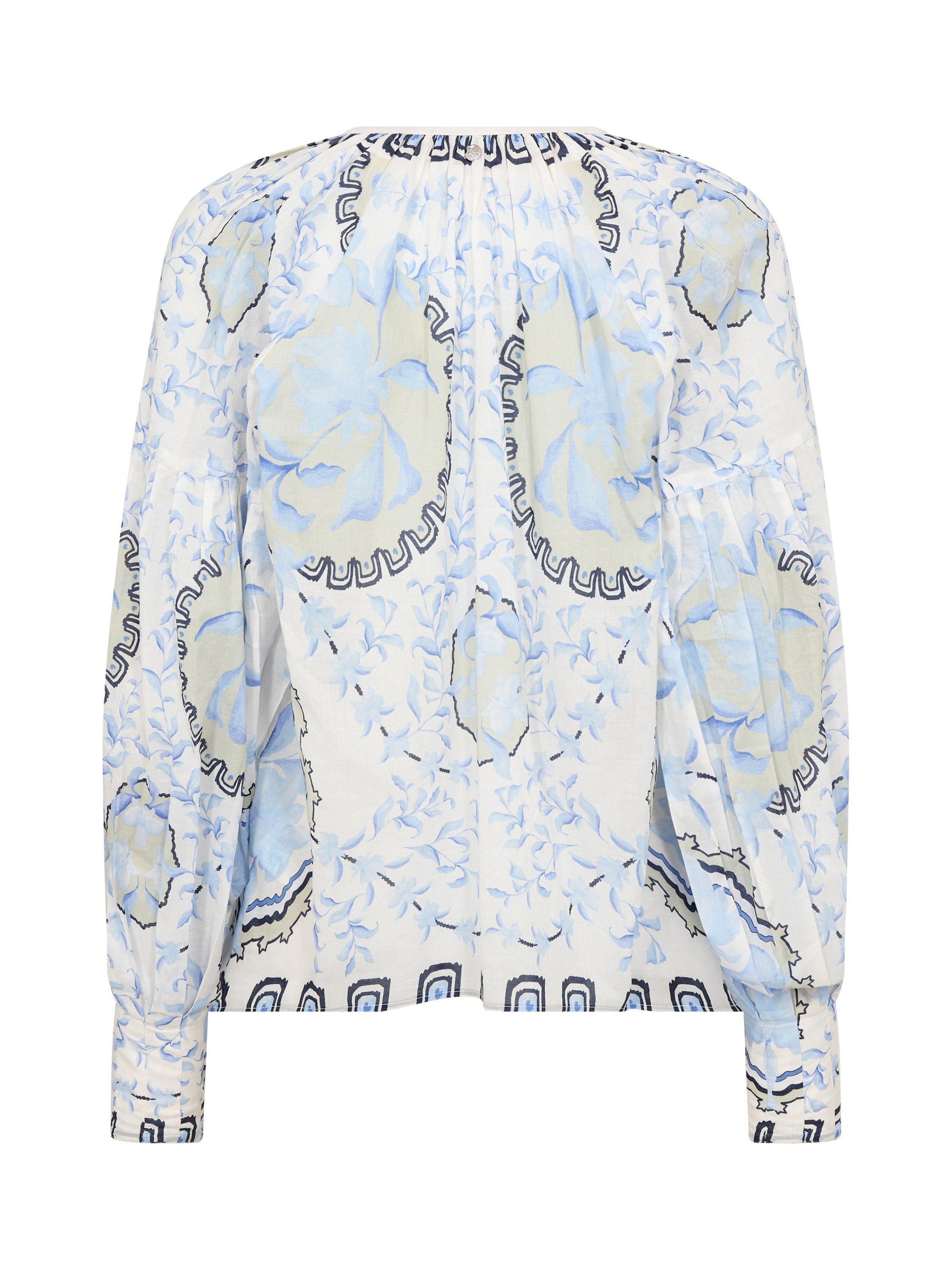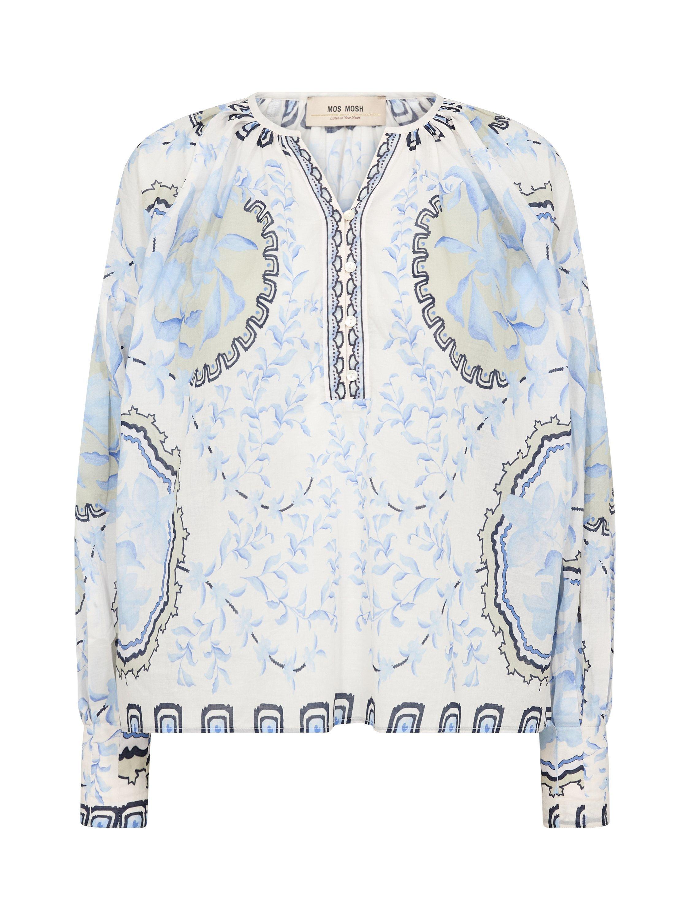 This lightweight long sleeve V-neck blouse features a lively floral pattern in soft cotton, offering breathable comfort and easy movement for your day. The relaxed fit lets you style it your way.