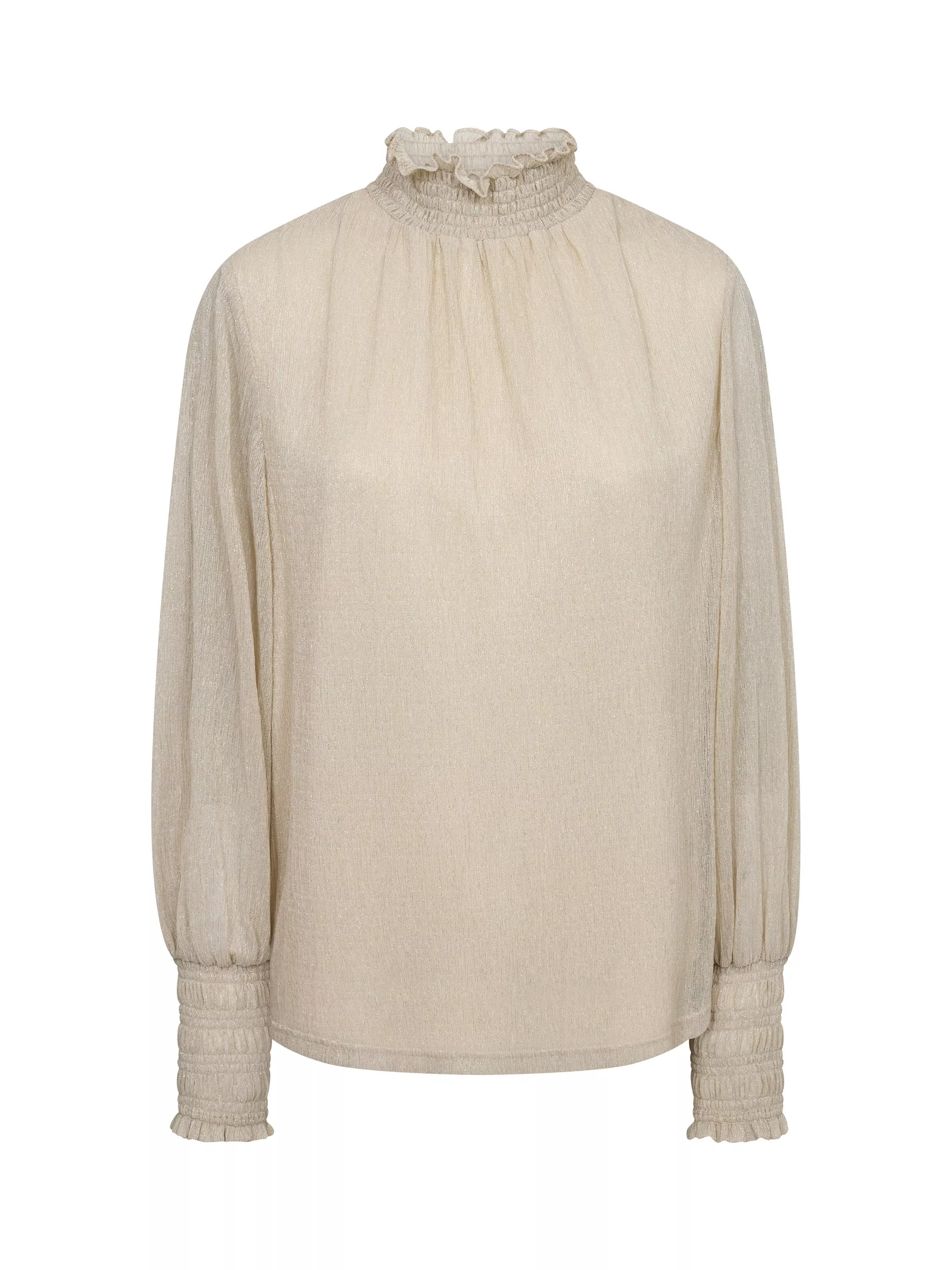 Go full glam with this stunning blouse, designed in a slightly relaxed fit. Crafted in a chic sparkle blend and finished with smock details at the neck and cuff. Use as a glamorous piece with tailoring or with denim to balance the feminine look.