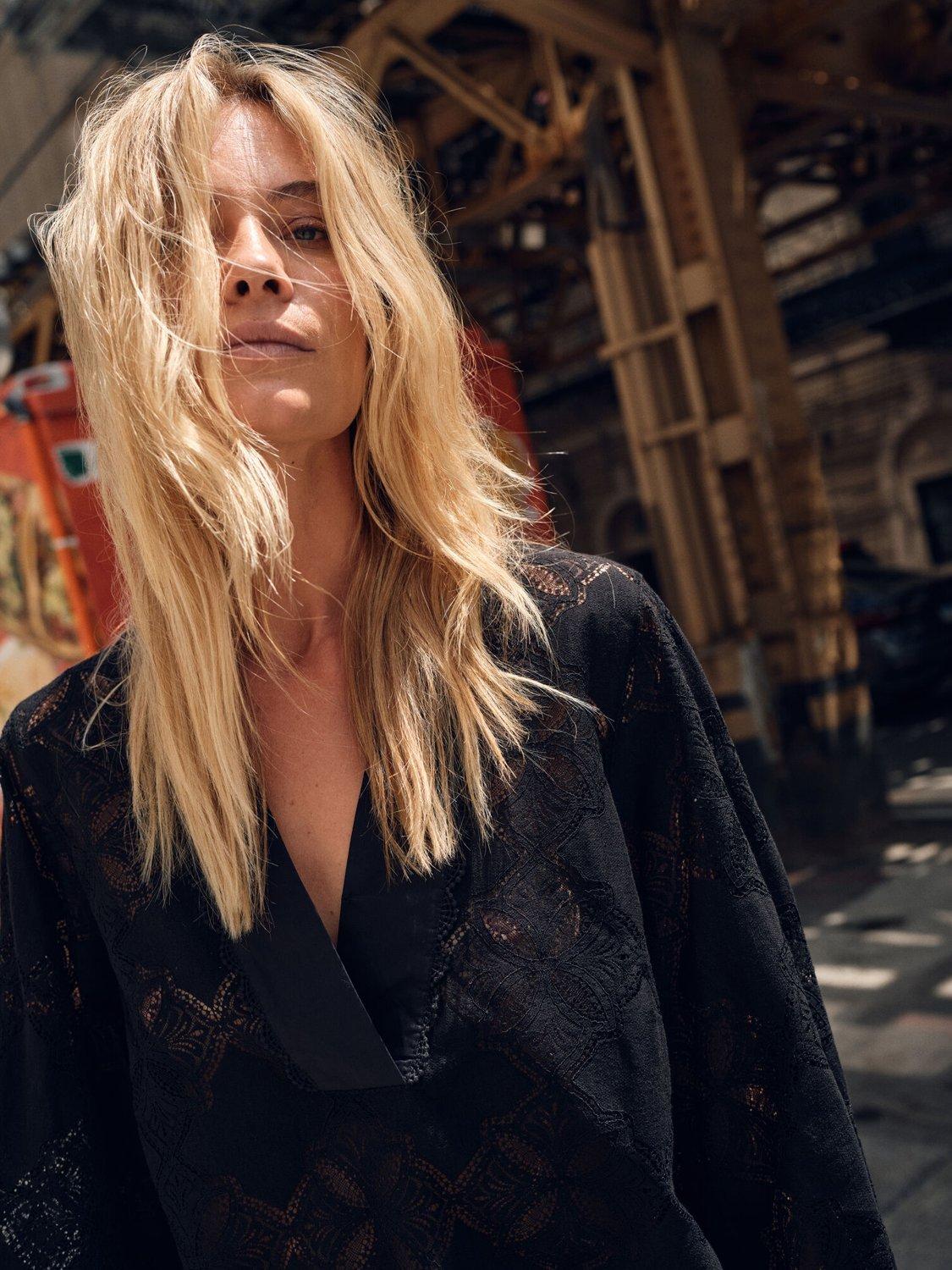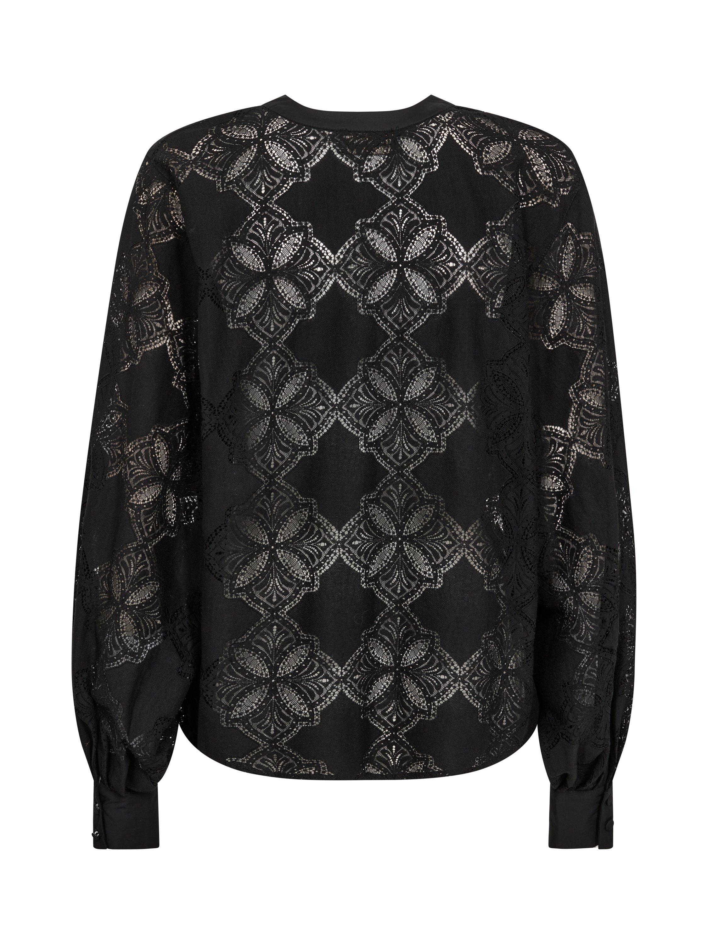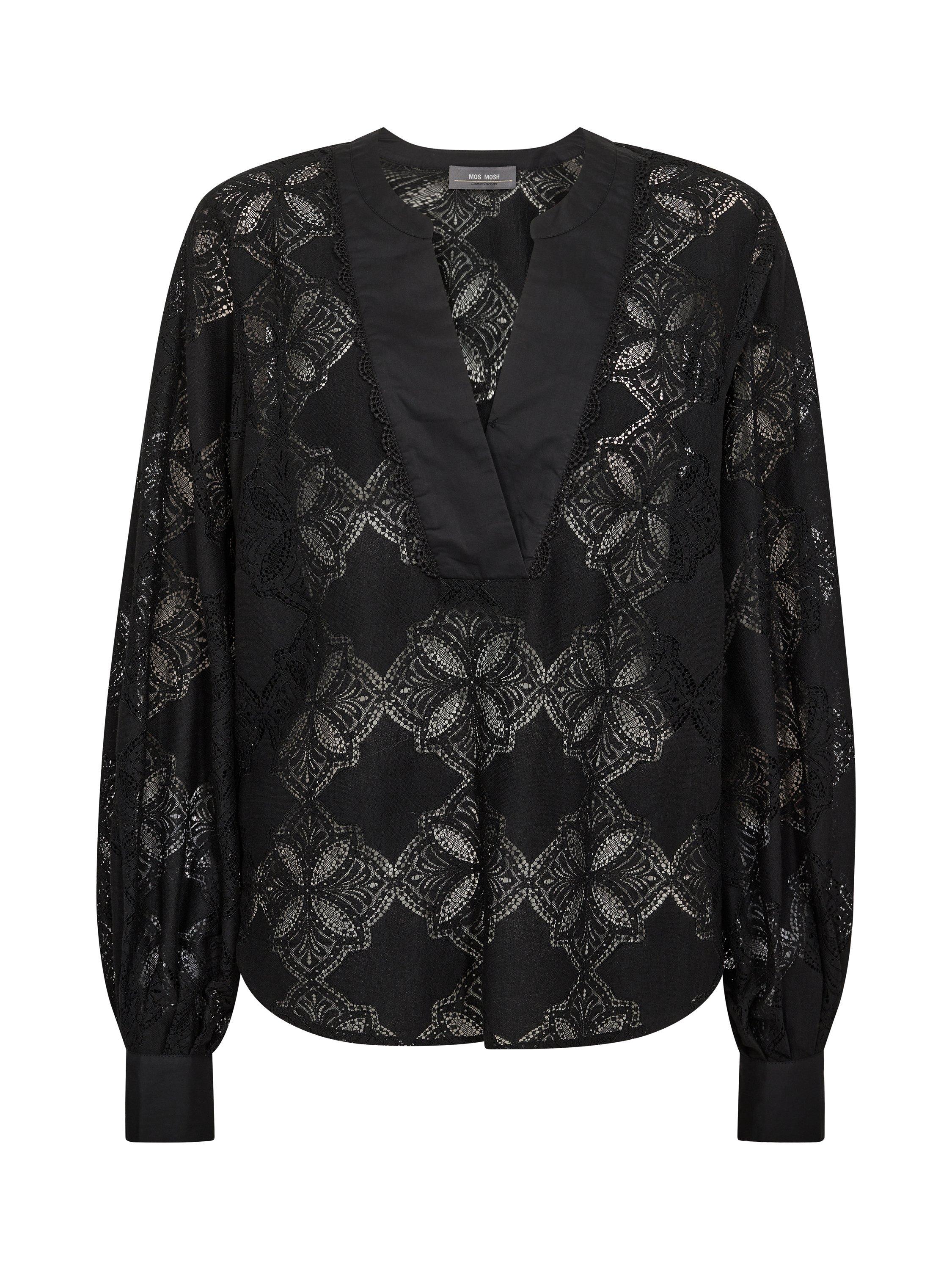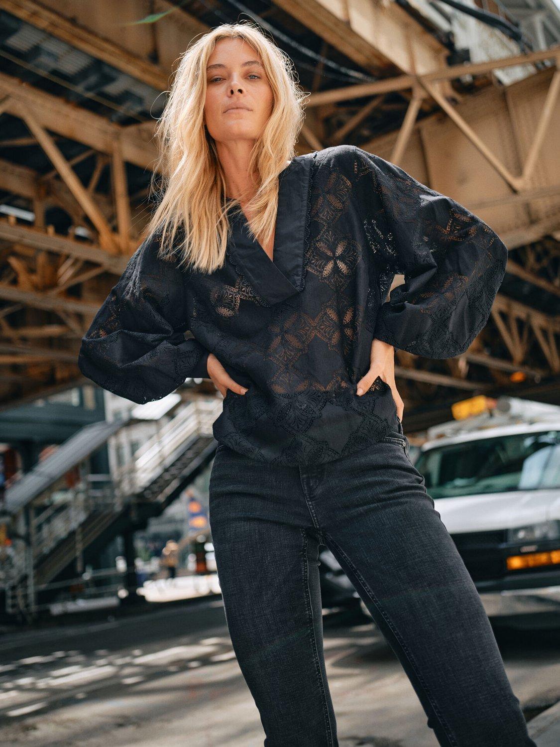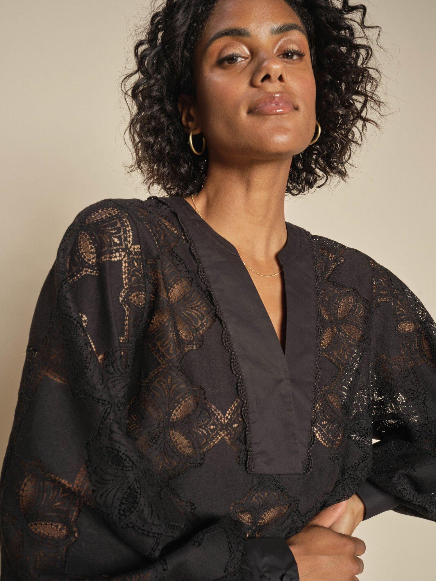 This blouse is made to flatter. It's crafted from a cotton blend in a lace pattern and designed in a slightly loose silhouette with a trendy v-neck. Finished with balloon sleeves and soft pleats at the buttoned cuffs. We like it with high-waisted jeans and sandals.