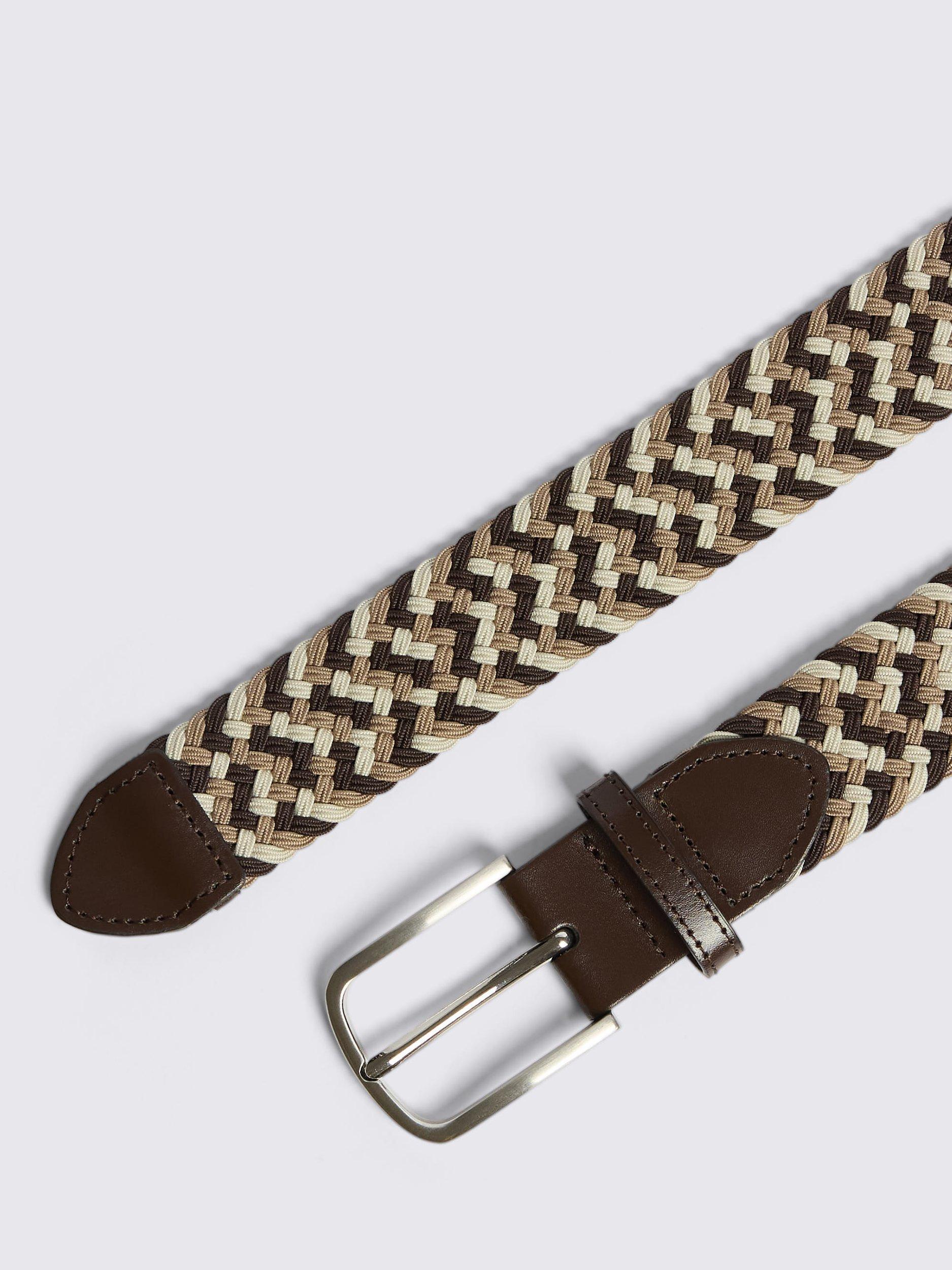 In a neutral multicoloured effect, this Moss belt is woven for stretch and strength that allows you to fasten the pin buckle wherever you choose. Brown leather trims give a refined finish that looks great with jeans or chinos.