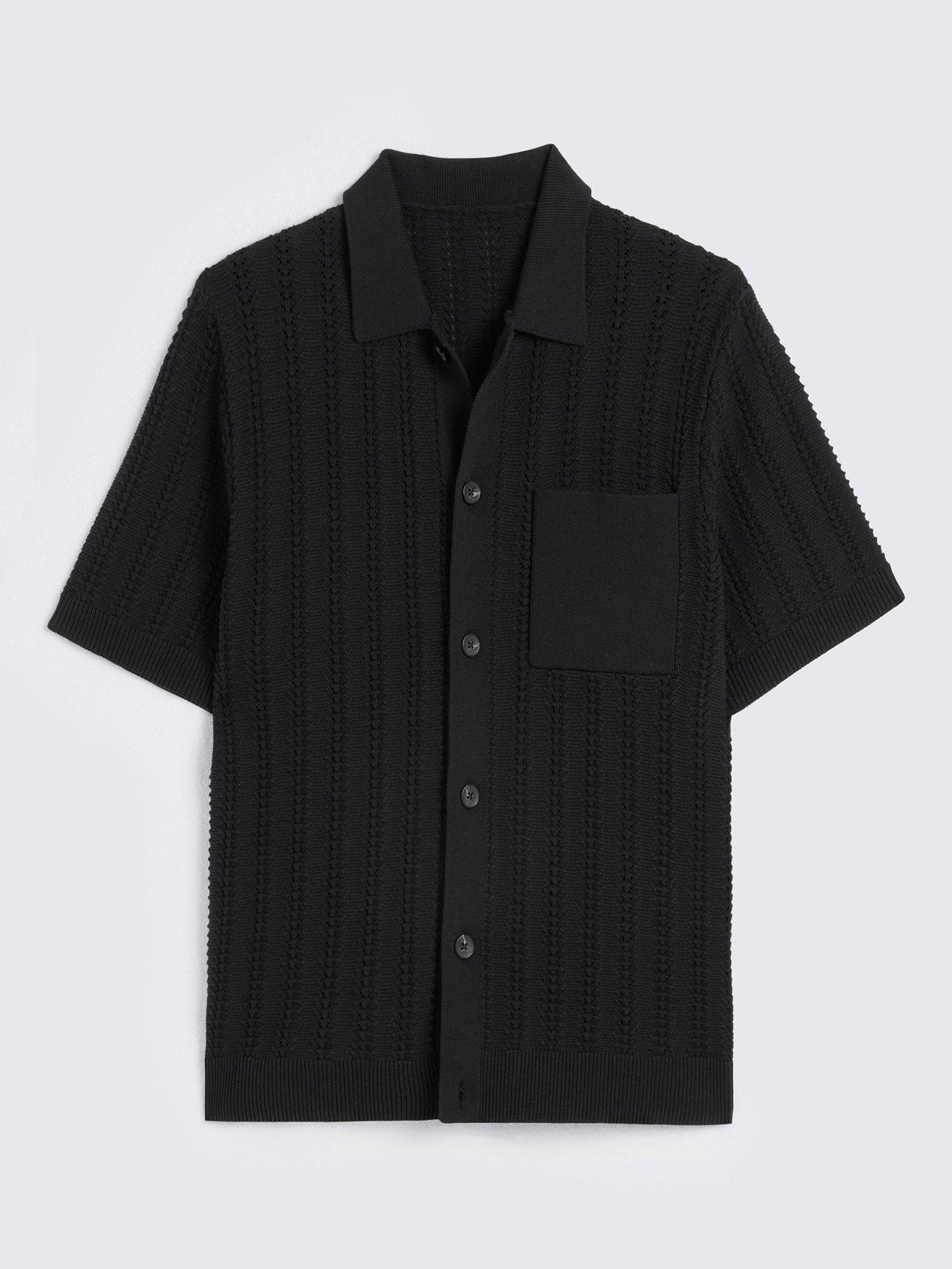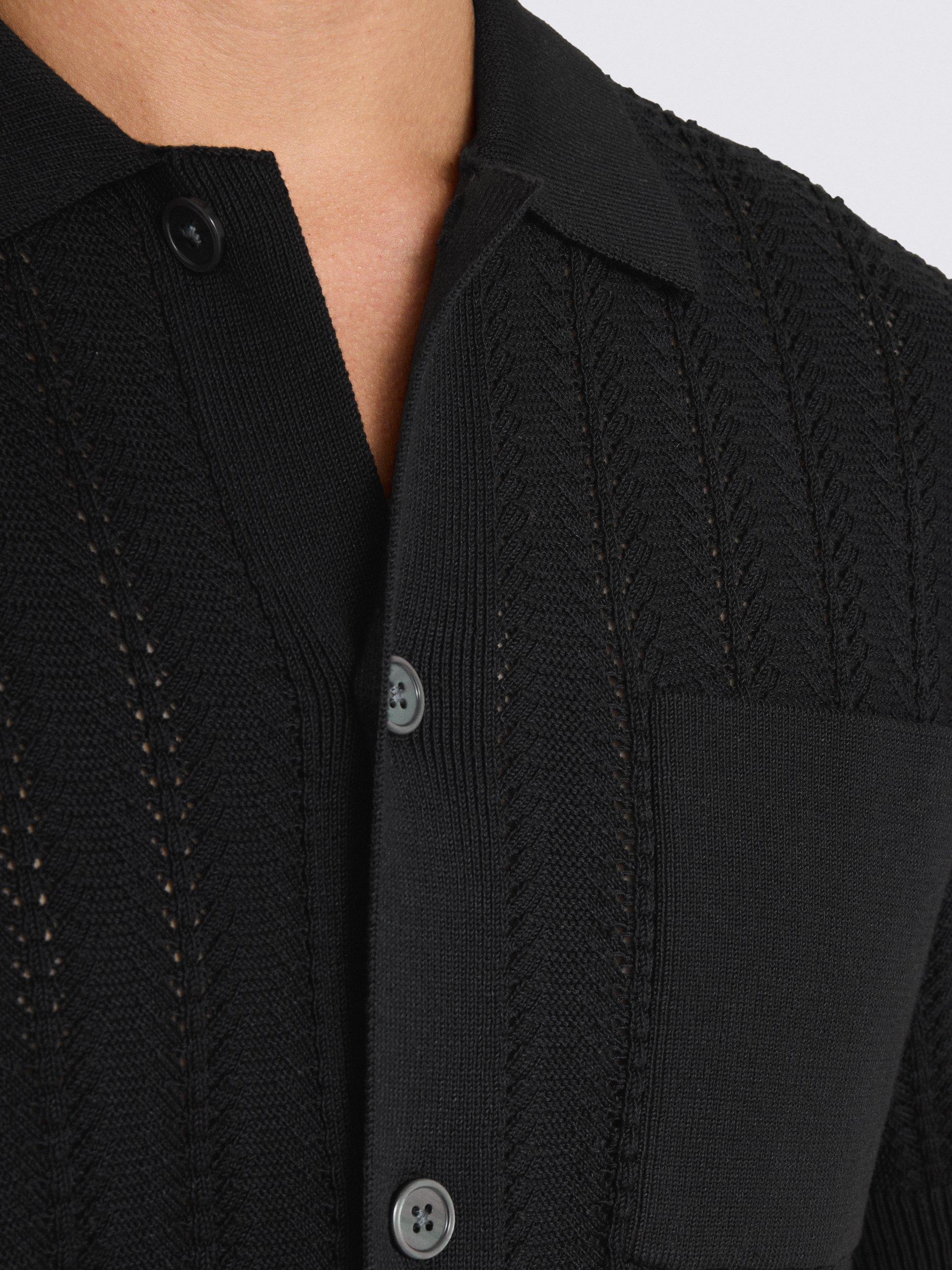 A knitted shirt is a wardrobe essential this season, so invest in the airy design of Moss' short-sleeved take. They created it in a soft cotton-blend yarn with a chevron pointelle structure that lets air pass through for fresh comfort in warmer weather.