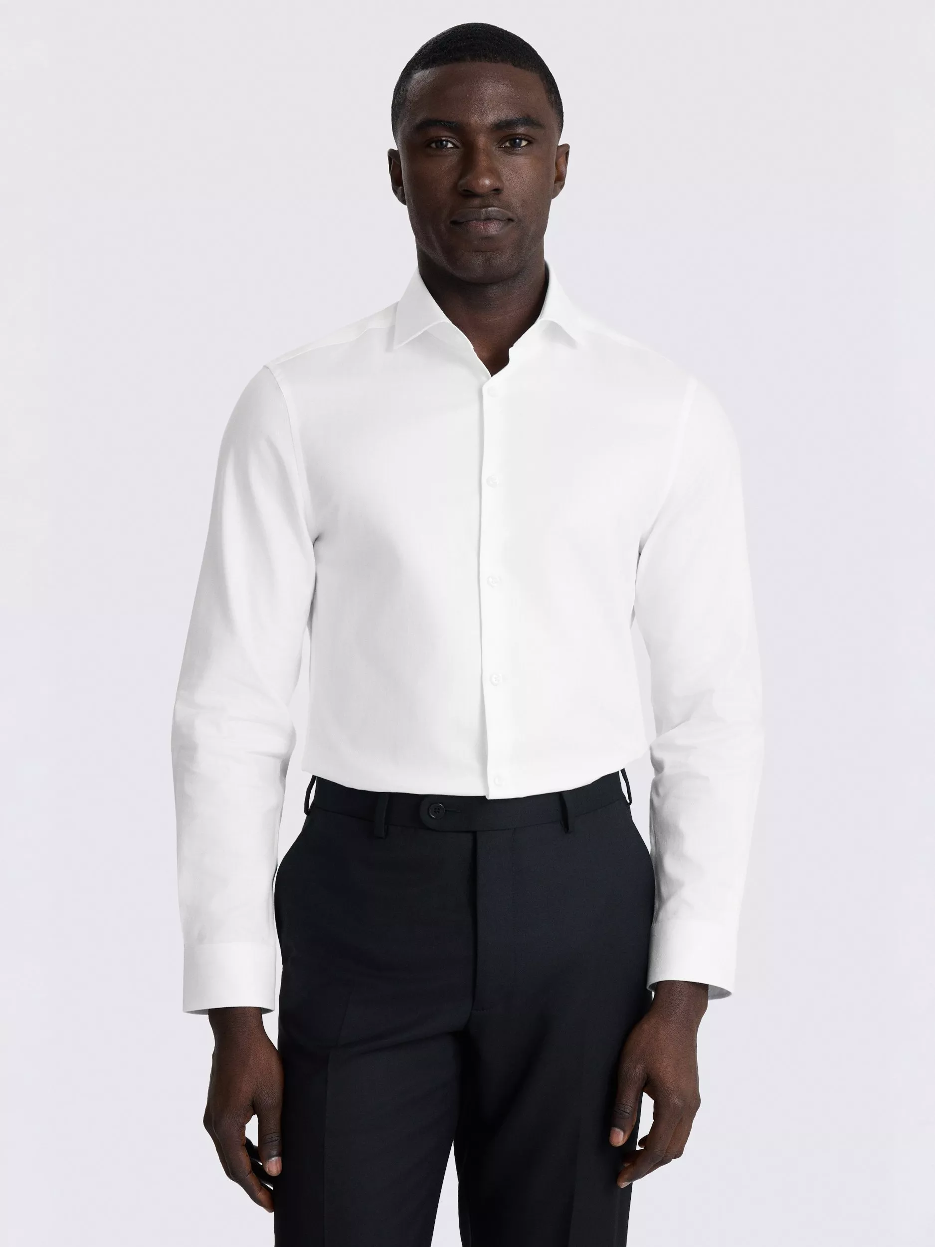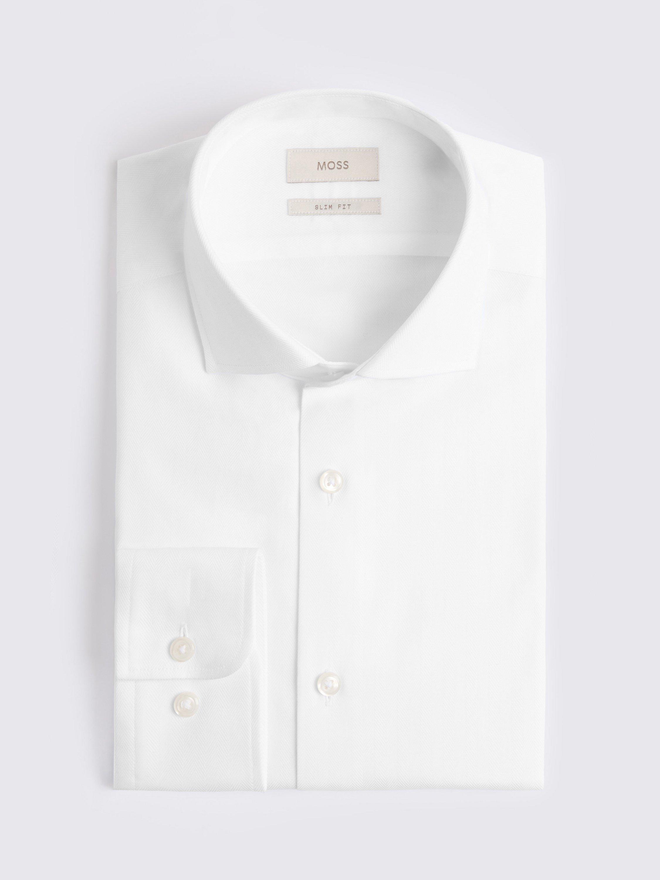 With its herringbone weave and matte finish, this white shirt is a strong pick for occasion dressing. It's cut to a slim fit in 100% cotton for comfort, with added easy-iron technology to ensure an impeccably smooth surface that lasts. Taped seams help reinforce the clean profile.