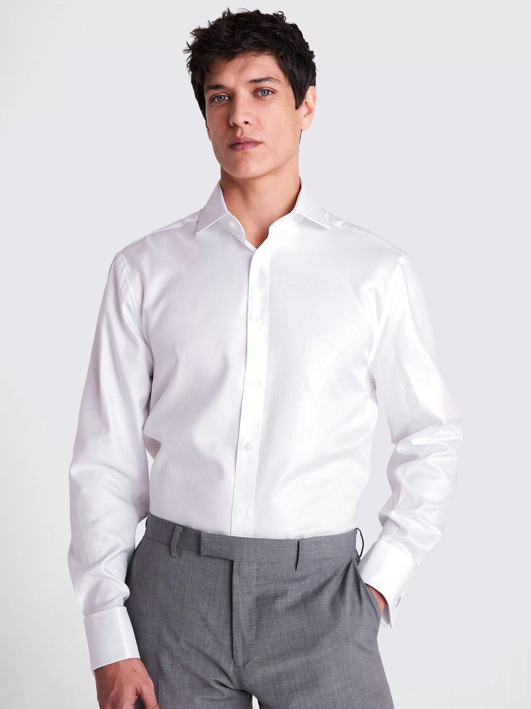 Cut to a regular fit in pure cotton with a twill structure and subtle sheen, Moss' long-sleeved white shirt is a great foundation for everything from workwear to special-occasion looks. It's topped with a cutaway collar and features double cuffs so you can add some links for personality.