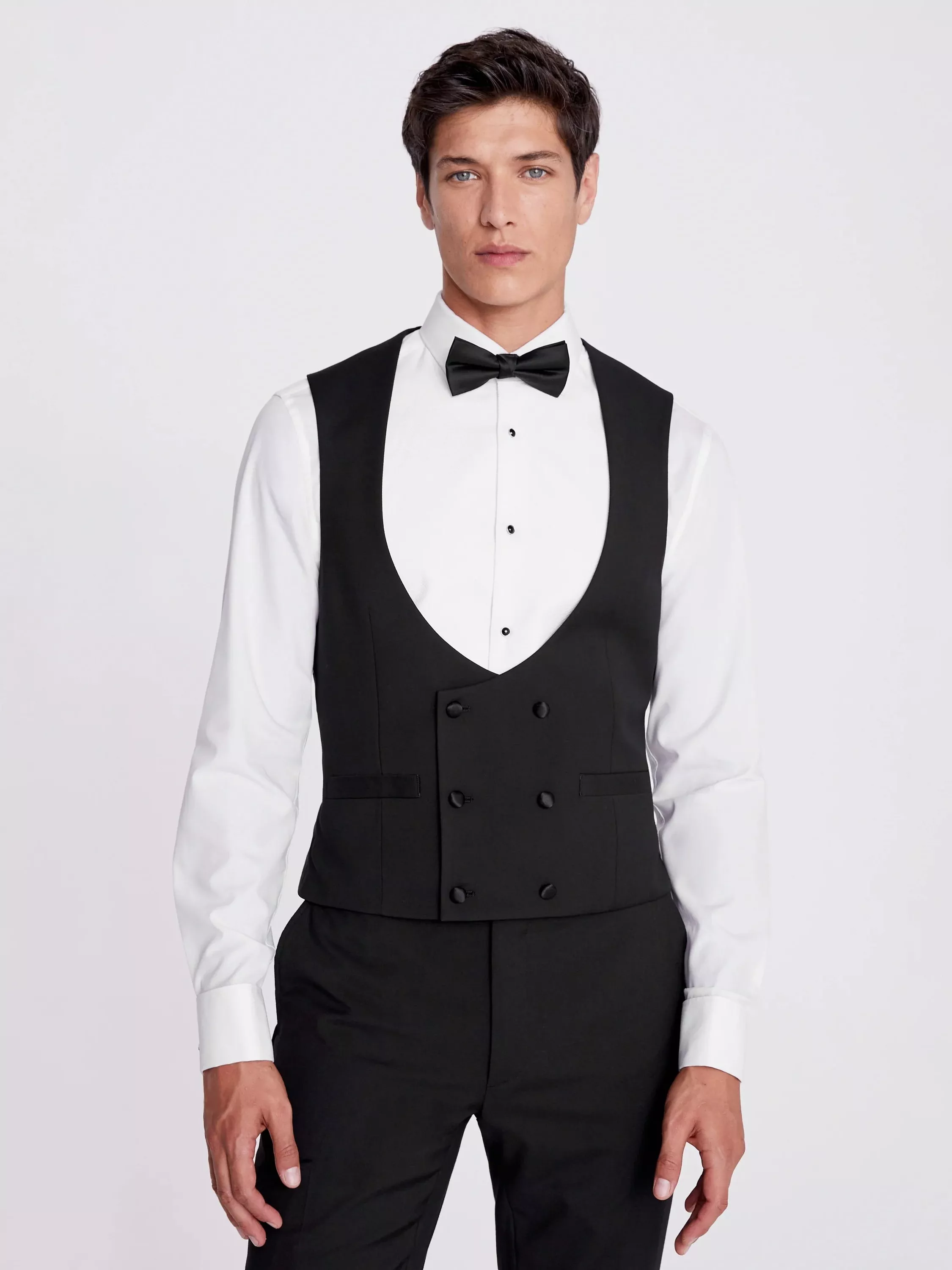 To elevate a black-tie look, opt for a double-breasted waistcoat for standout style. This slim-fit version features a contemporary horseshoe cut, expertly trimmed with satin, designed to reveal more of your chosen dress shirt. Try pairing it with a Marcella weave shirt to introduce subtle texture against the smooth structure of the cloth. This considered choice adds depth and an unmistakable sophistication to formal dressing.
