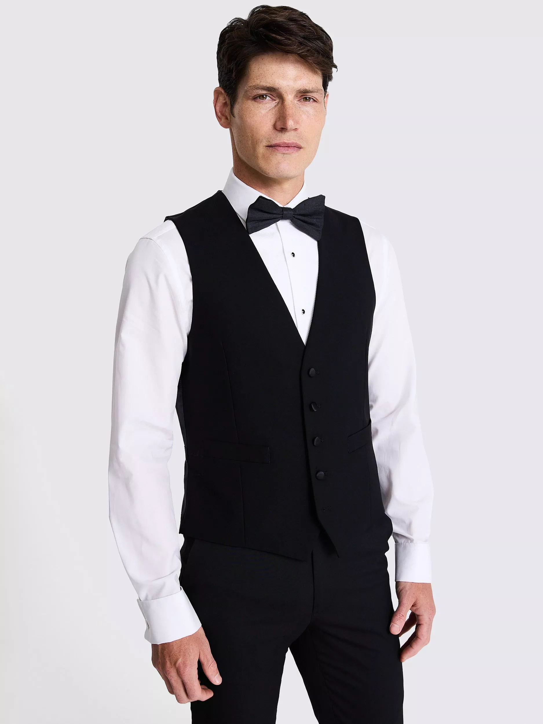 Offering sharp lines and a frame-defining structure, a well-cut black waistcoat is highly prized by great dressers - with good reason. Moss's tailored-fit design is kept classic with its pure-wool construction, tonal backing and covered buttons. Formal all the way, it will look the part styled simply with a white shirt and black trousers, or you can build it into a three-piece to hit that dress code just right.