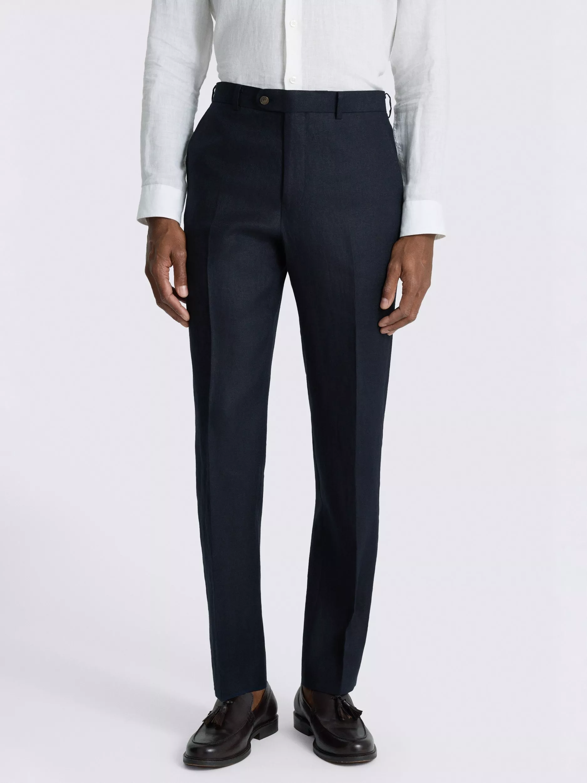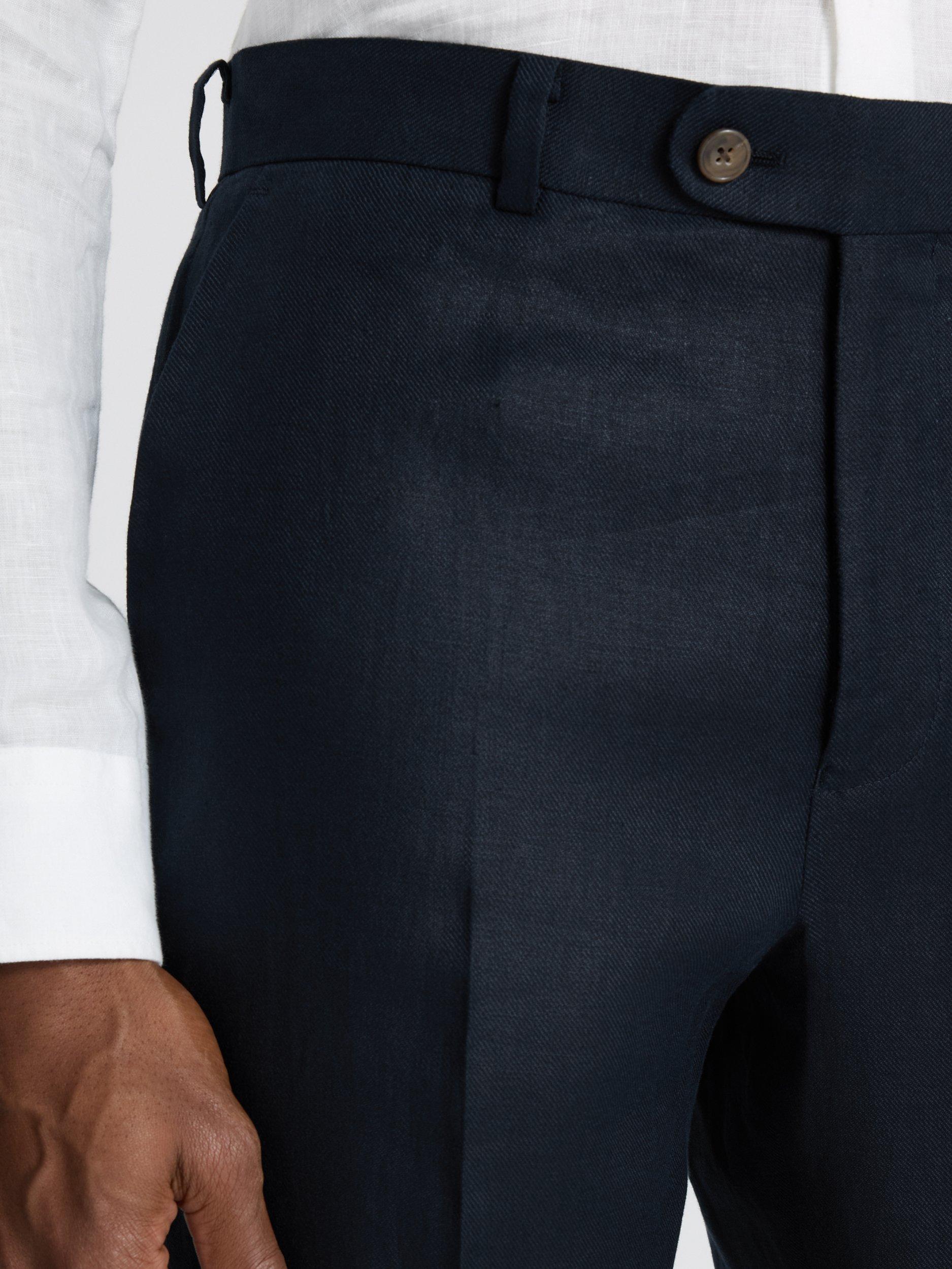 With their regular fit and soft, breathable linen, these trousers are a great base for all manner of special events. The navy tone is easy to style, while a rounded waistband extension adds a clean finish.