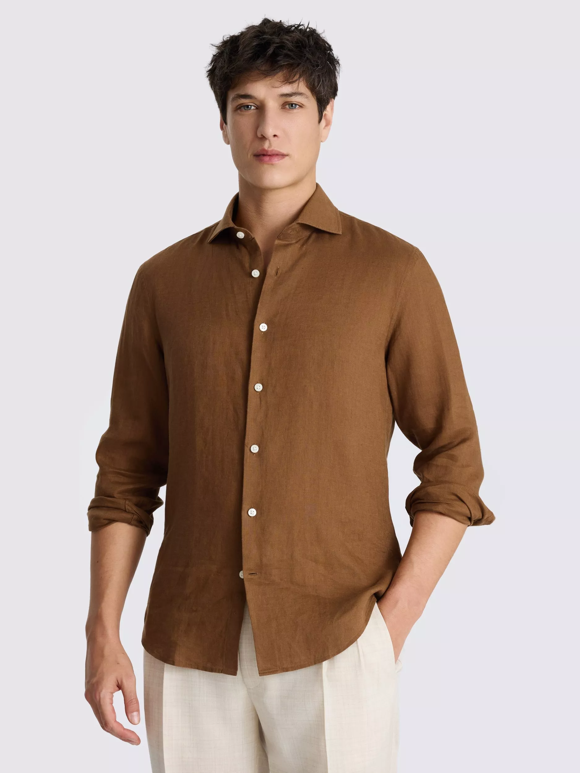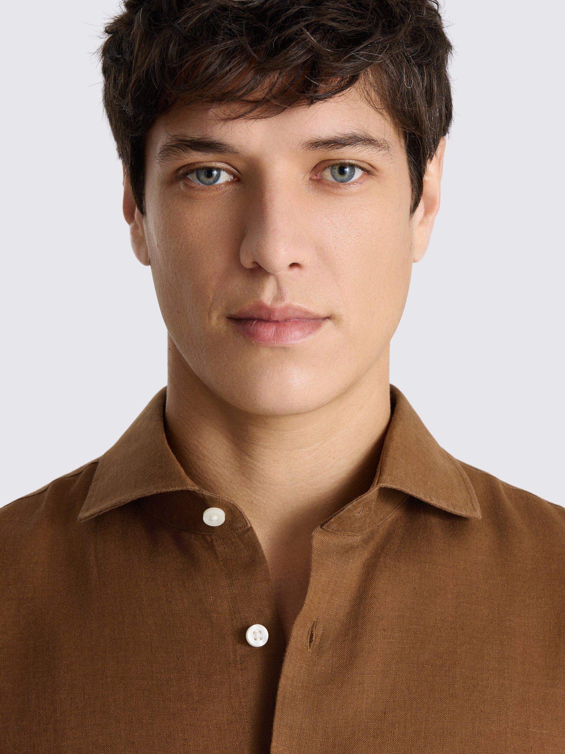 Linen's light, cool, but still smart profile makes it ideal for a spring and summer wardrobe. This shirt from Moss has a classic collar and seven-button pocketless frontage.