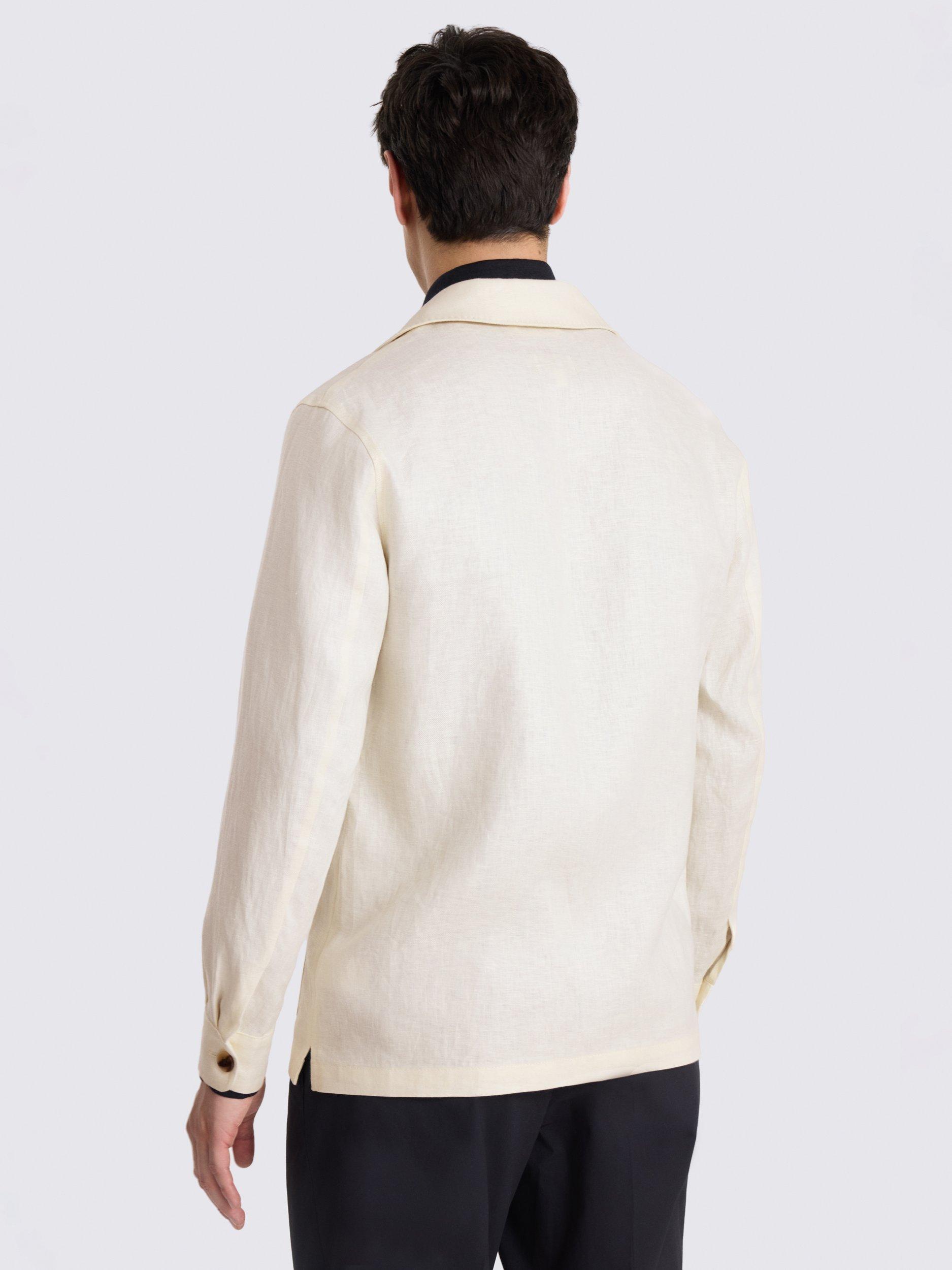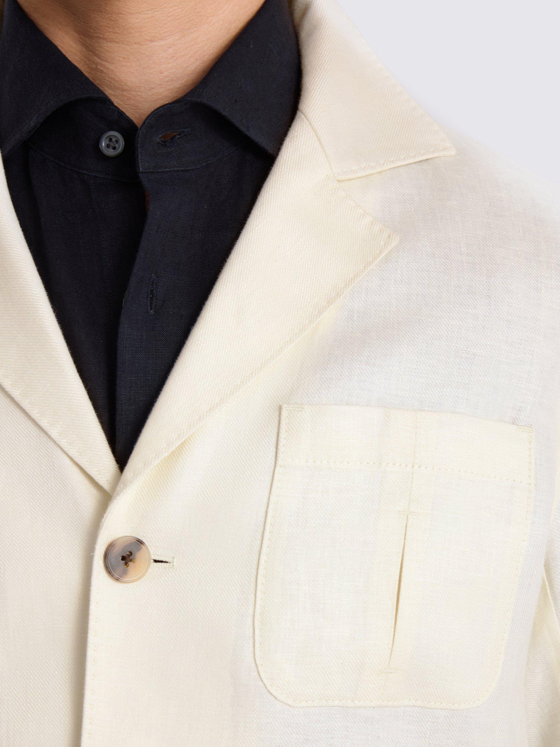 It's crafted from 100% linen - a fibre that has a natural hollowness for the best airflow and cooling comfort. It's also left unlined so you can fully enjoy those natural benefits, adding pleated pockets and patterned buttons for a classic finish.