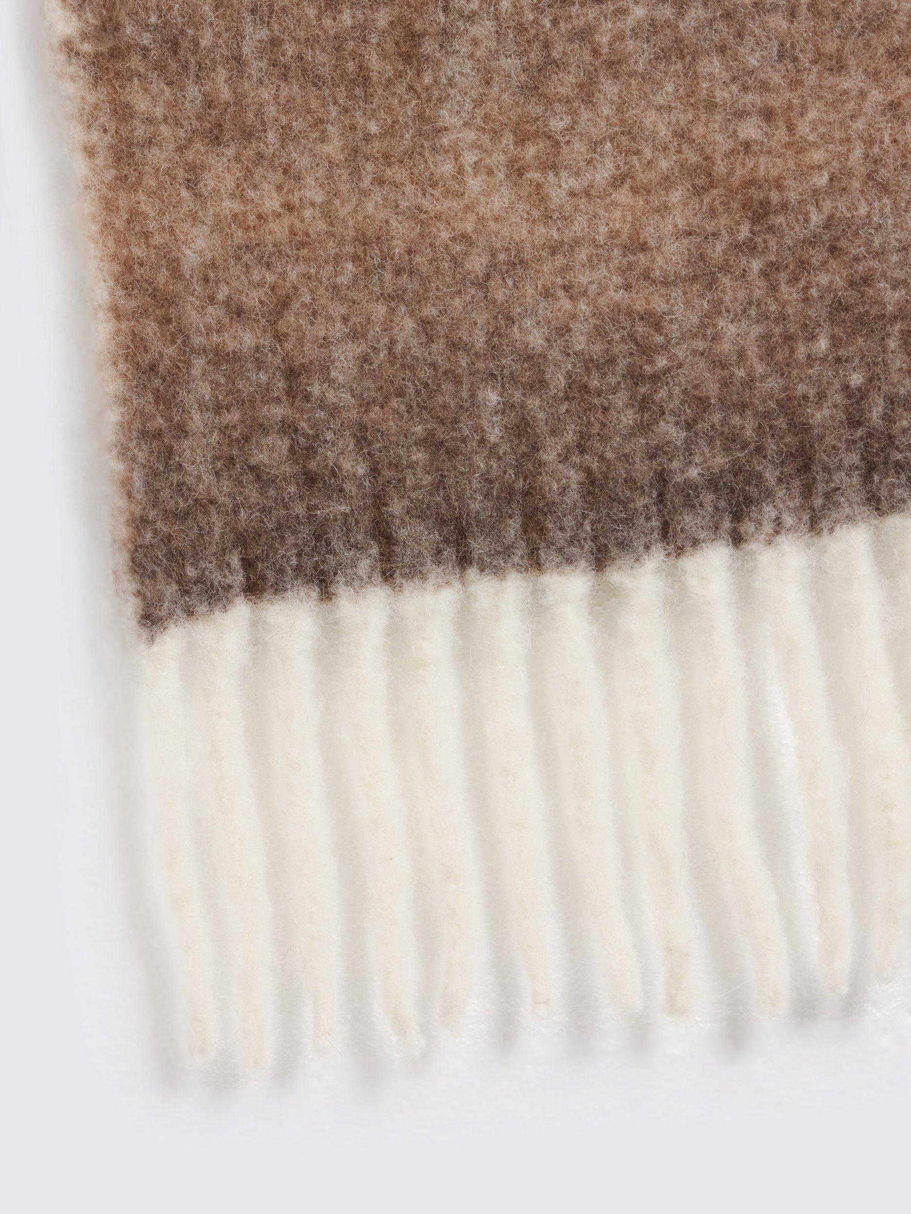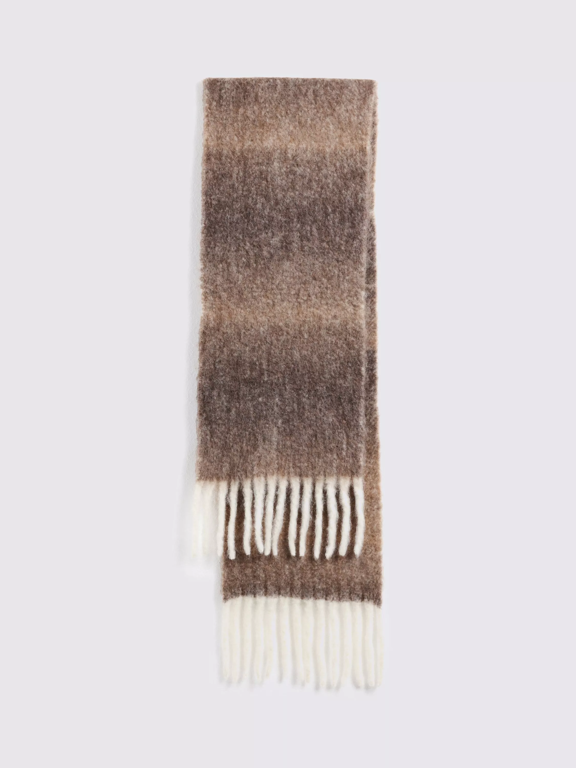 An oversized ombré scarf with contrast fringing that offers up a welcome contrast.