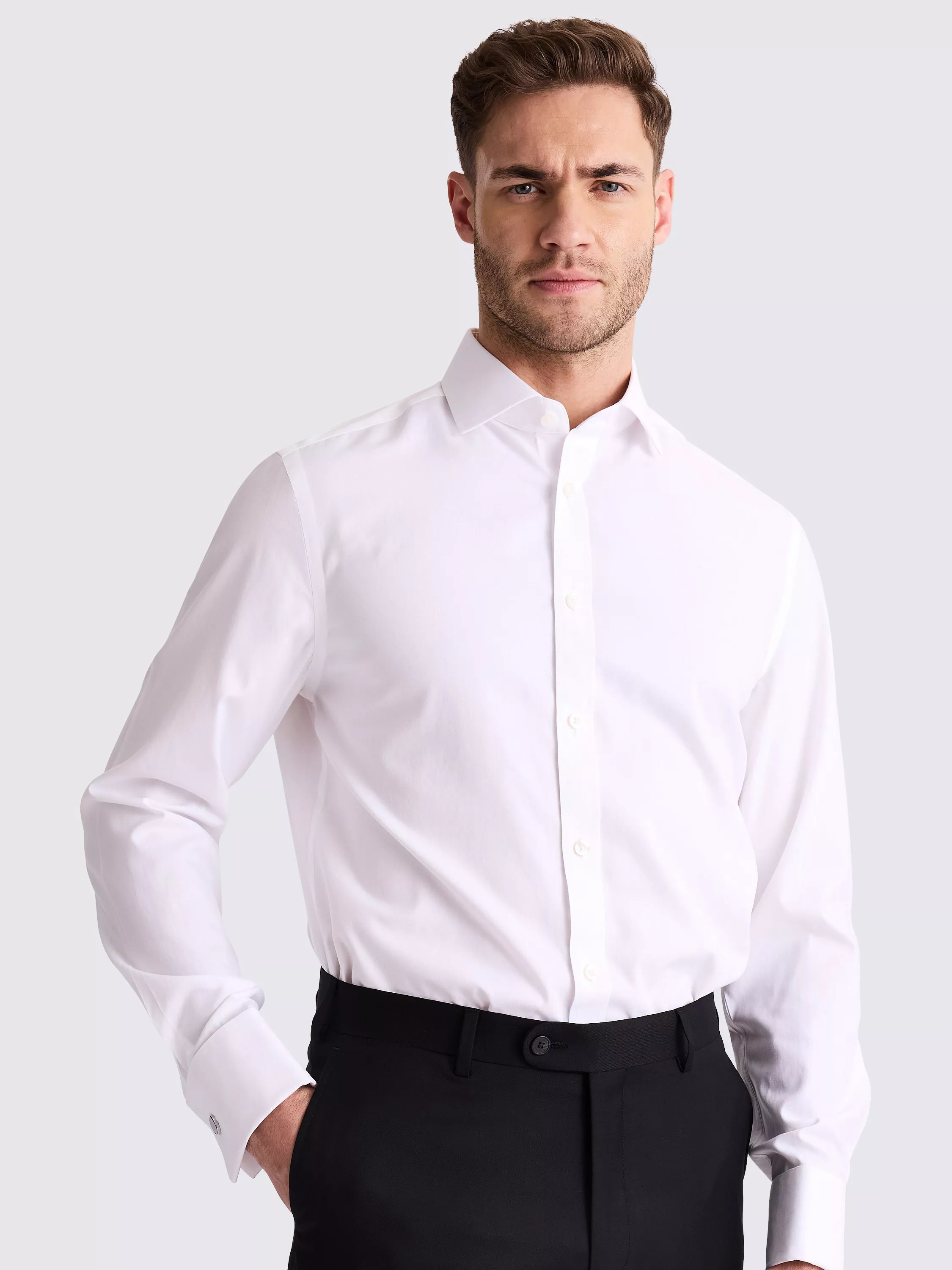 Give your formal options a reboot with this tailored-fit white shirt, finished with double cuffs so you can personalise with your favourite links. Cut in sustainable cotton with a pinpoint weave and clean taped seams, curing the whole piece with a non-iron finish for wrinkle-free smoothness that lasts.