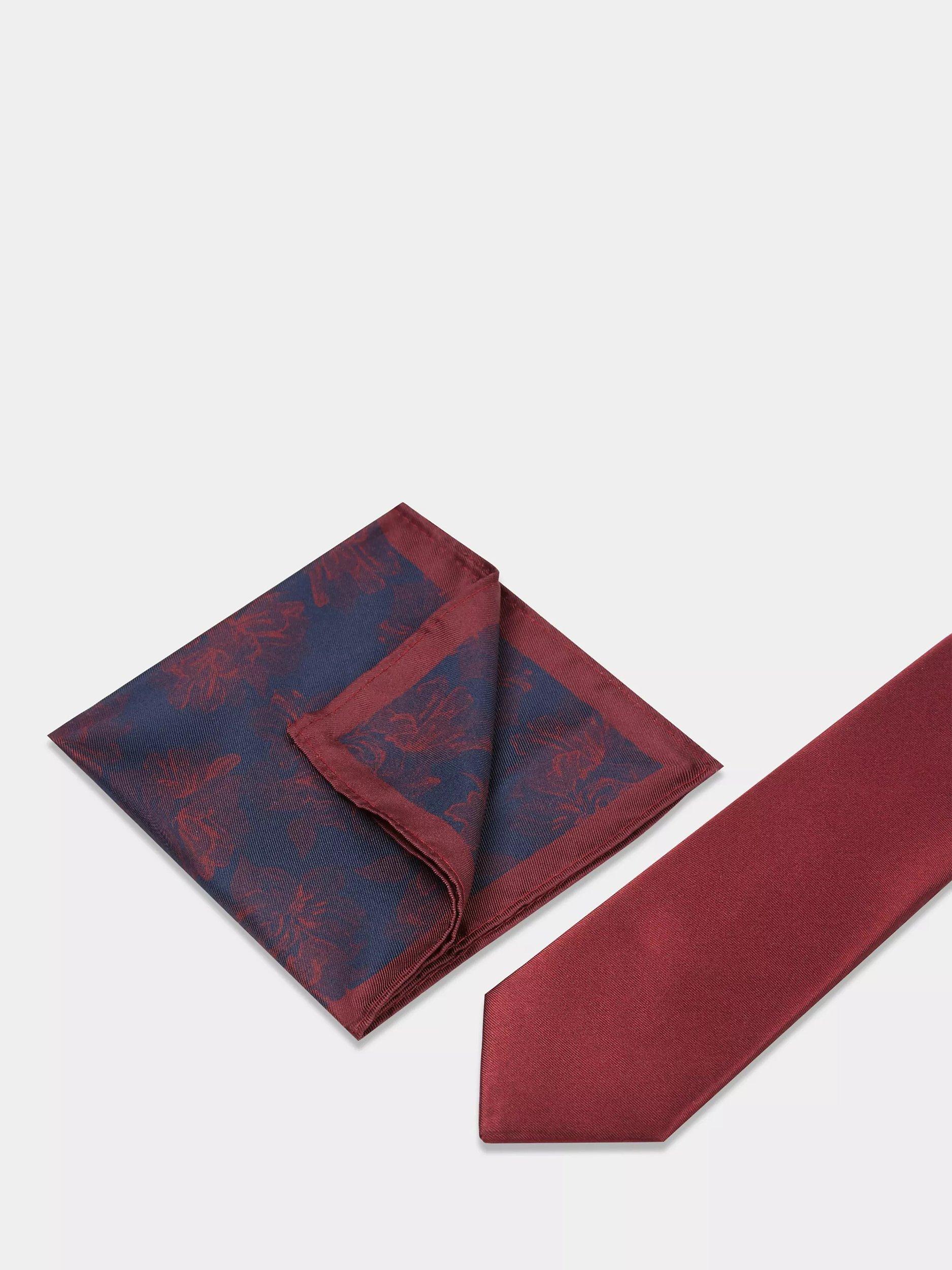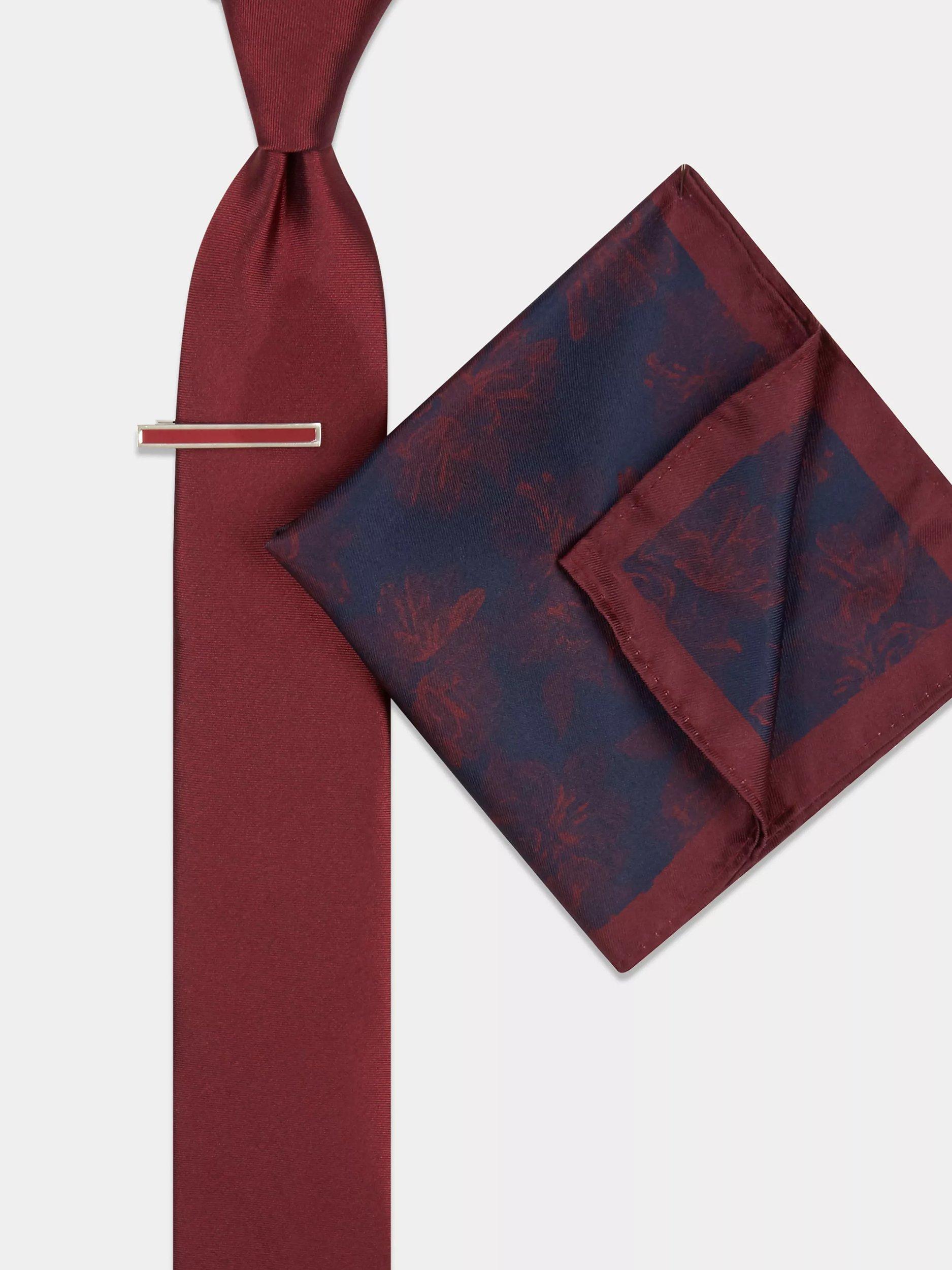MossPlain Tie With Bar & Pocket Square Set, Wine/Navy