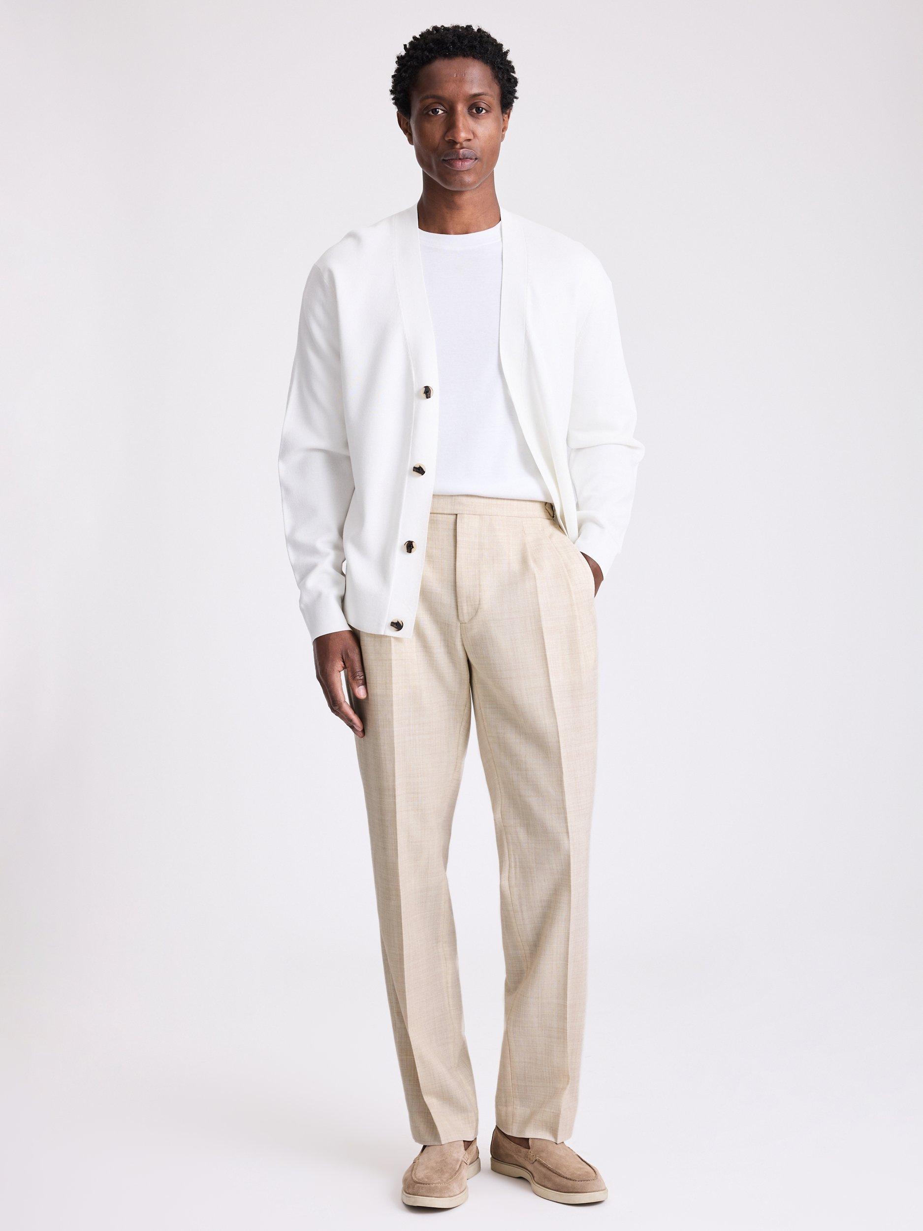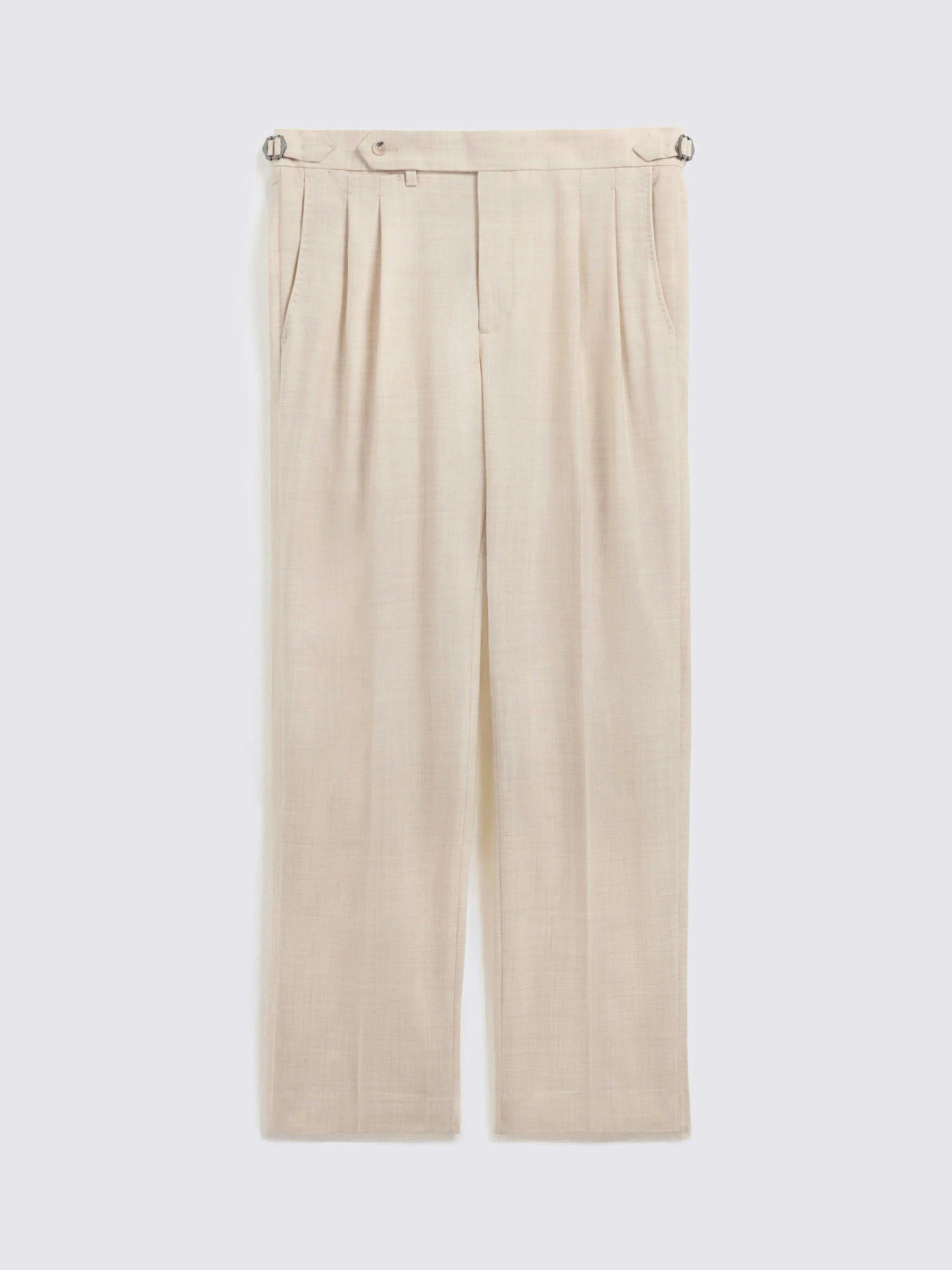 Crafted in 100% wool for a soft, breathable feel, these trousers serve as a versatile foundation for various dress codes. The front pleats and side adjusters add sartorial touches for modern styling.