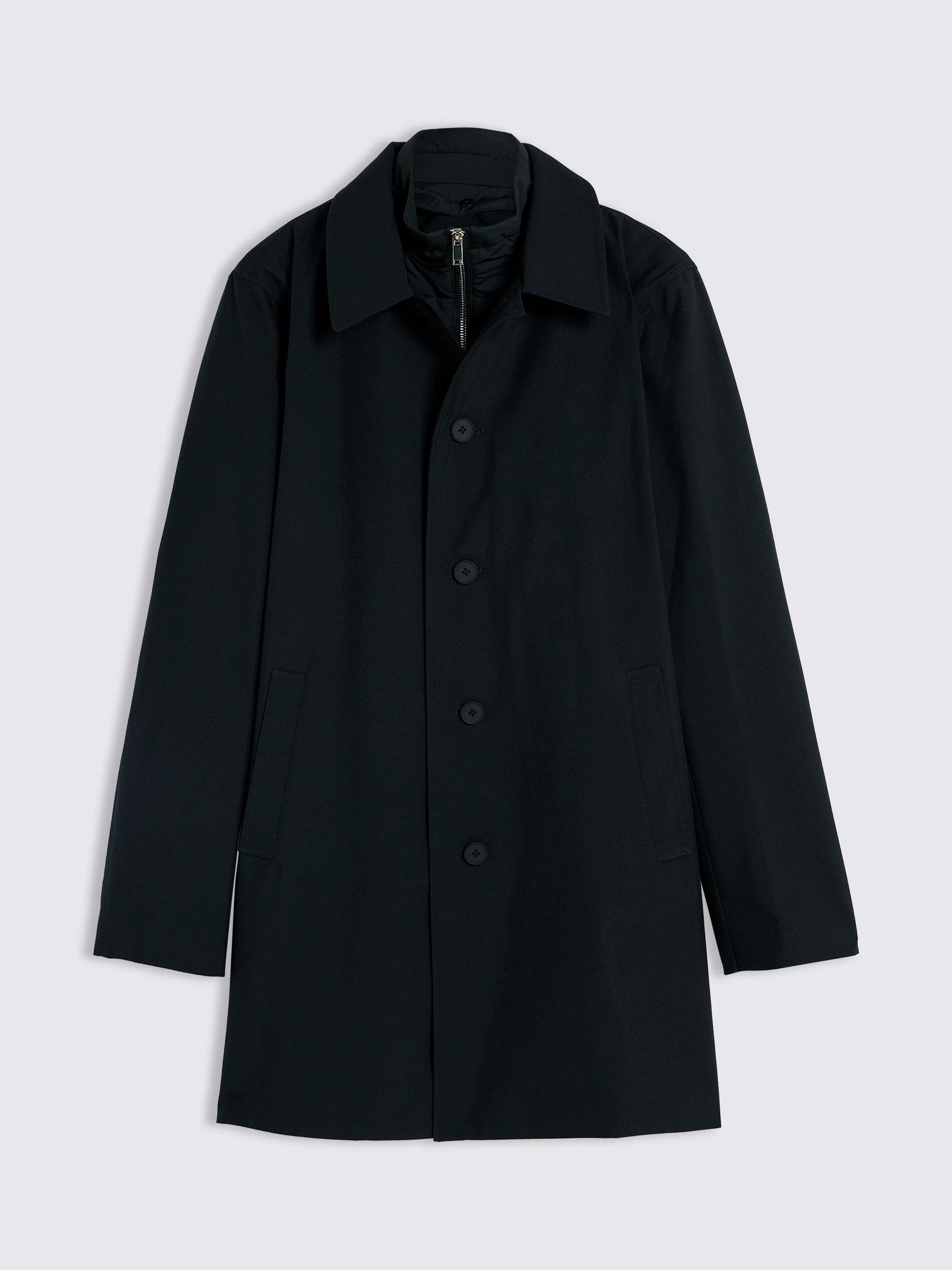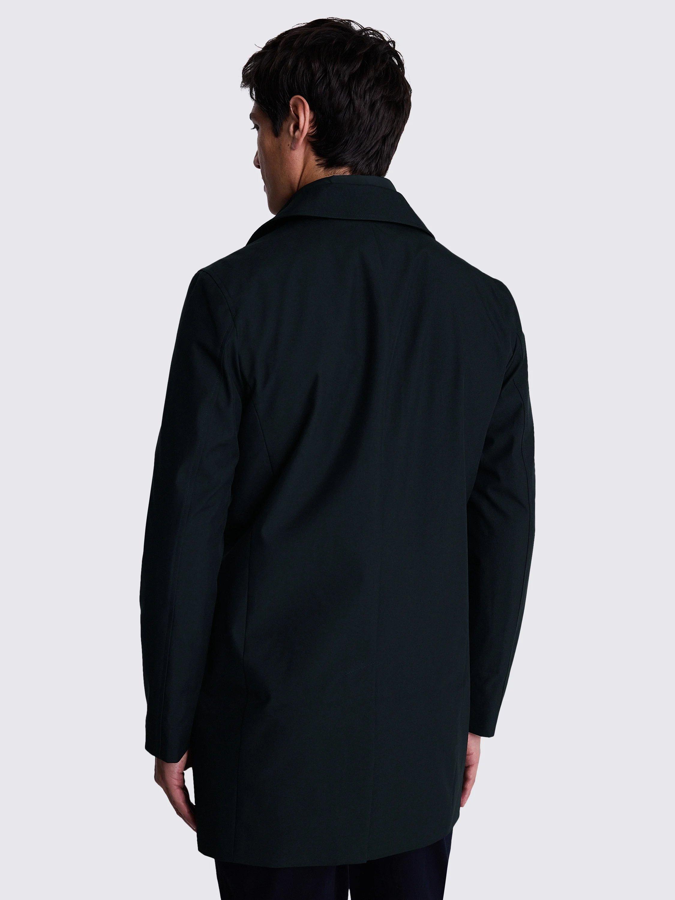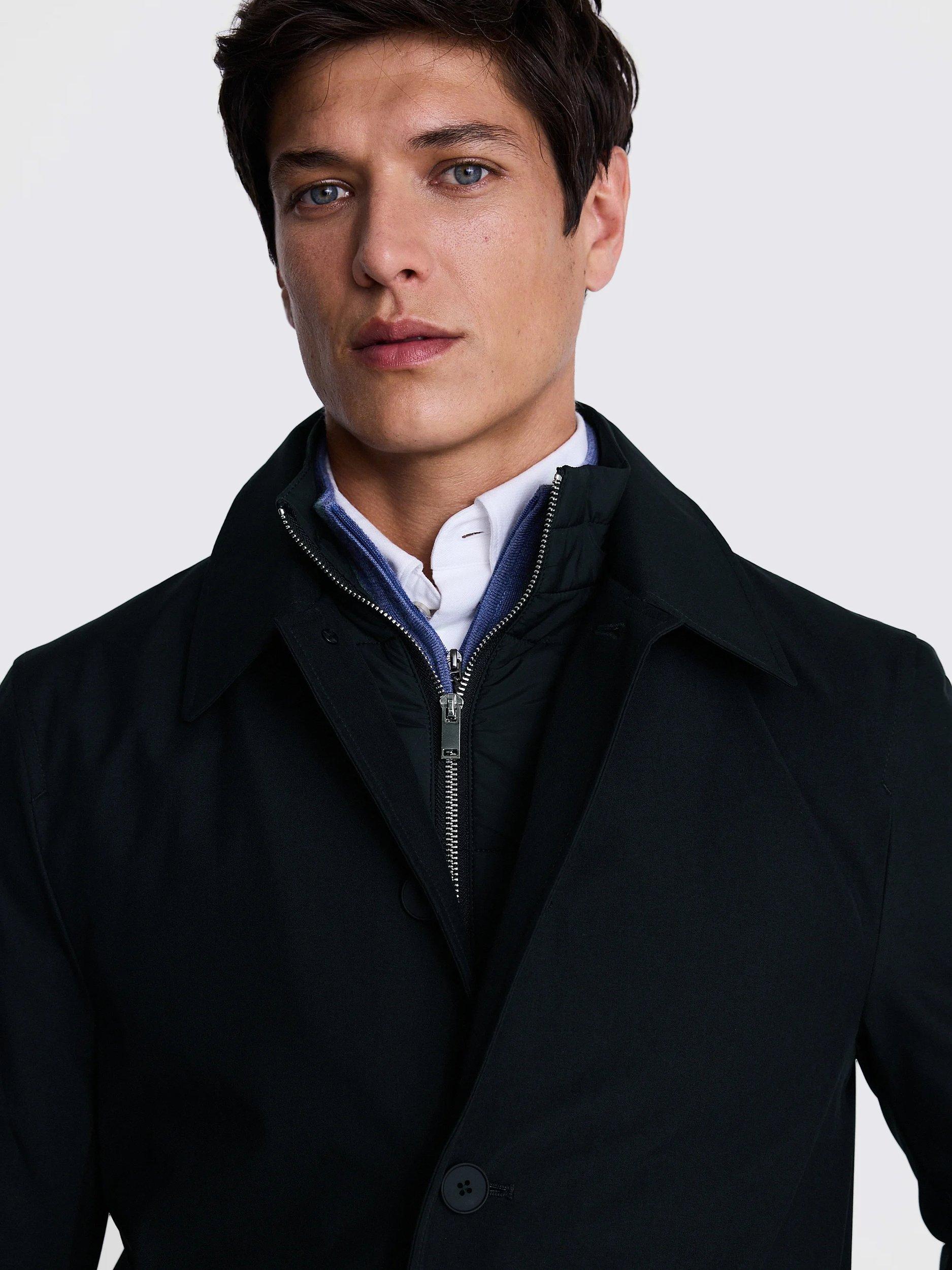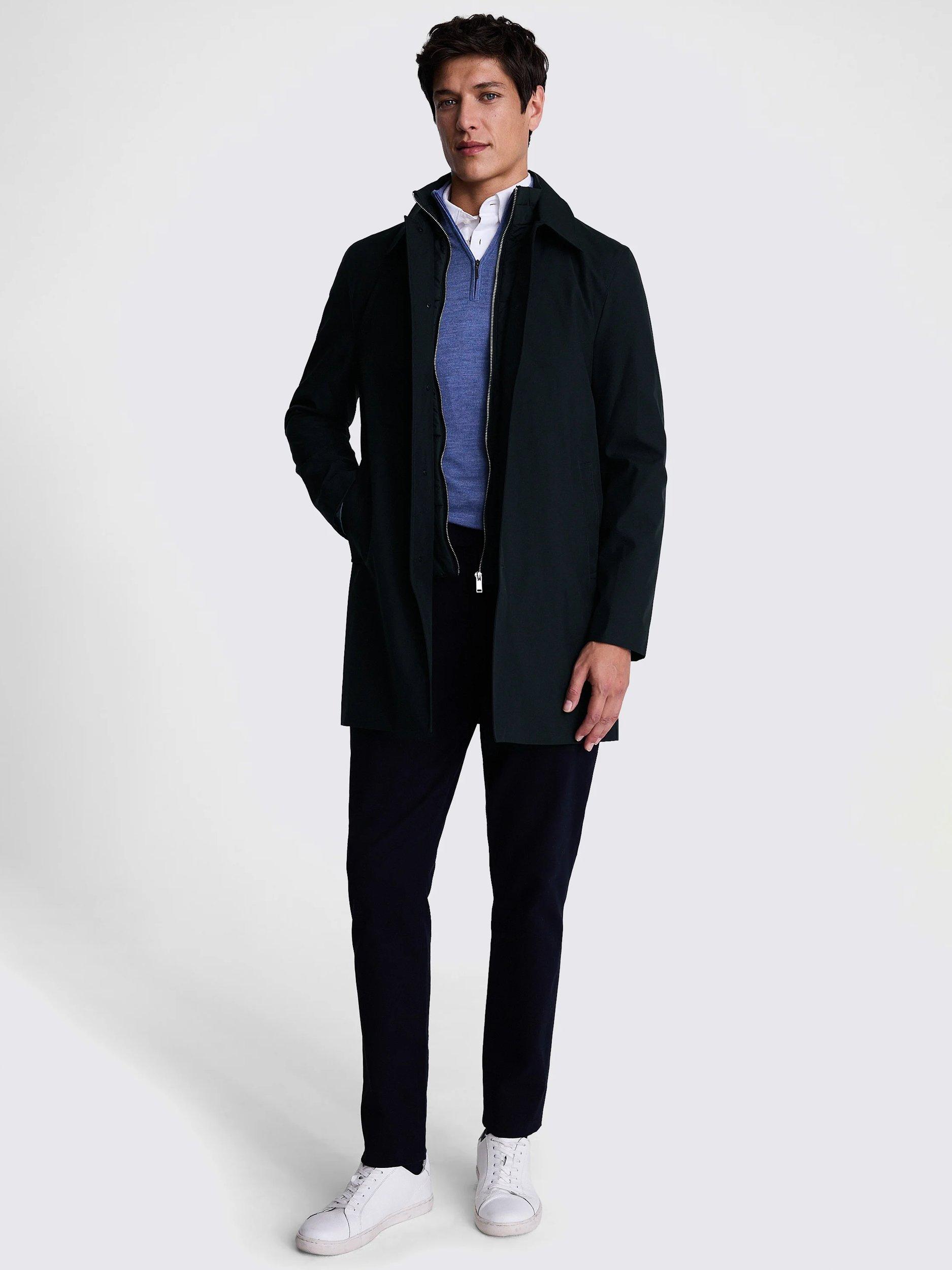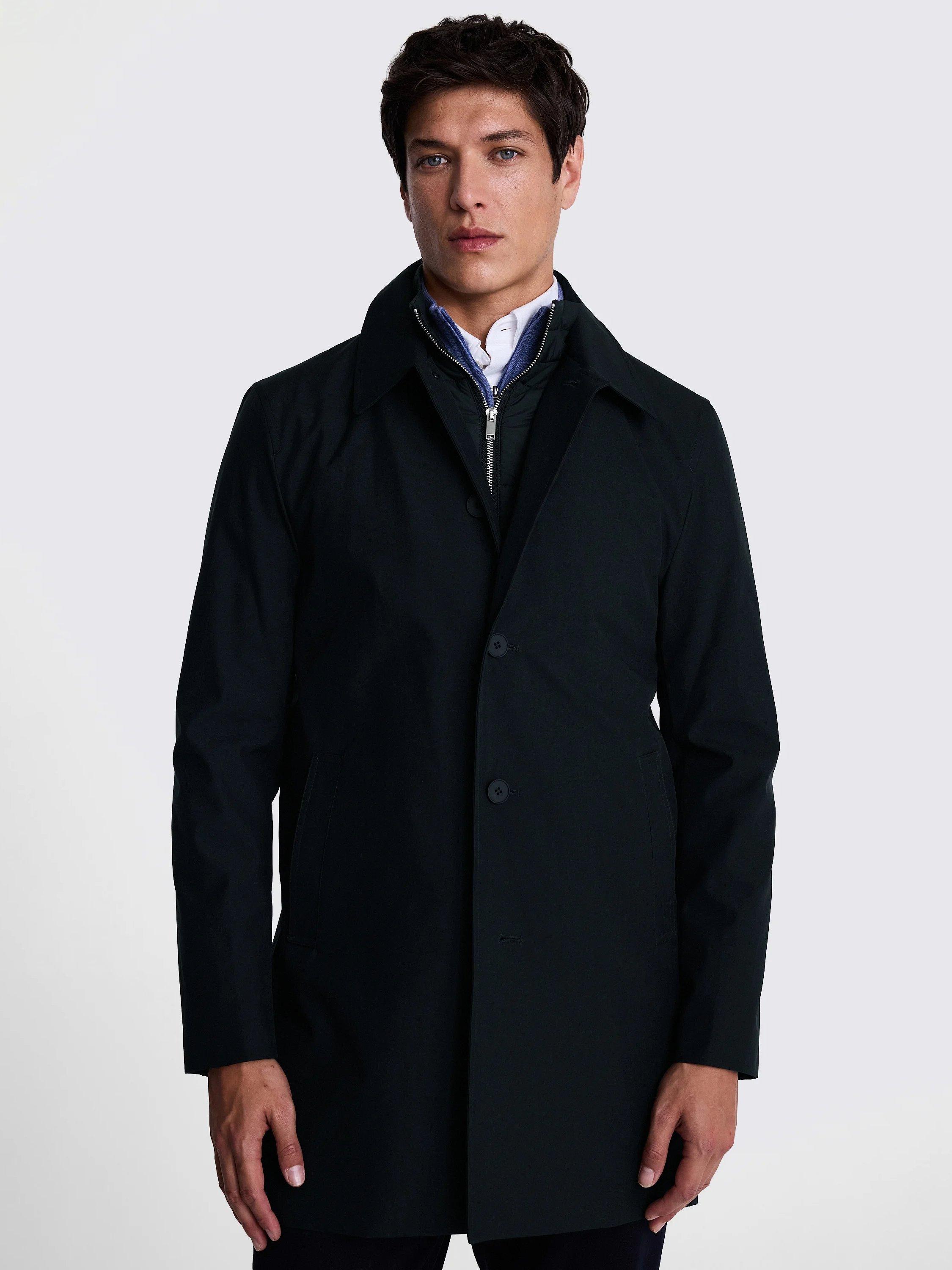 When you can't rely on the weather, you need outerwear that won't let you down. This classic navy raincoat comes complete with a zip-in insert for a layered effect. The technical showerproof fabric has a great drape that's emphasised by a slim fit, while tonal rubberised buttons give it sporty edge.