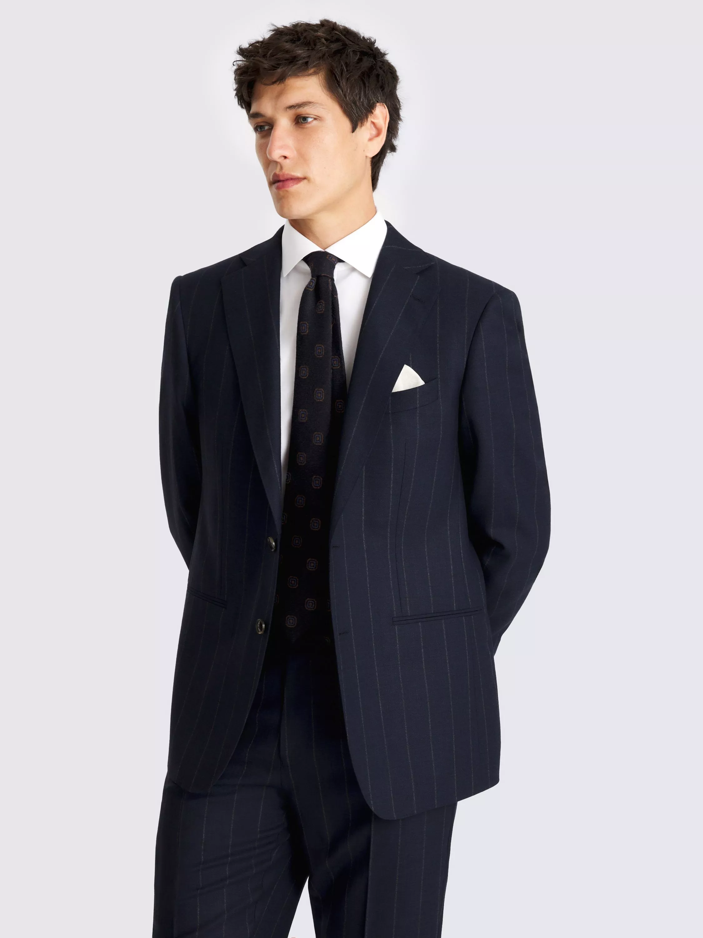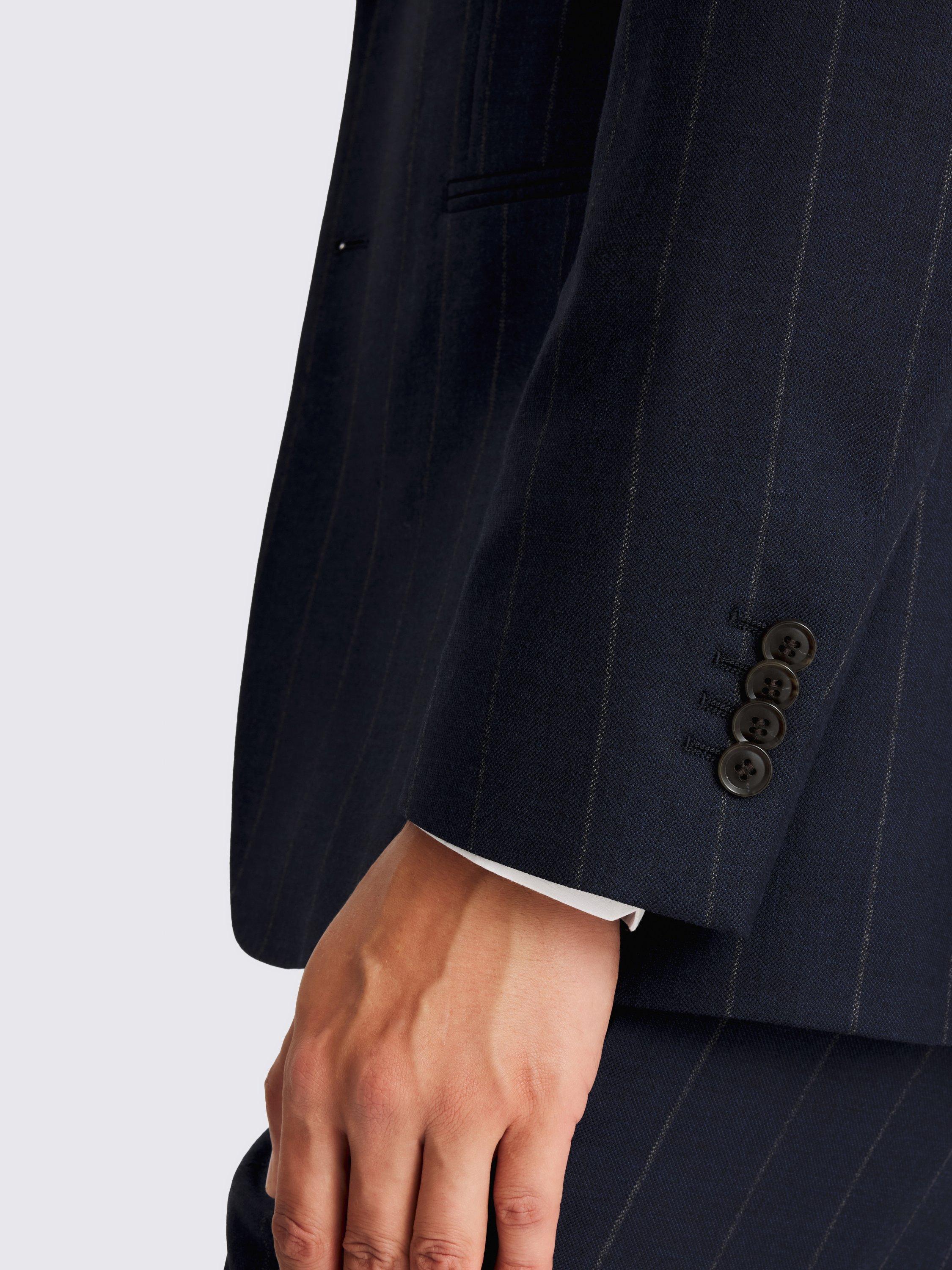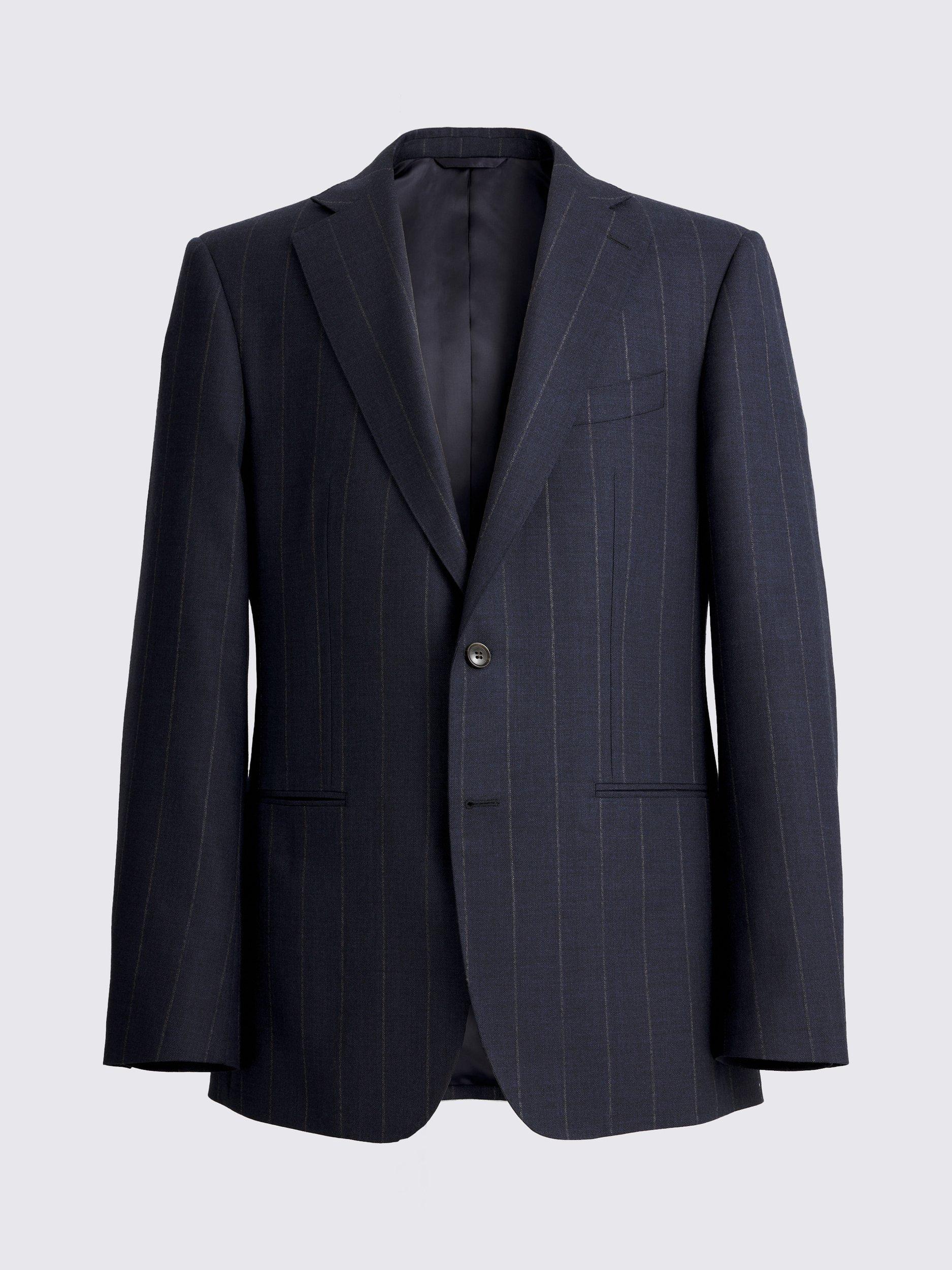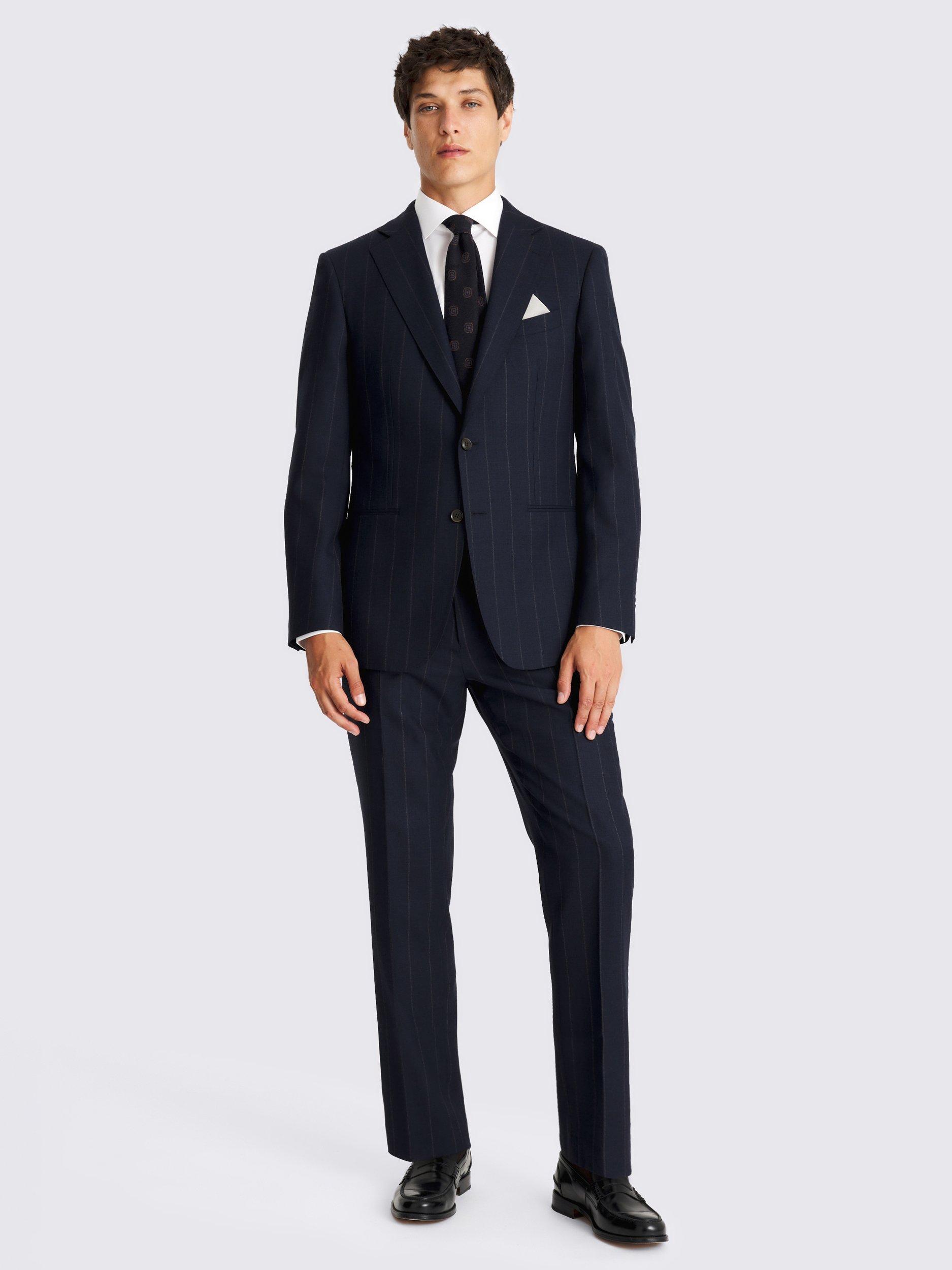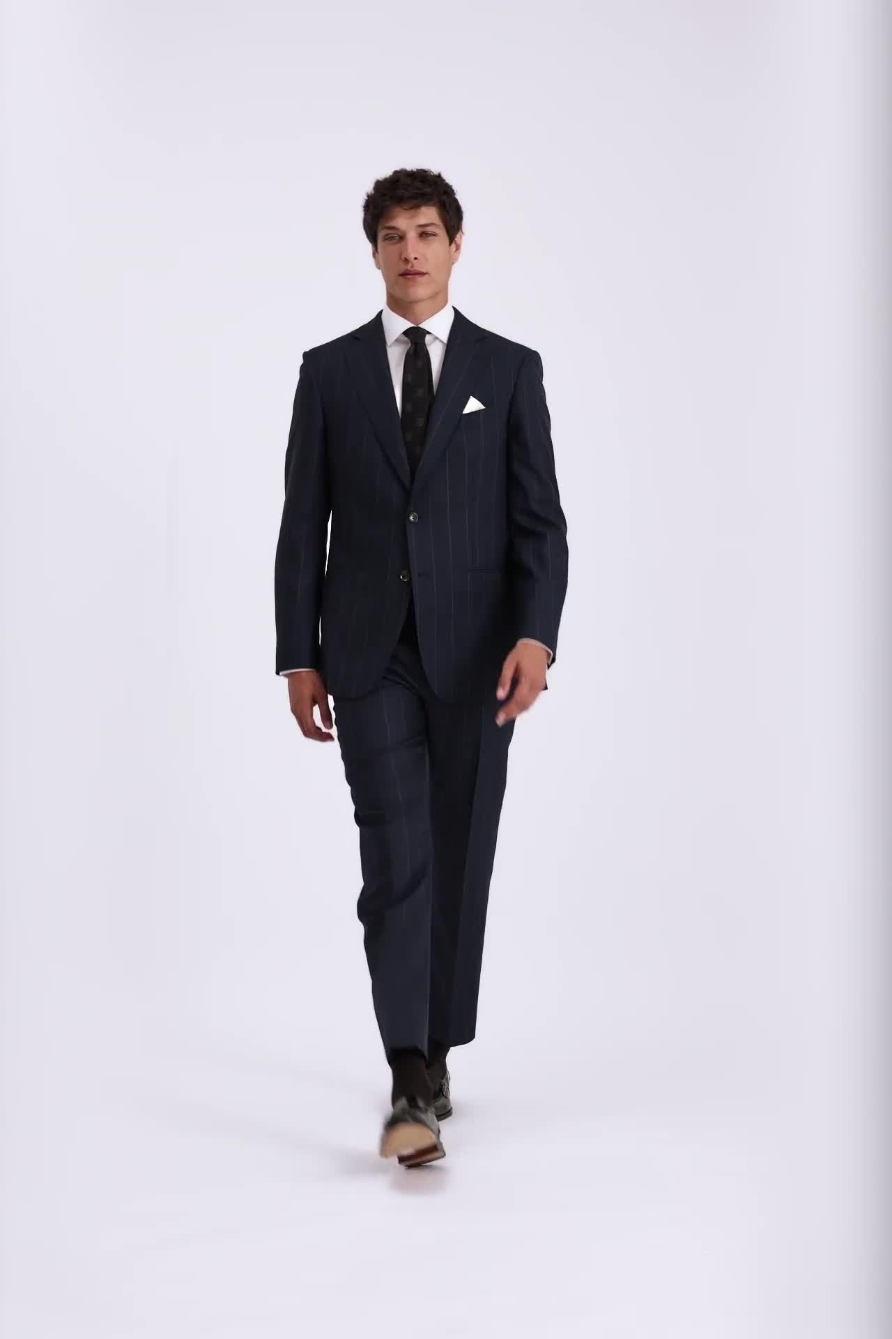 The jacket is constructed using a half-canvas design, a clever detail that ensures the cloth drapes beautifully from the very first wear and continues to improve with age. Both the jacket and trousers are cut from pure-wool cloth, offering a premium hand-feel and exceptional structure. The fabric features a refined chalk stripe on a navy base and is finished with meticulous AMF stitching, providing a classic aesthetic that is both easy to style and undeniably smart. This is an investment piece designed for confidence and longevity.