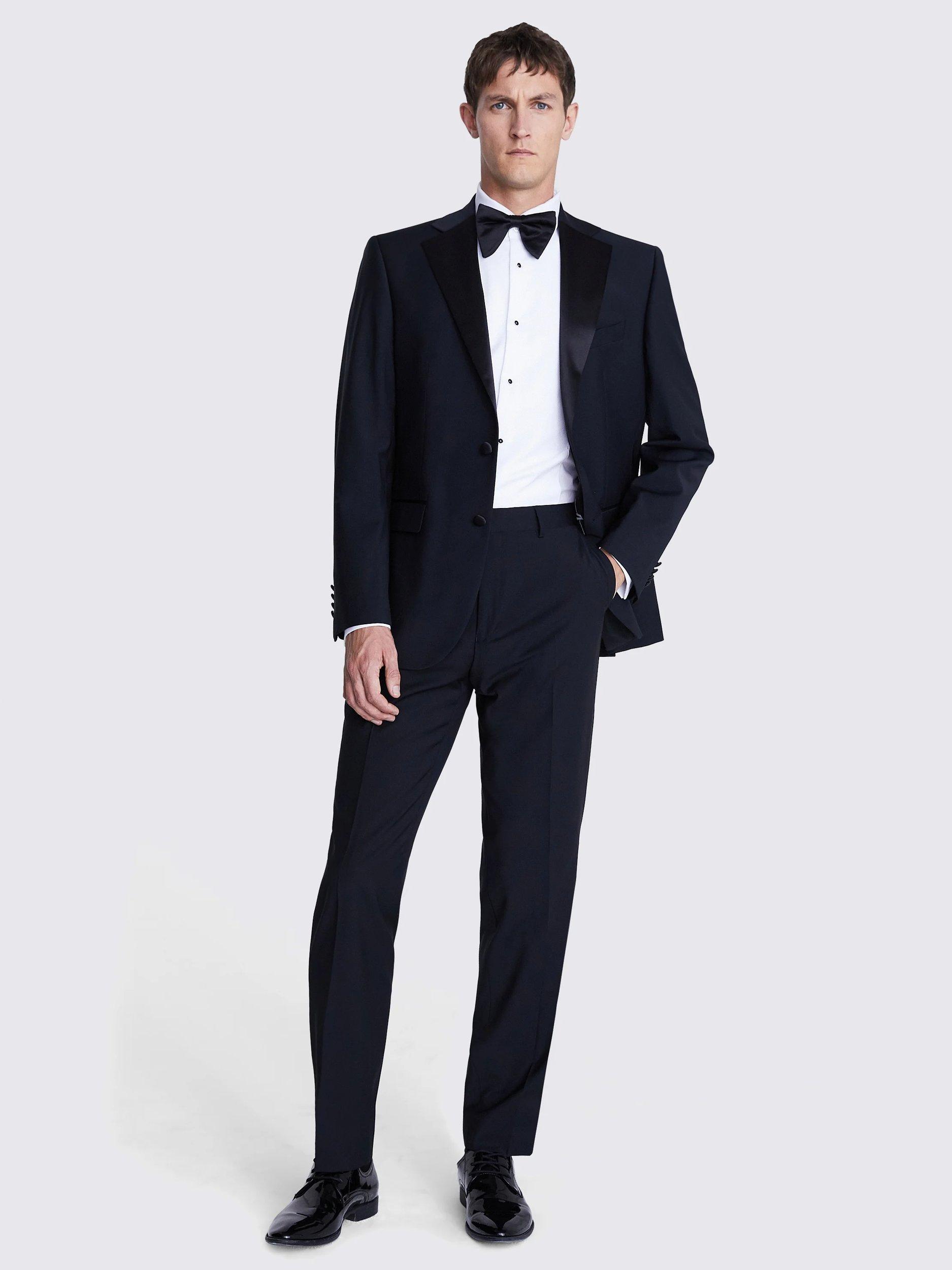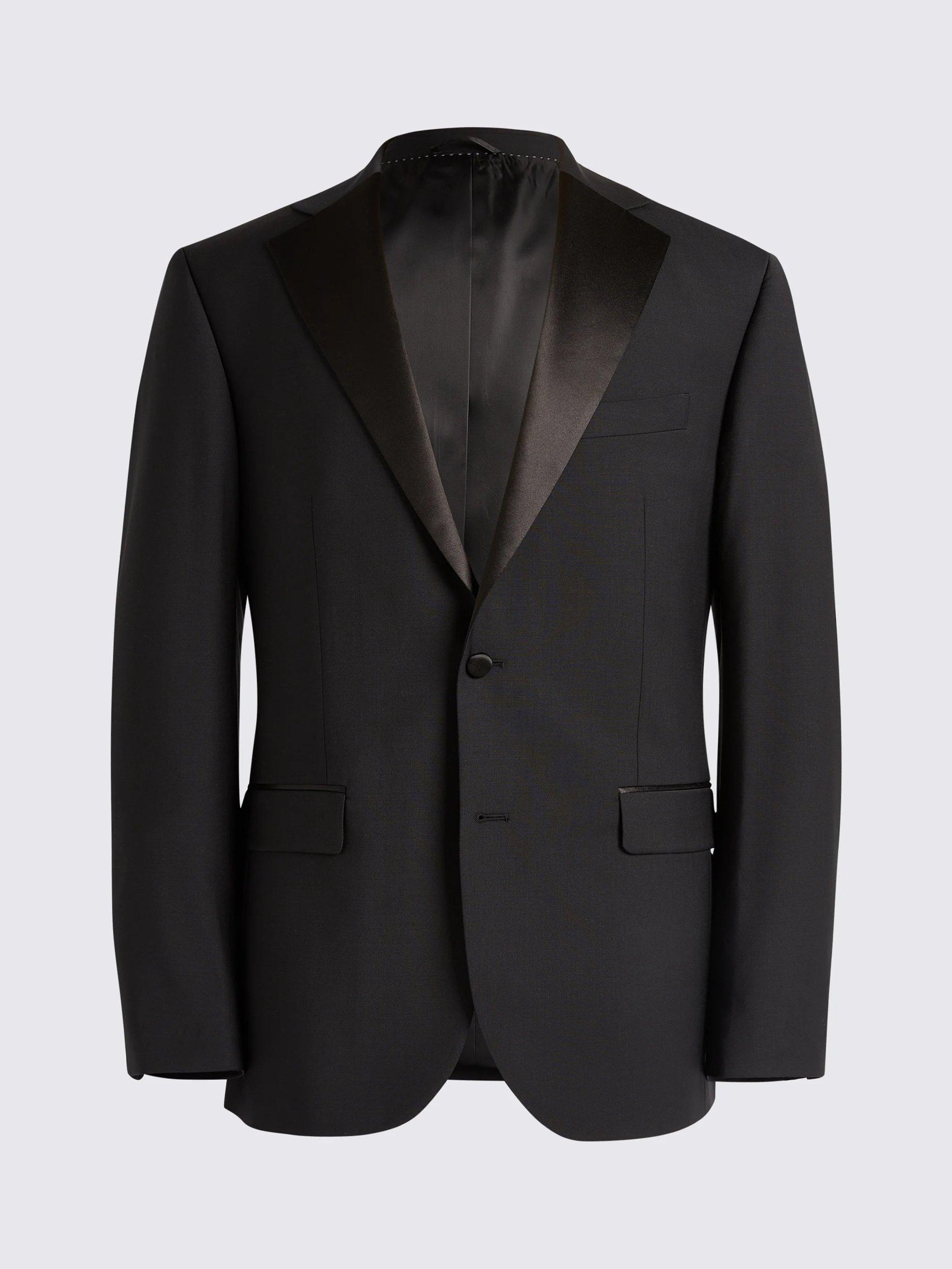 Crafted in a wool blend with a smooth and compact surface, Moss' regular-fit dress jacket is great for sharpening up your black-tie selection. It's trimmed with tonal silken accents at the notch lapels, flap pockets and buttons to bring the polish.