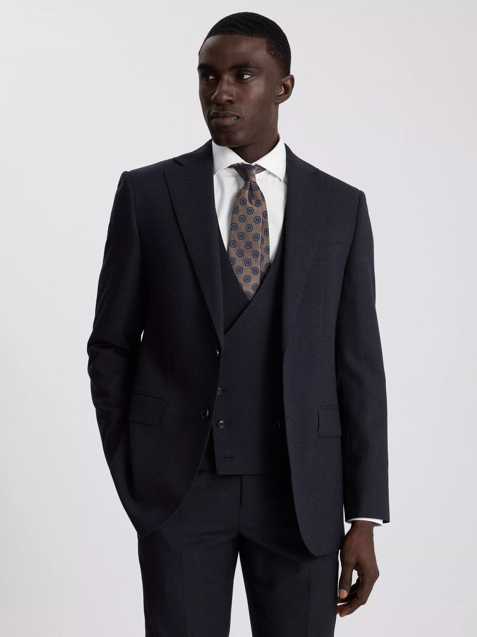 This regular-fit suit offers a refined update to traditional tailoring. The jacket, waistcoat, and trousers are crafted from Super 110s wool featuring a subtle puppytooth pattern, while the half-canvas construction allows the jacket to mould to the wearer's shape over time.
