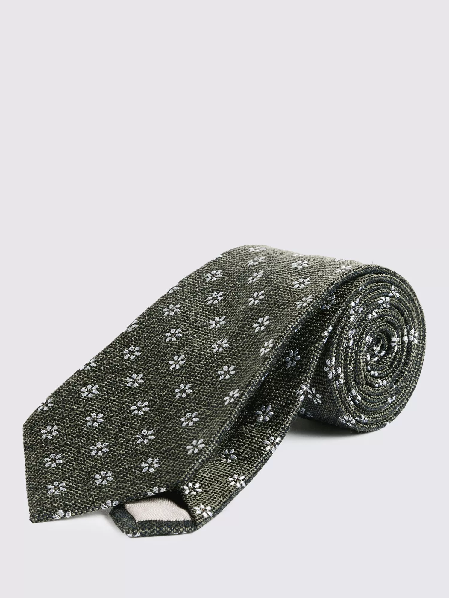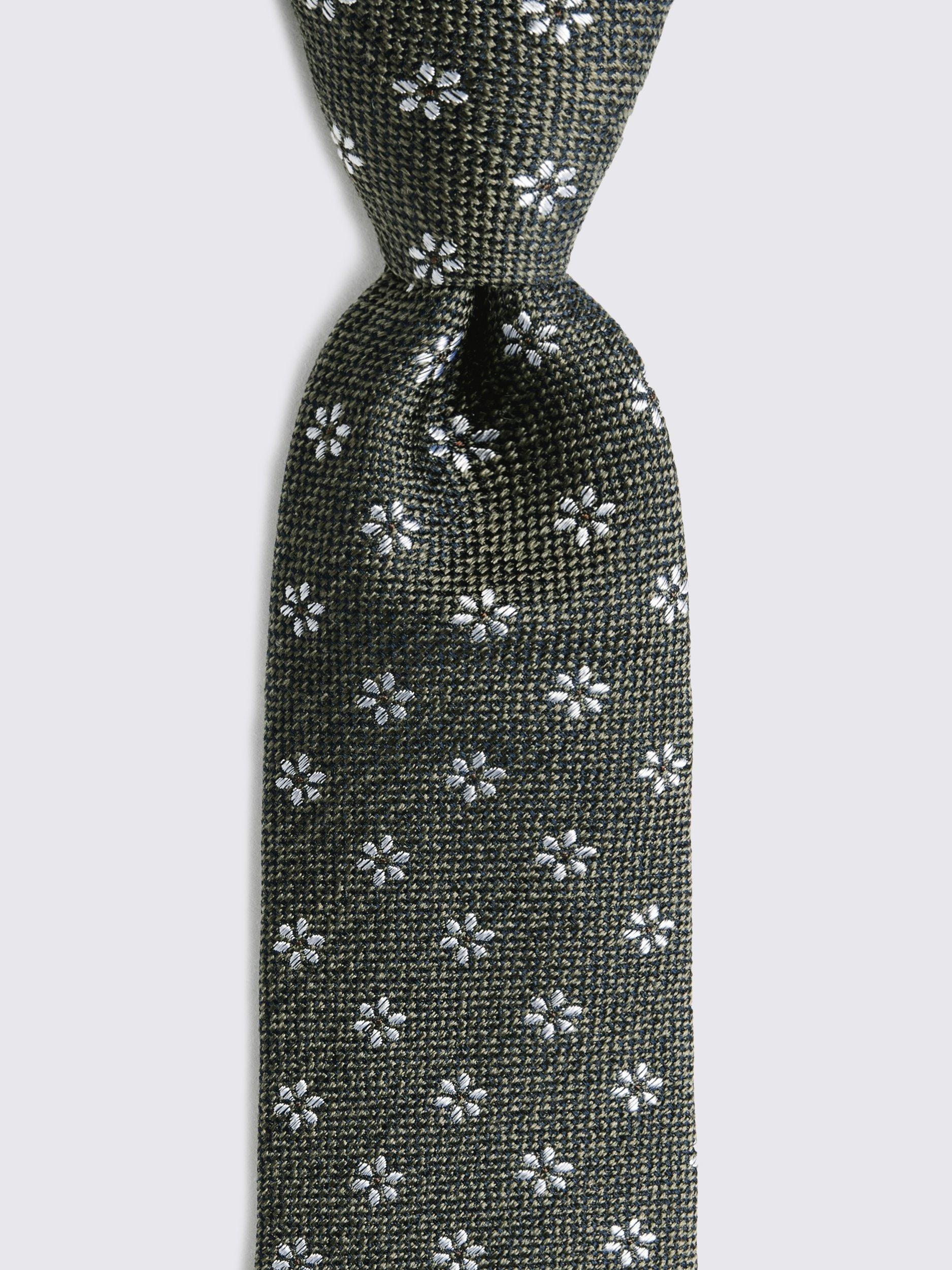 Round off formal looks with Italian-crafted style. Peppered with a contrast daisy motif, this green tie is the finishing touch you're looking for. It's woven with a light structure in yarns made from soft silk and rich wool.