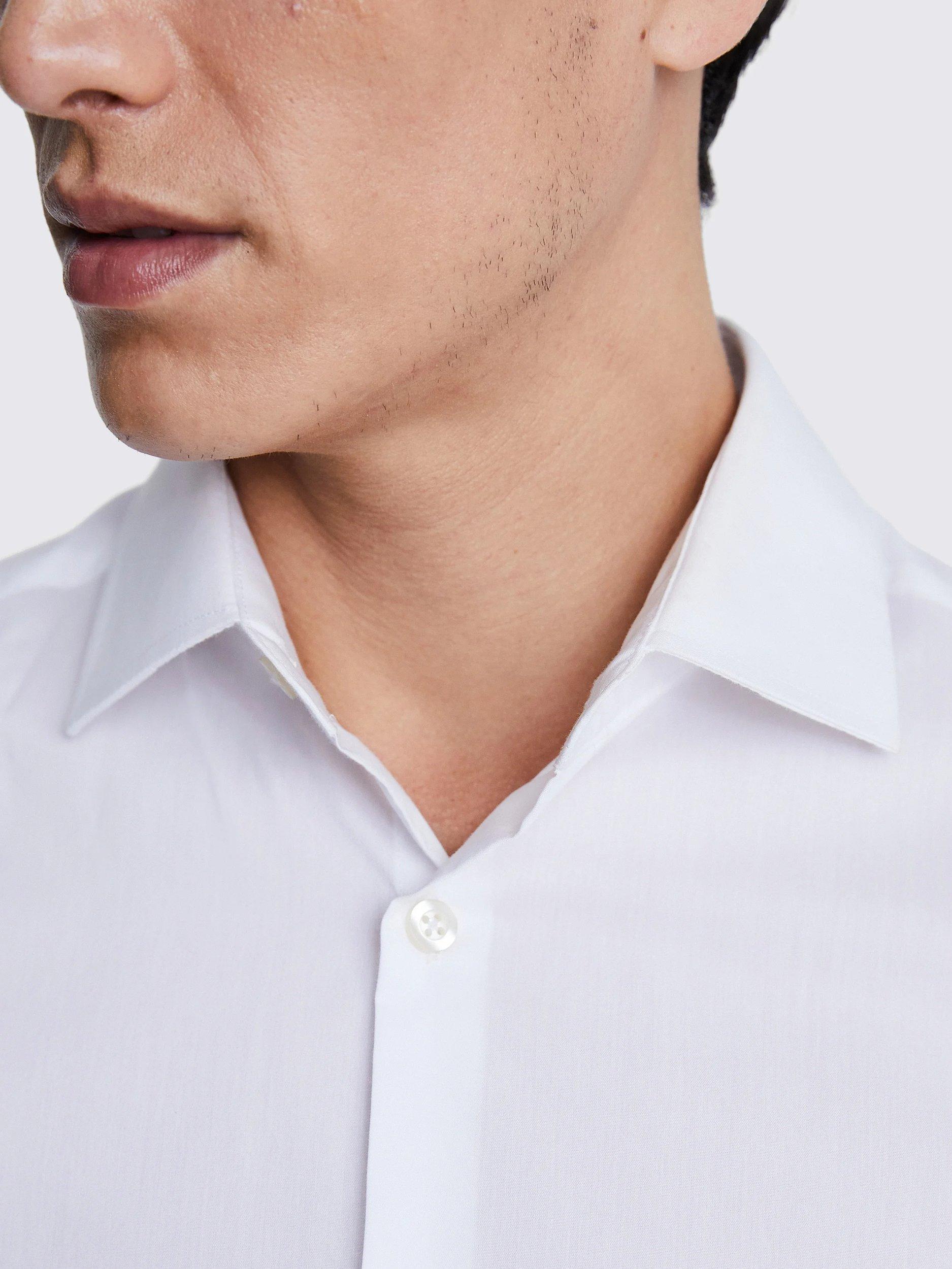 Shirts with inbuilt stretch sit closer to the body while offering room to move. Moss. have added 3% elastane to this crisp white shirt, helping you to get a close fit through your waist.Cut a skinny fit, it feels narrow on the shoulders, chest and waist for a well-defined outline.