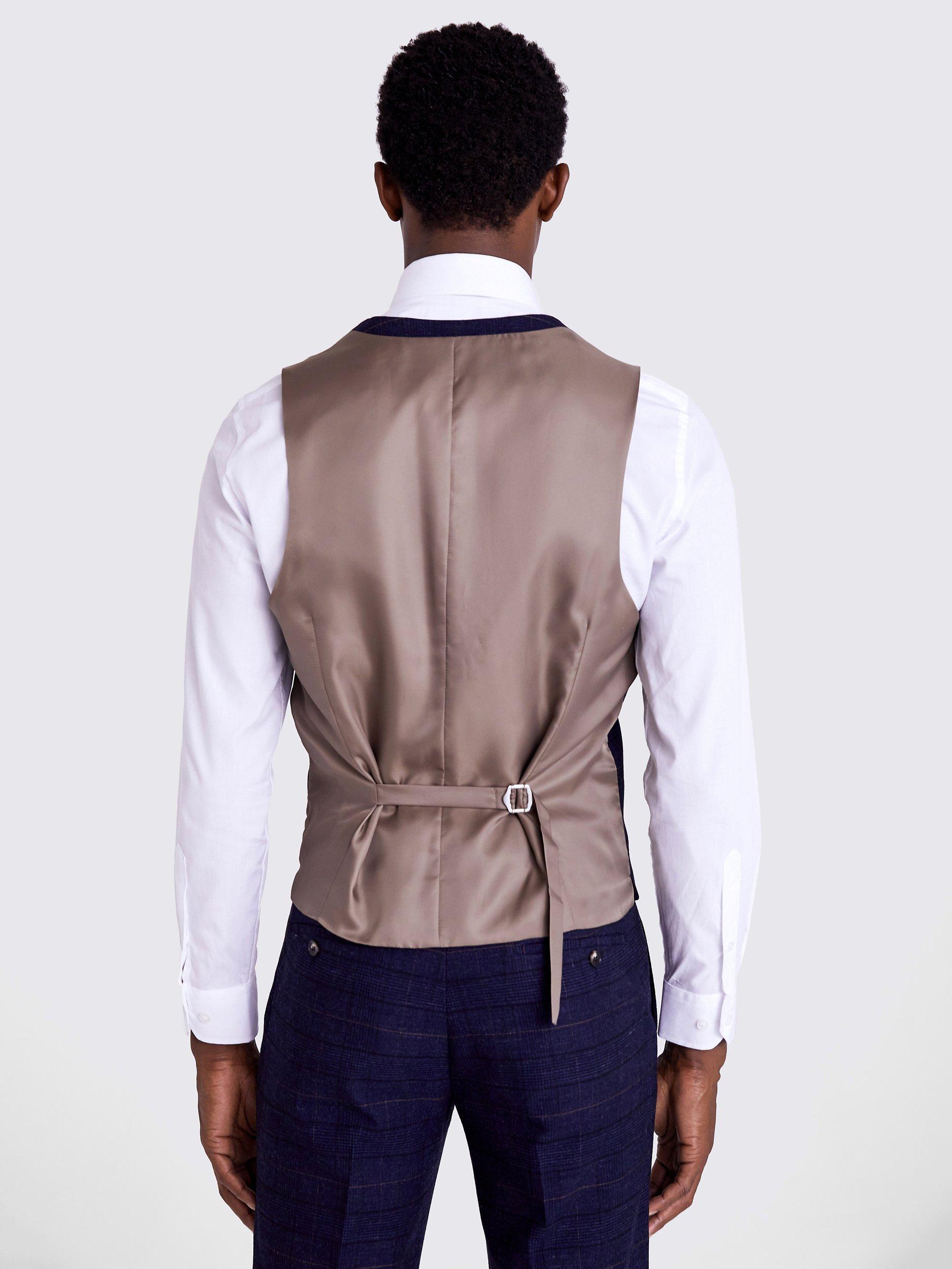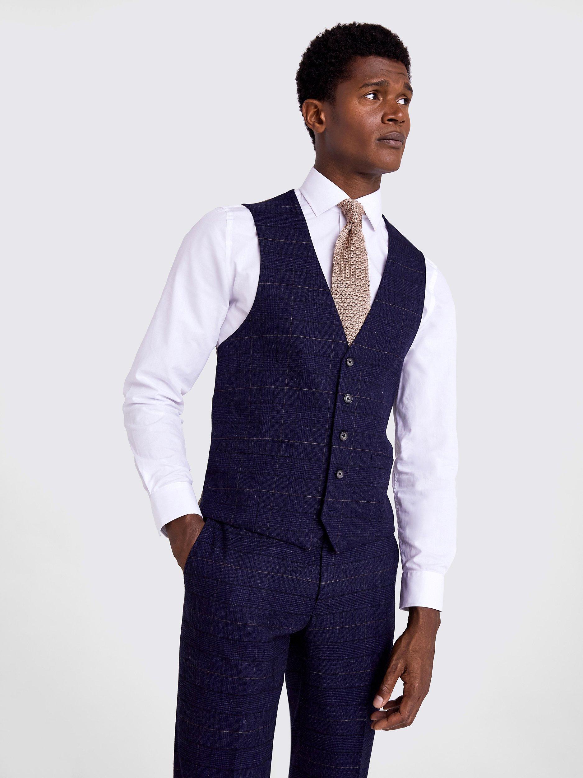 Complete your formal look with this dark check waistcoat from Moss. Cut in a skinny fit, it hugs the torso and shows off details like the bronze finish on the back and light tortoiseshell buttons. Style it with the matching trousers and jacket or wear over a beige or white shirt for contrast.