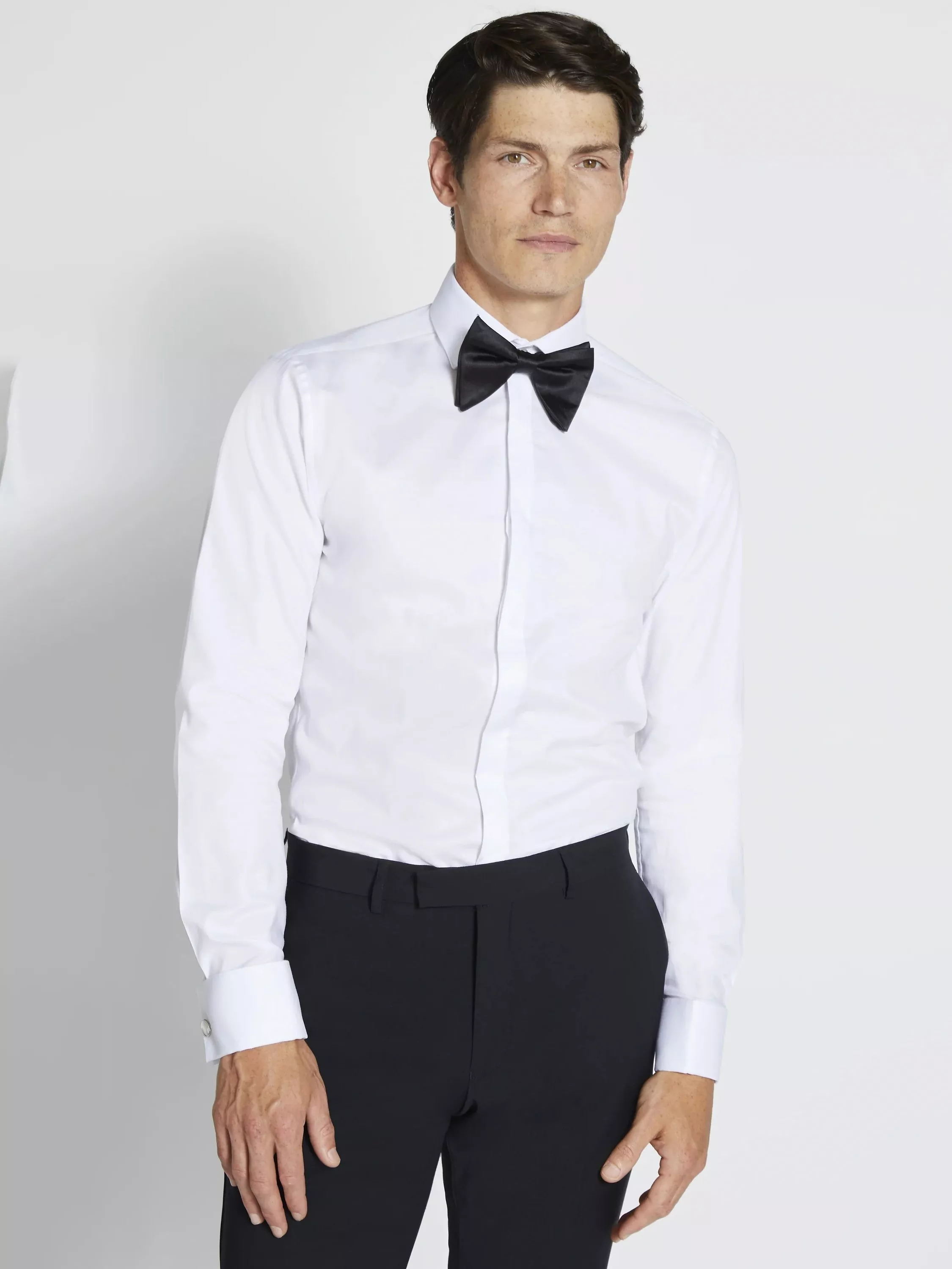 Freshen up your formal touches with Moss's clean take on the white dress shirt. Cut to a slim fit for a neat profile that's got room to move, it s crafted in pure-cotton yarns for natural breathability you'll appreciate at black-tie events. The upright wing collar is just the thing for your finest bow tie, add Moss cufflinks for a finishing touch that'll hit all the right notes.