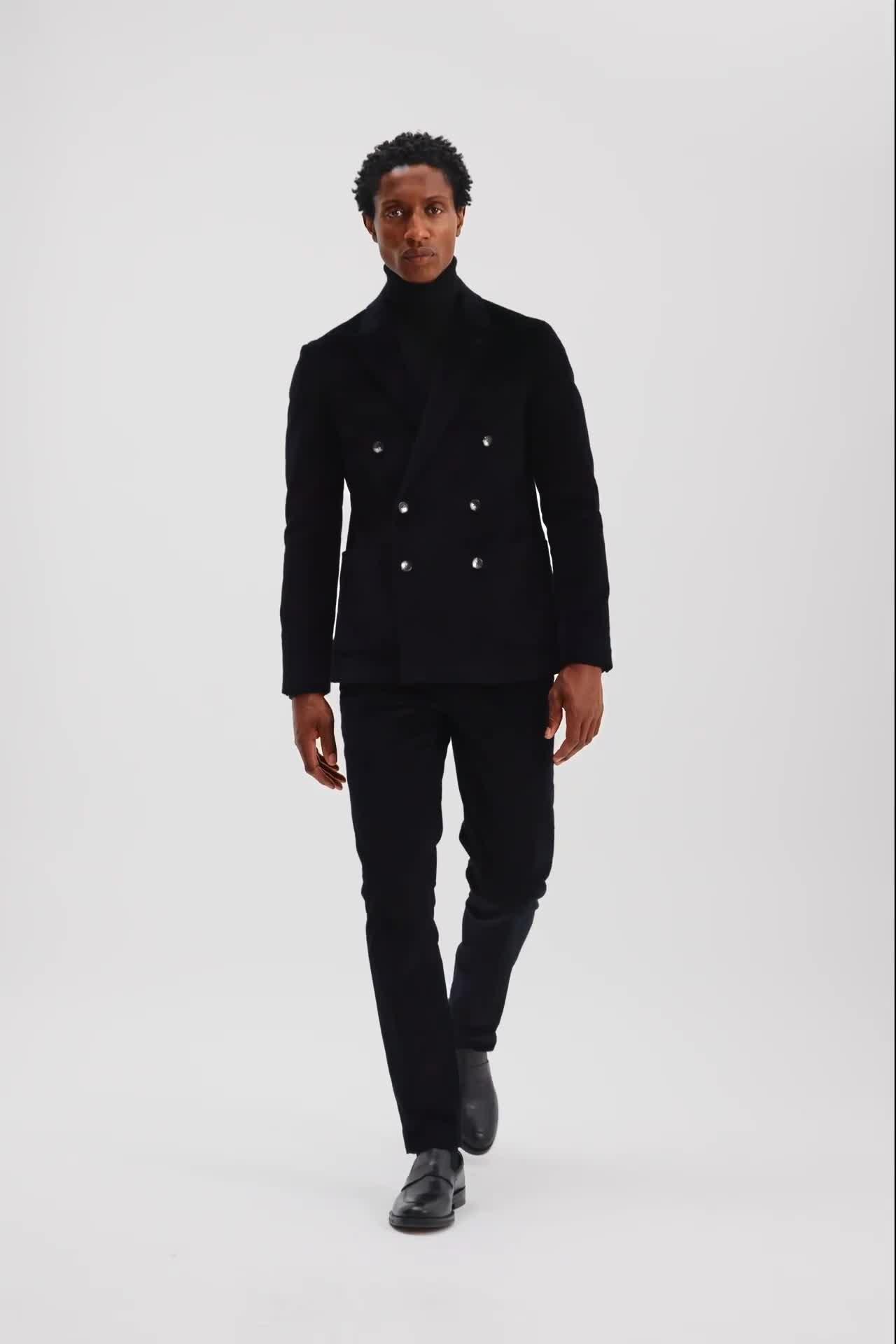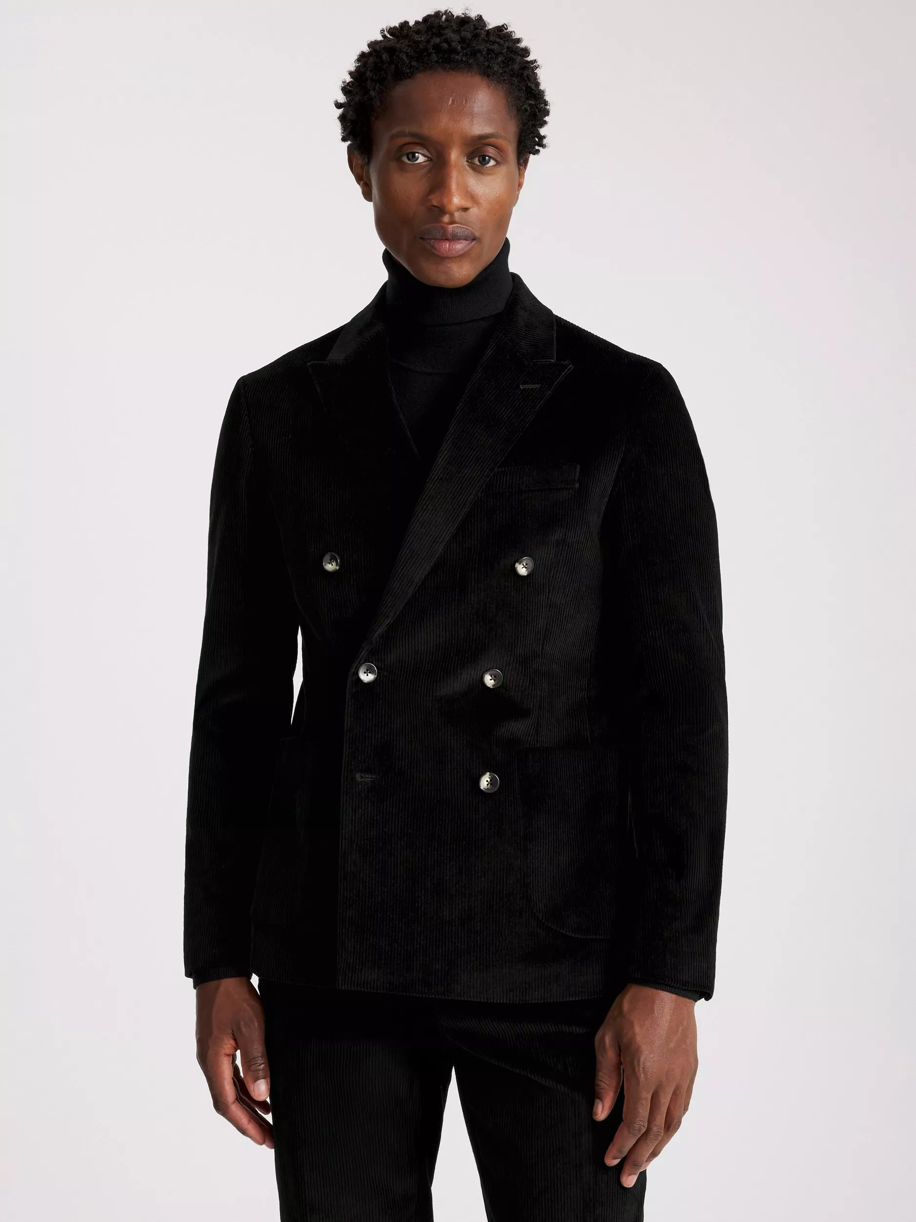 Double-breasted jackets' popularity peaked during the 1930s and were often cleverly tailored to add the illusion of extra height or width to the wearer. Today, they offer a current take on vintage dressing. Moss' jacket is ideal for bringing style to off-duty looks, cut in ink-toned corduroy for a statement alternative to black. Add a [turtleneck] and polished [Derbys] for easy weekend styling. Due to individual browser/monitor settings, actual colours may differ slightly.