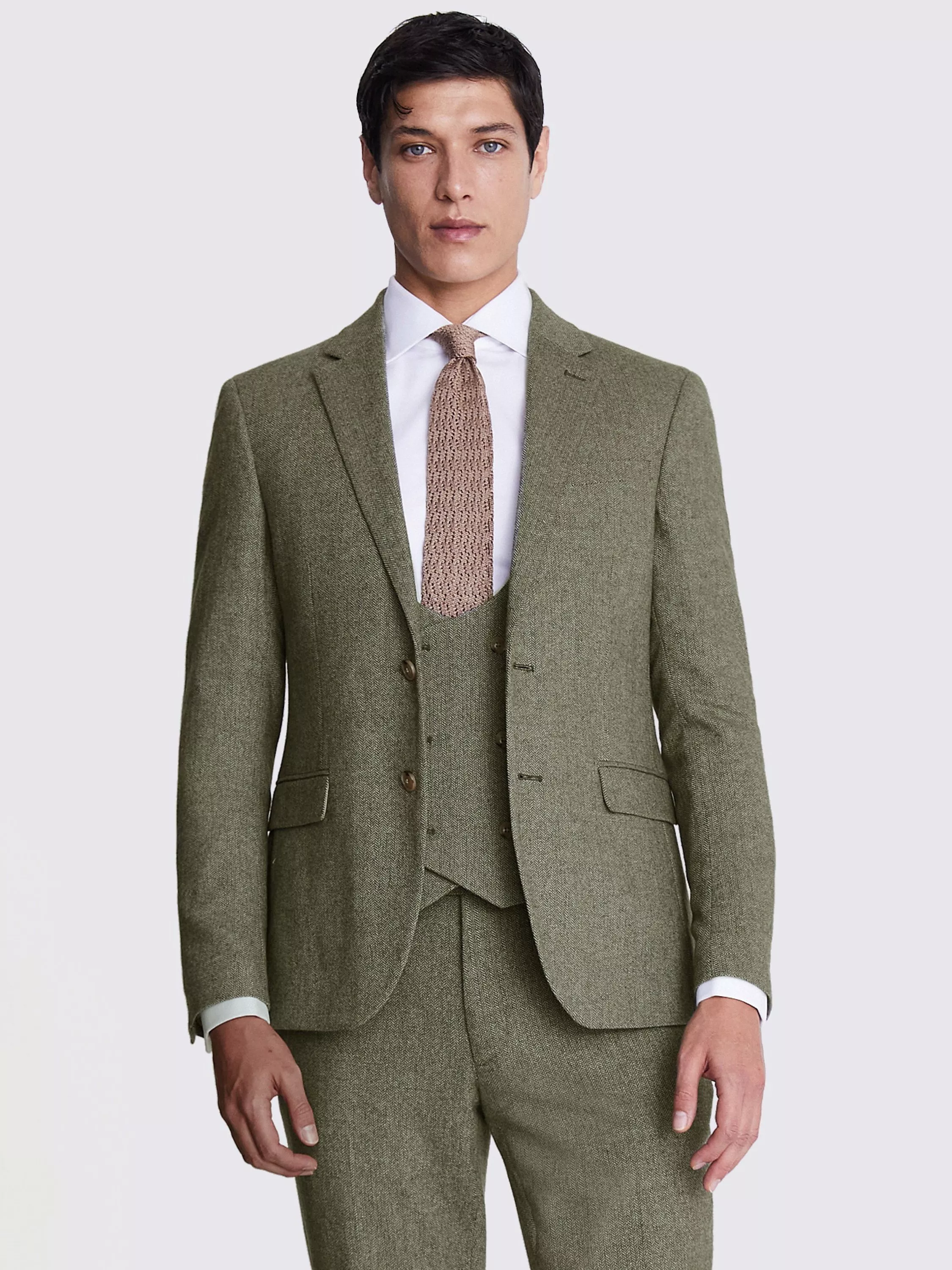 Perfect paired with the matching suit trousers and waistcoat, finish the look with a knitted tie and suede Derby shoes.