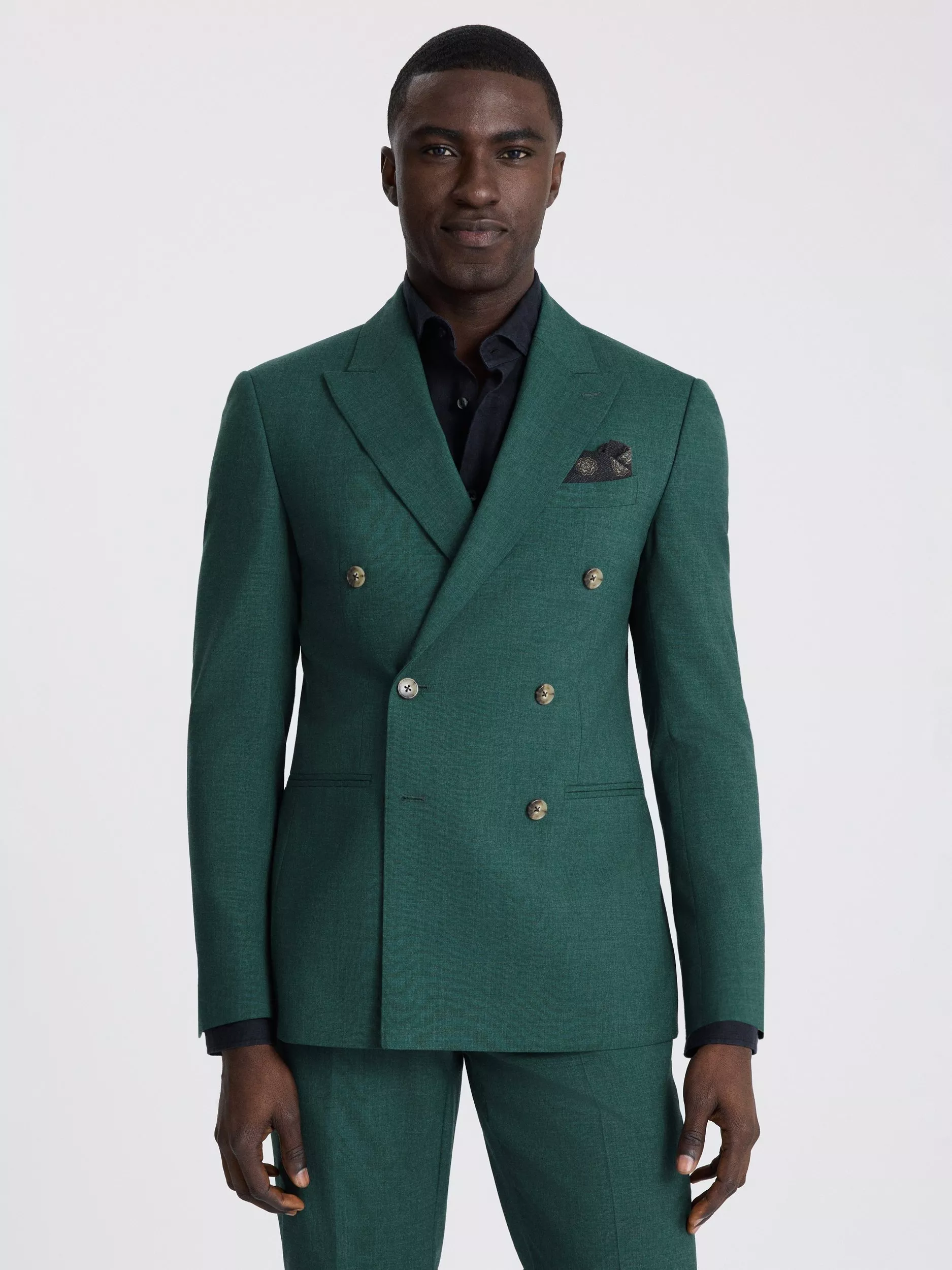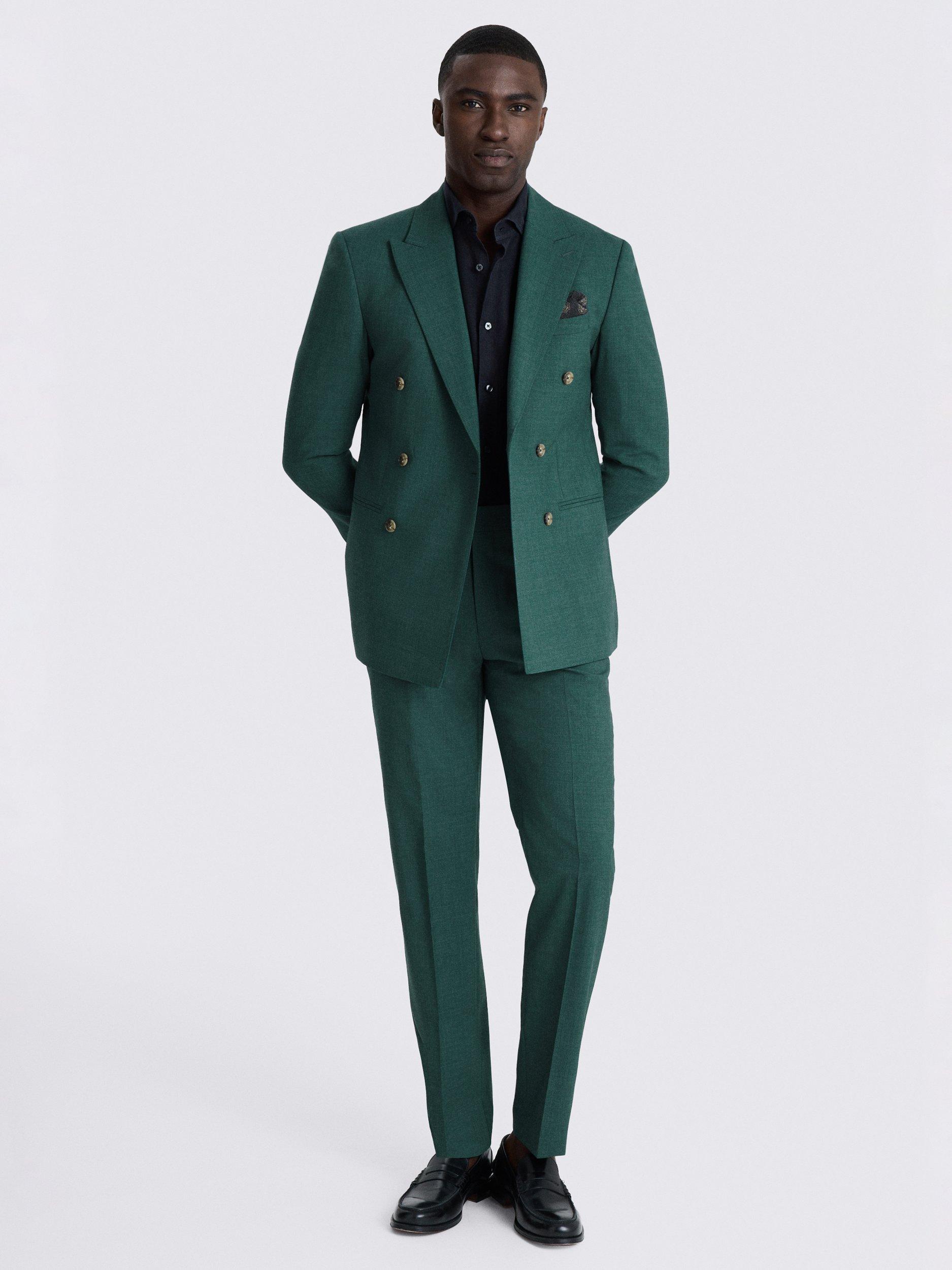 Formal staples receive a little lift with the defined profile of this two-piece suit. The double-breasted jacket and slim-cut trousers are crafted in a soft wool blend with a subtle marl effect that is easy to style.