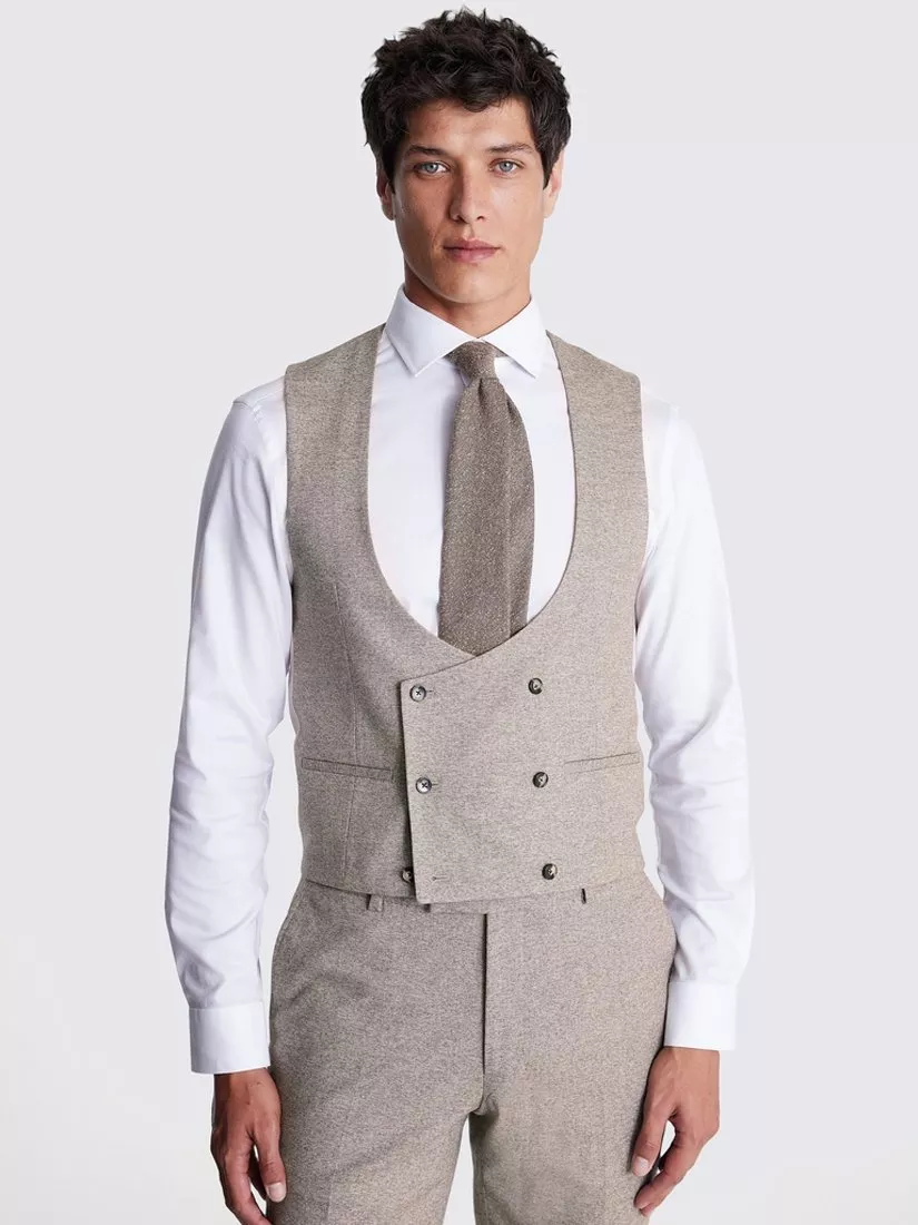 Cut with a horseshoe design in a slim fit, Moss's double-breasted neutral waistcoat is great for experimenting with different looks.
