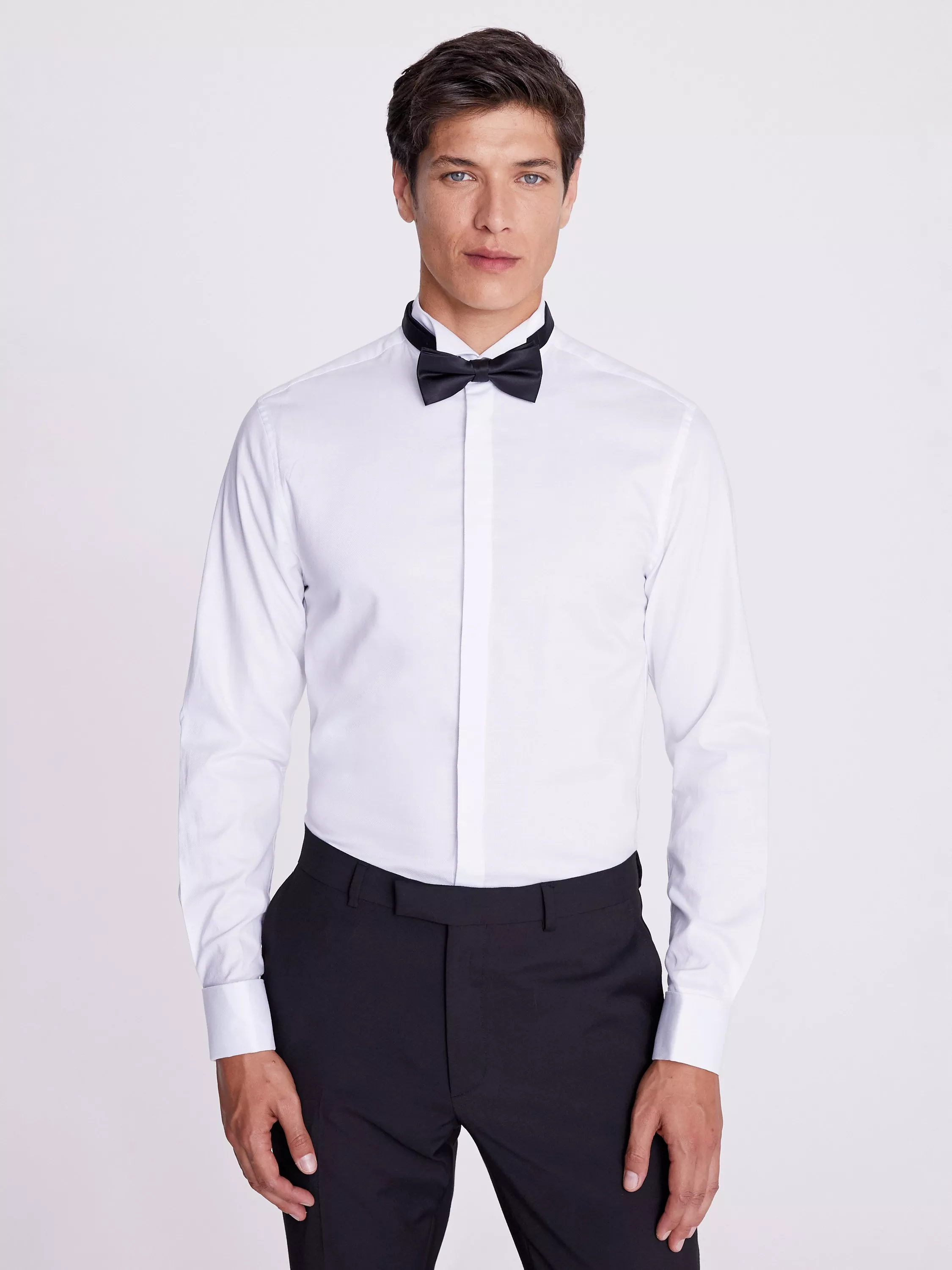 Freshen up your formal touches with Moss clean take on the white dress shirt. Cut to a slim fit for a neat profile that's got room to move, it s crafted in pure-cotton yarns for natural breathability you'll appreciate at black-tie events. The upright wing collar is just the thing for your finest bow tie, add Moss cufflinks for a finishing touch that'll hit all the right notes.