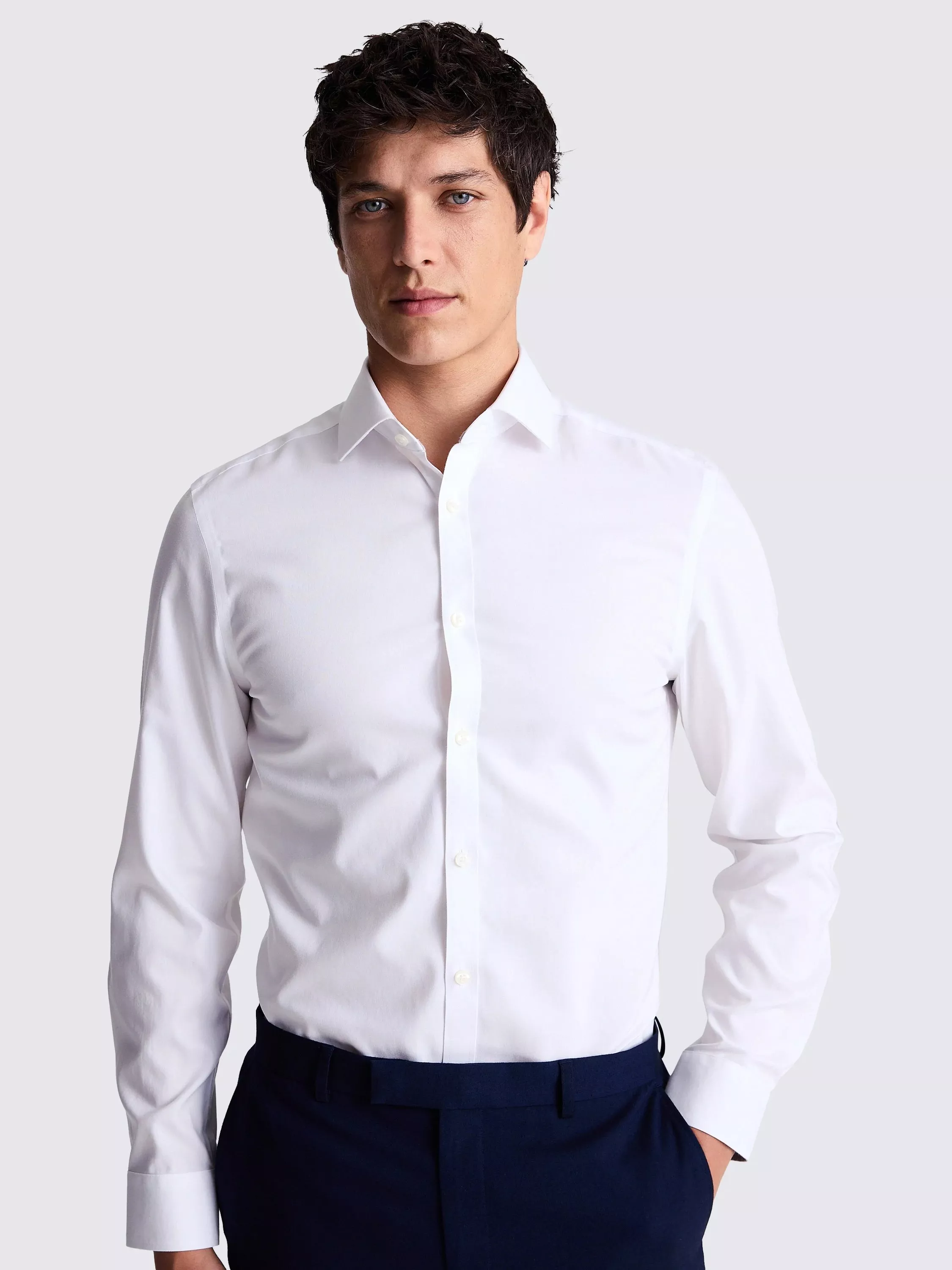 In the closest fit, this white shirt is a staple you'll be glad you picked up. It's crafted in soft cotton woven with a pinpoint Oxford structure to give it light texture.