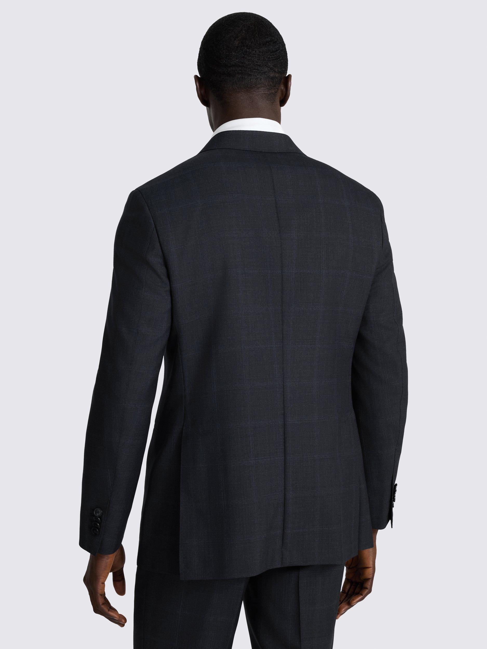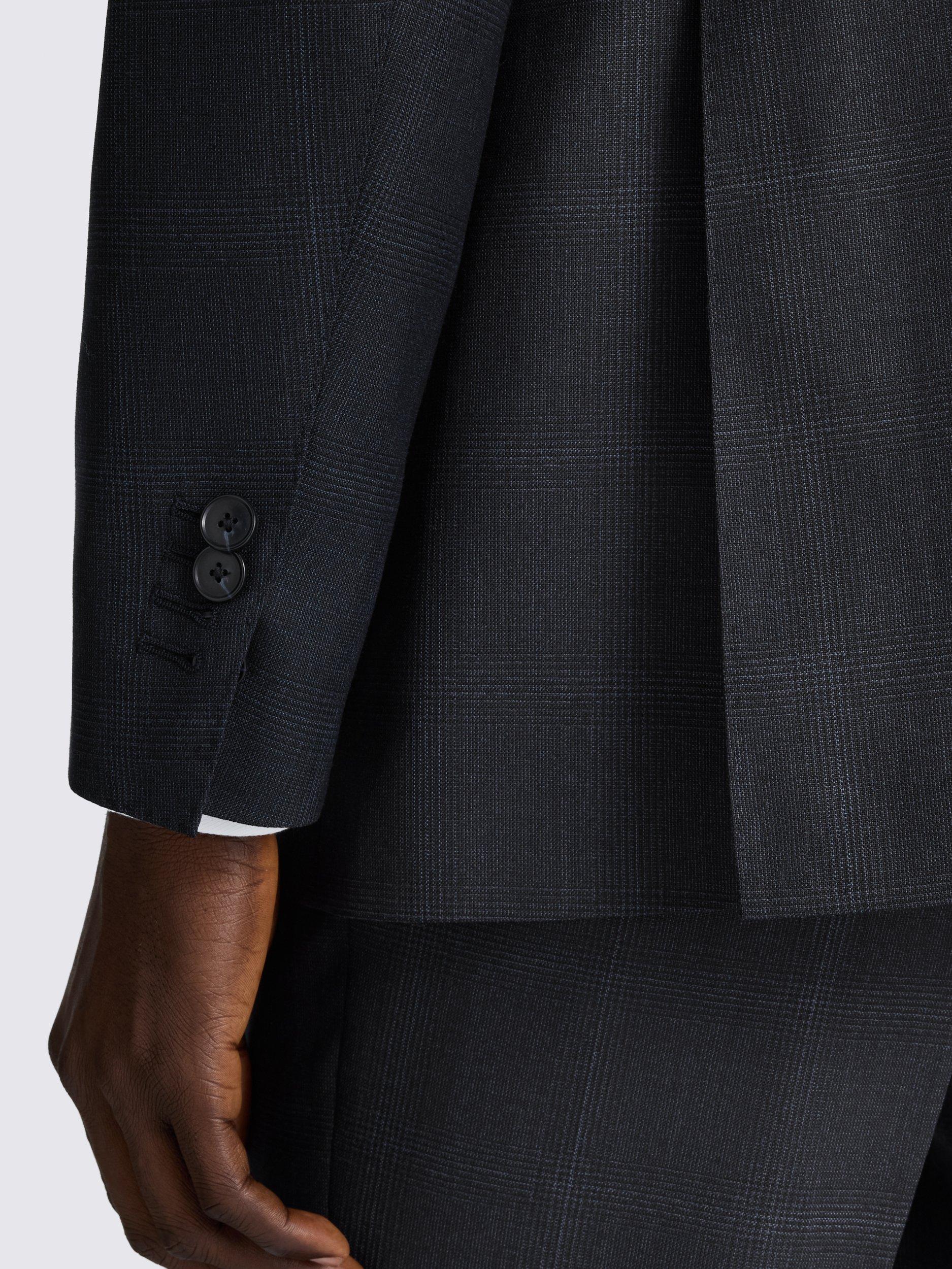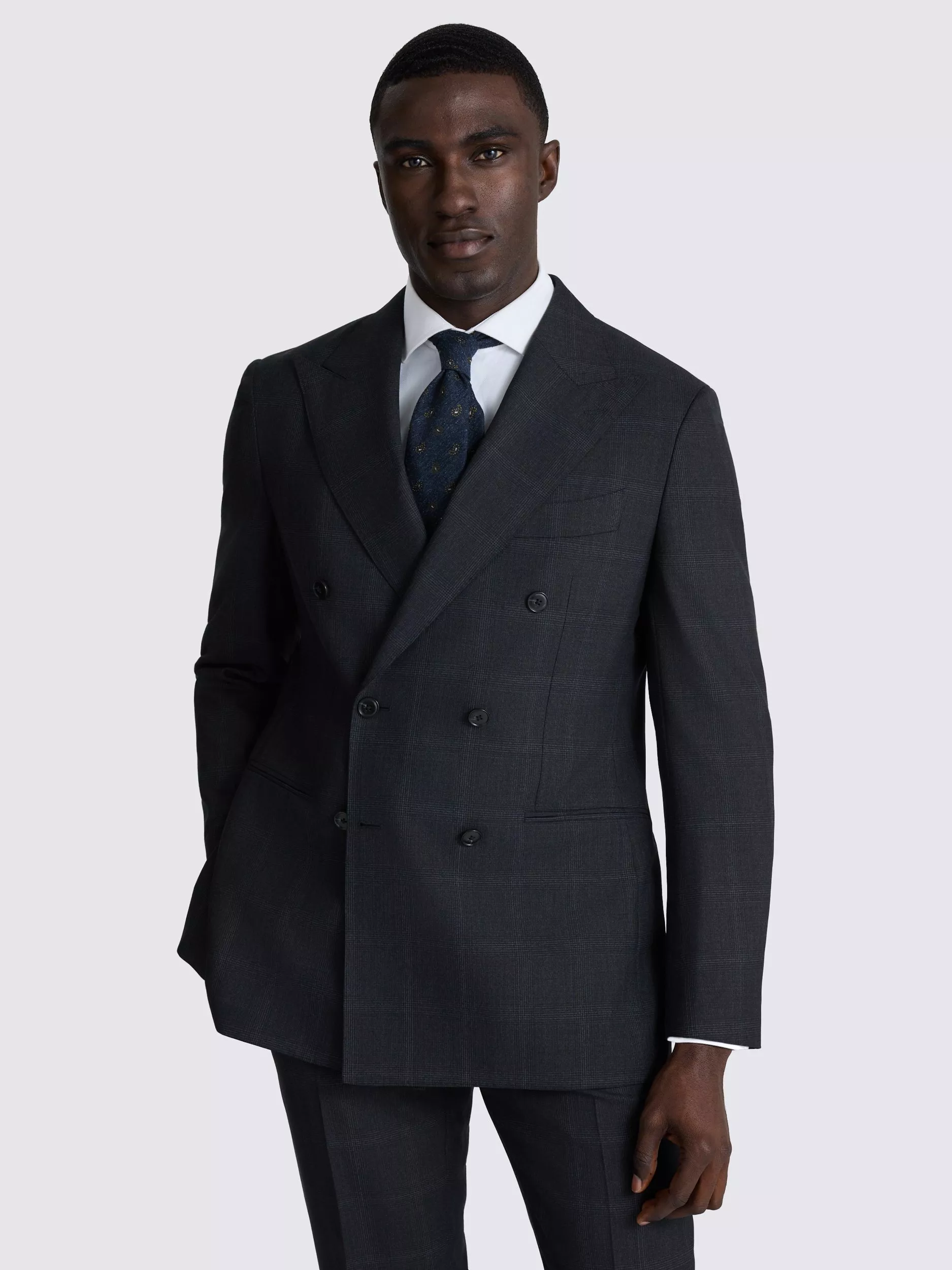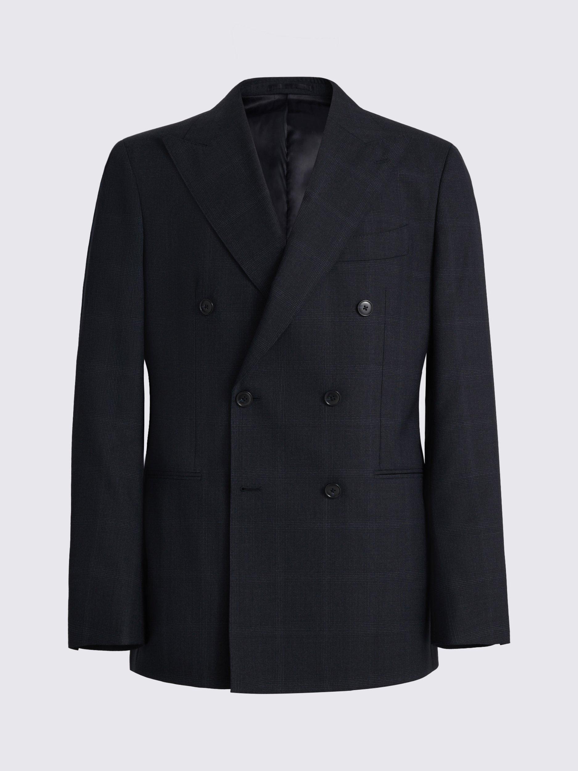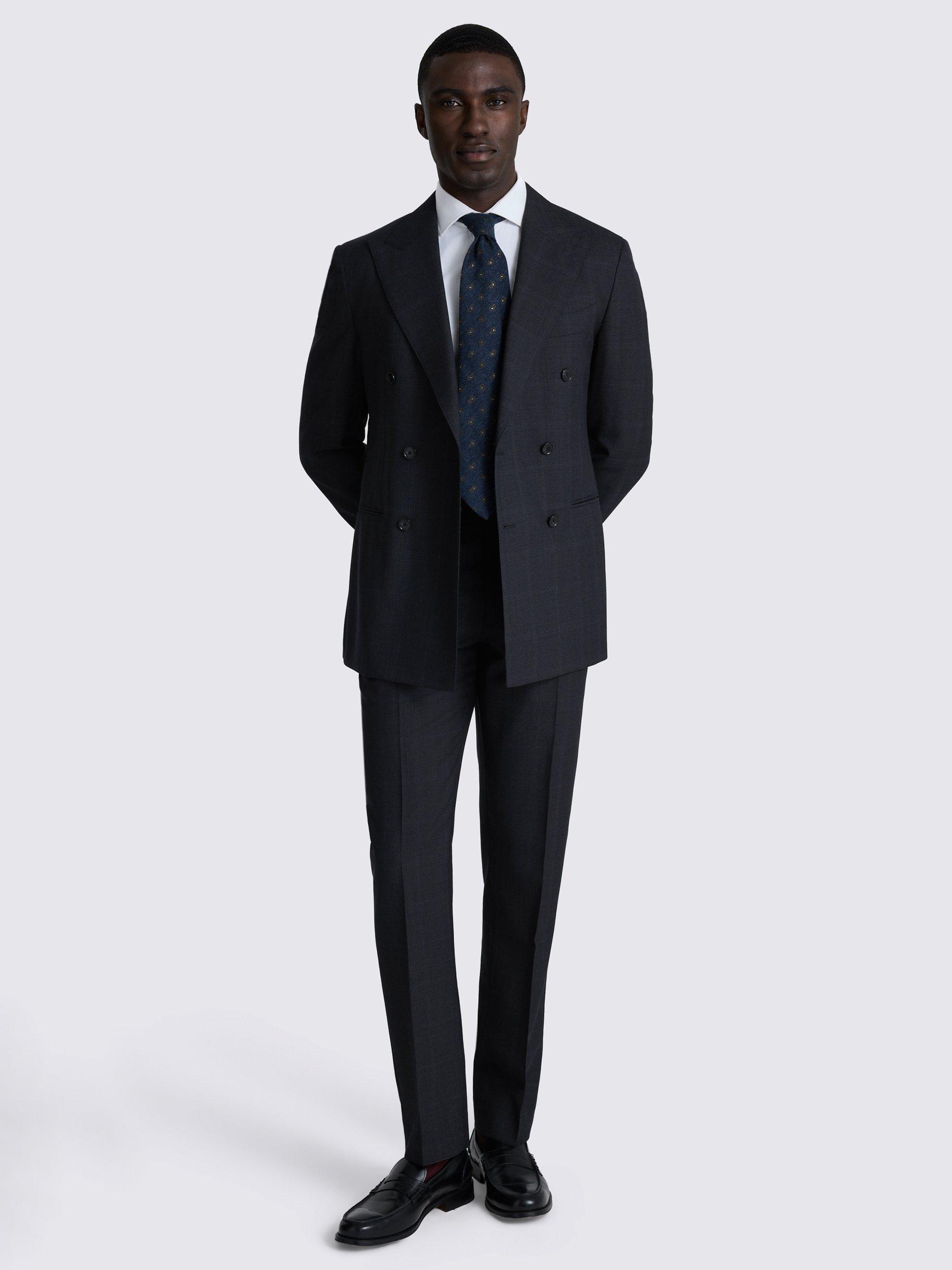 Presented in a deep navy with a subtle check for effortless styling, this tailored-fit suit is crafted from the finest Italian-made Super 110s wool twill. The fabric of the double-breasted jacket and trousers features a softly brushed finish, while AMF stitching provides an expert finishing touch.