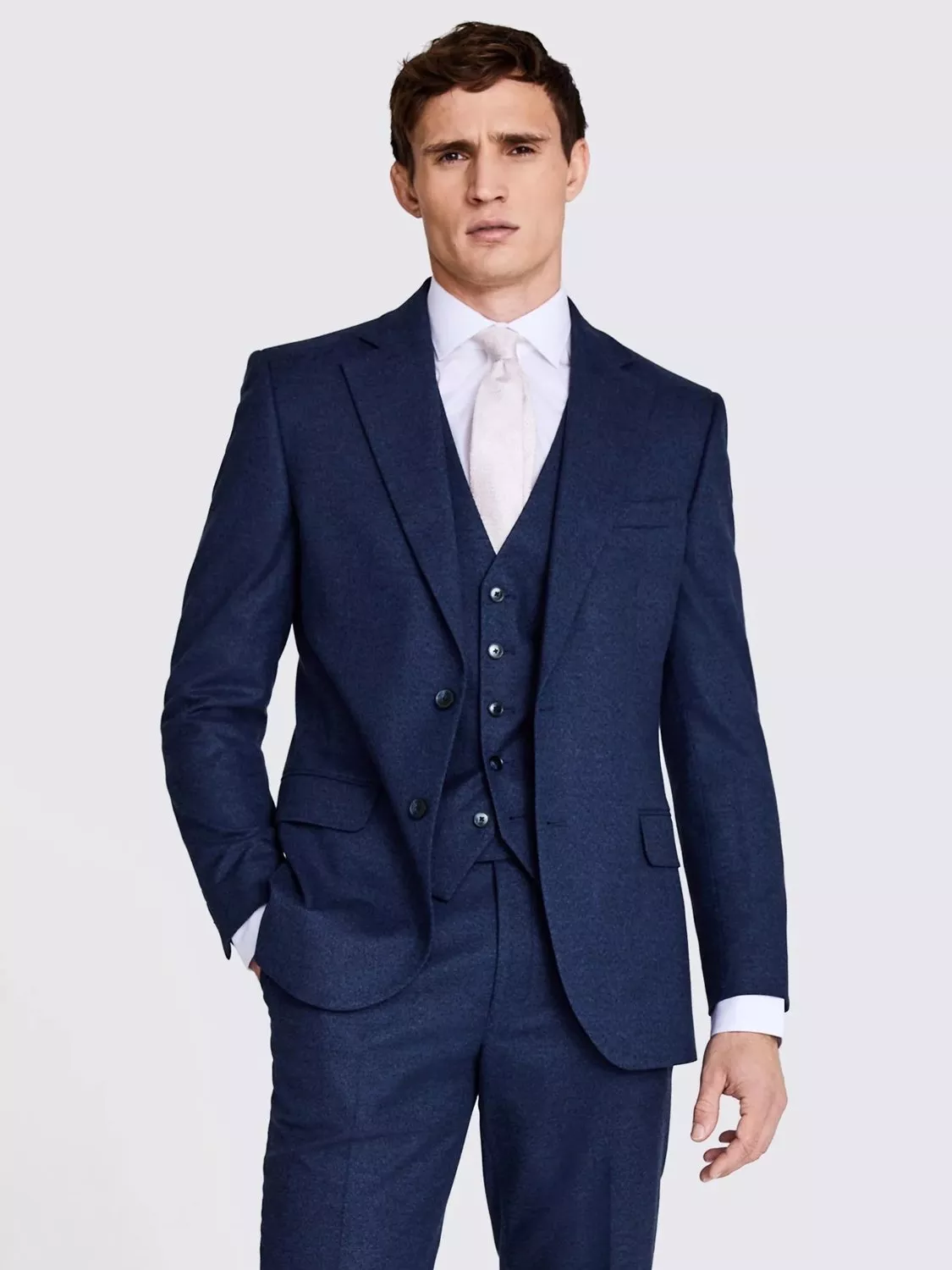 A flannel suit is a modern classic, delivering lightweight warmth and a versatile, matte look that can be styled up or down. Cut on Moss's tailored block from a blend of recycled fibres and stretch, Moss' flannel suit has a soft handfeel, buggy lining and a relaxed shoulder line. Set off the enduring blue tone of the full suit with limited accessories or try it with a knitted rollneck for a more laid-back look.