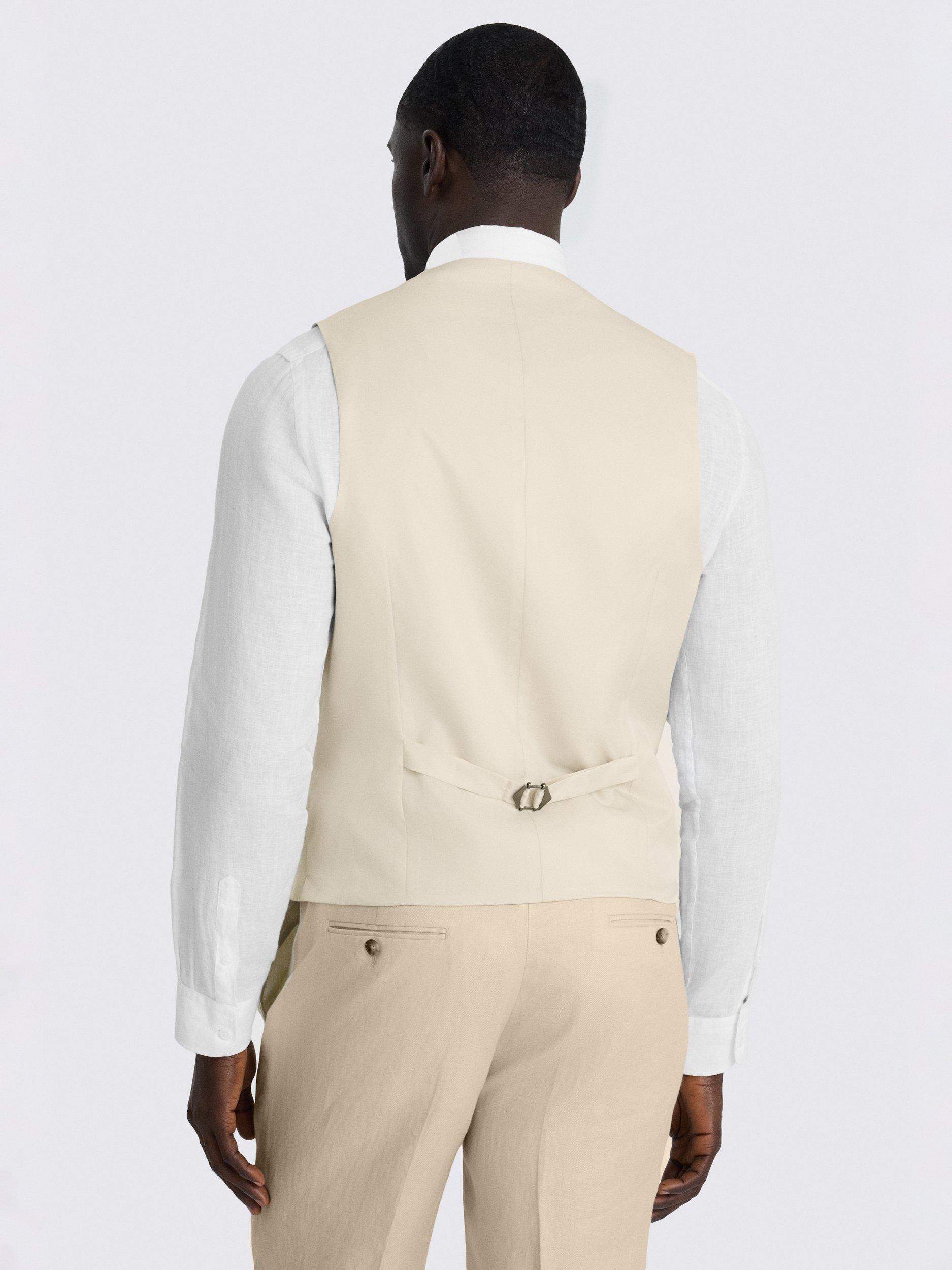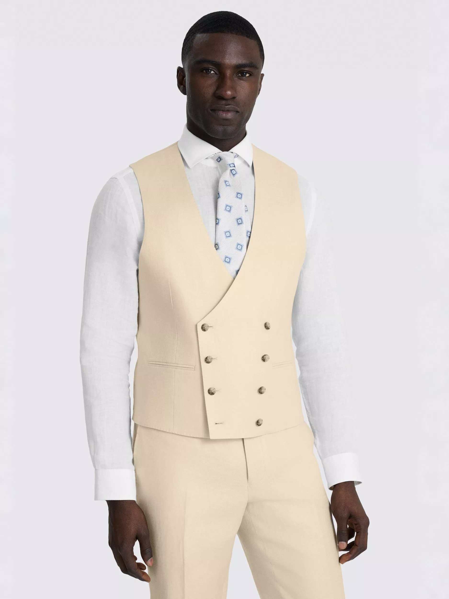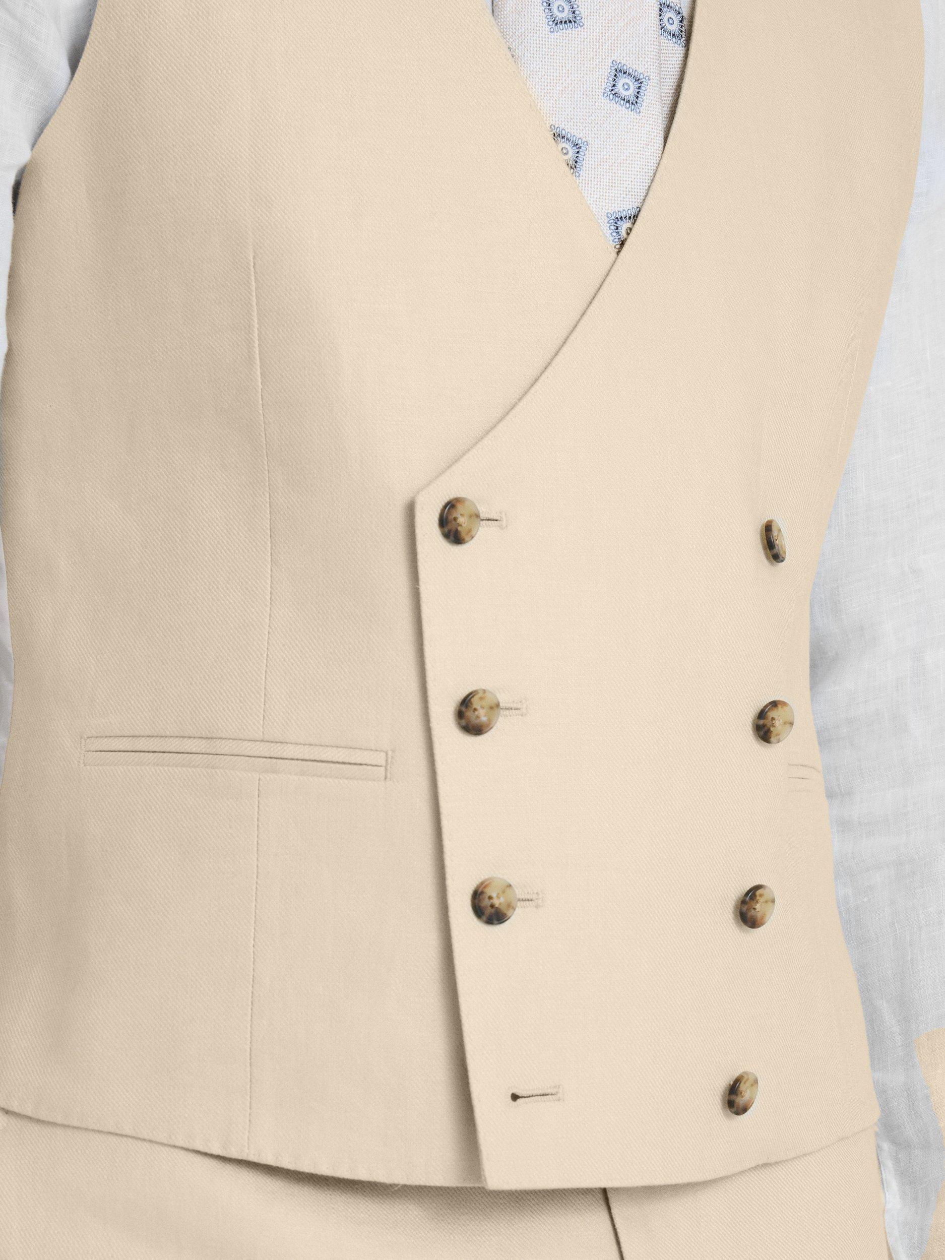 Cut to a modern tailored fit, this double-breasted waistcoat is a great choice for any formal commitment. It is crafted in 100% linen for a lightweight, breathable feel, adding patterned buttons for more character.