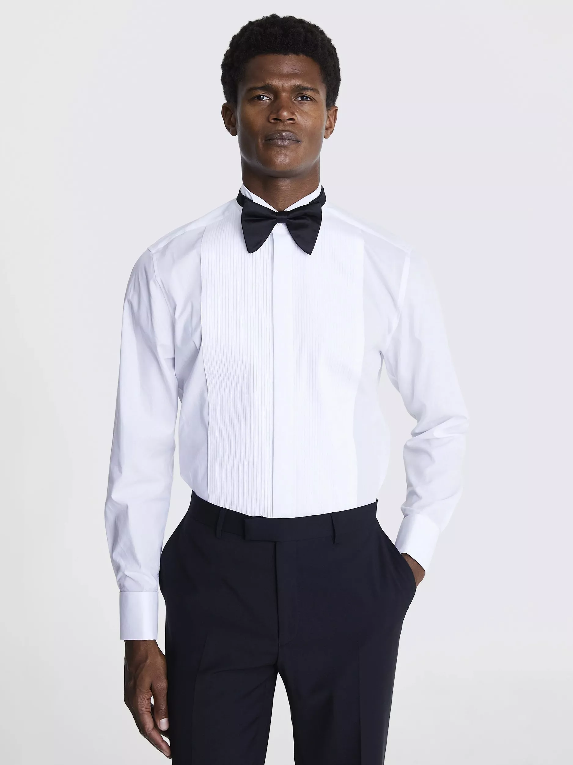 Freshen up your formal touches with Moss clean take on the white dress shirt. Cut to a tailored fit for a neat profile that's got room to move, it s crafted in pure-cotton yarns for natural breathability you'll appreciate at black-tie events. The upright wing collar is just the thing for your finest bow tie, while the pleated big and concealed placket work together for a balance of minimalism and detail. Add Moss cufflinks for a finishing touch that'll hit all the right notes.