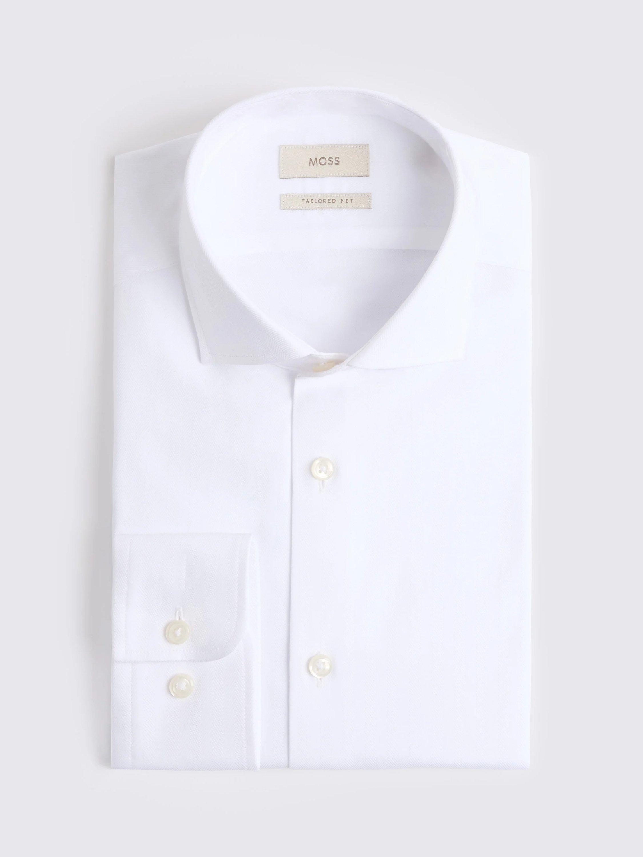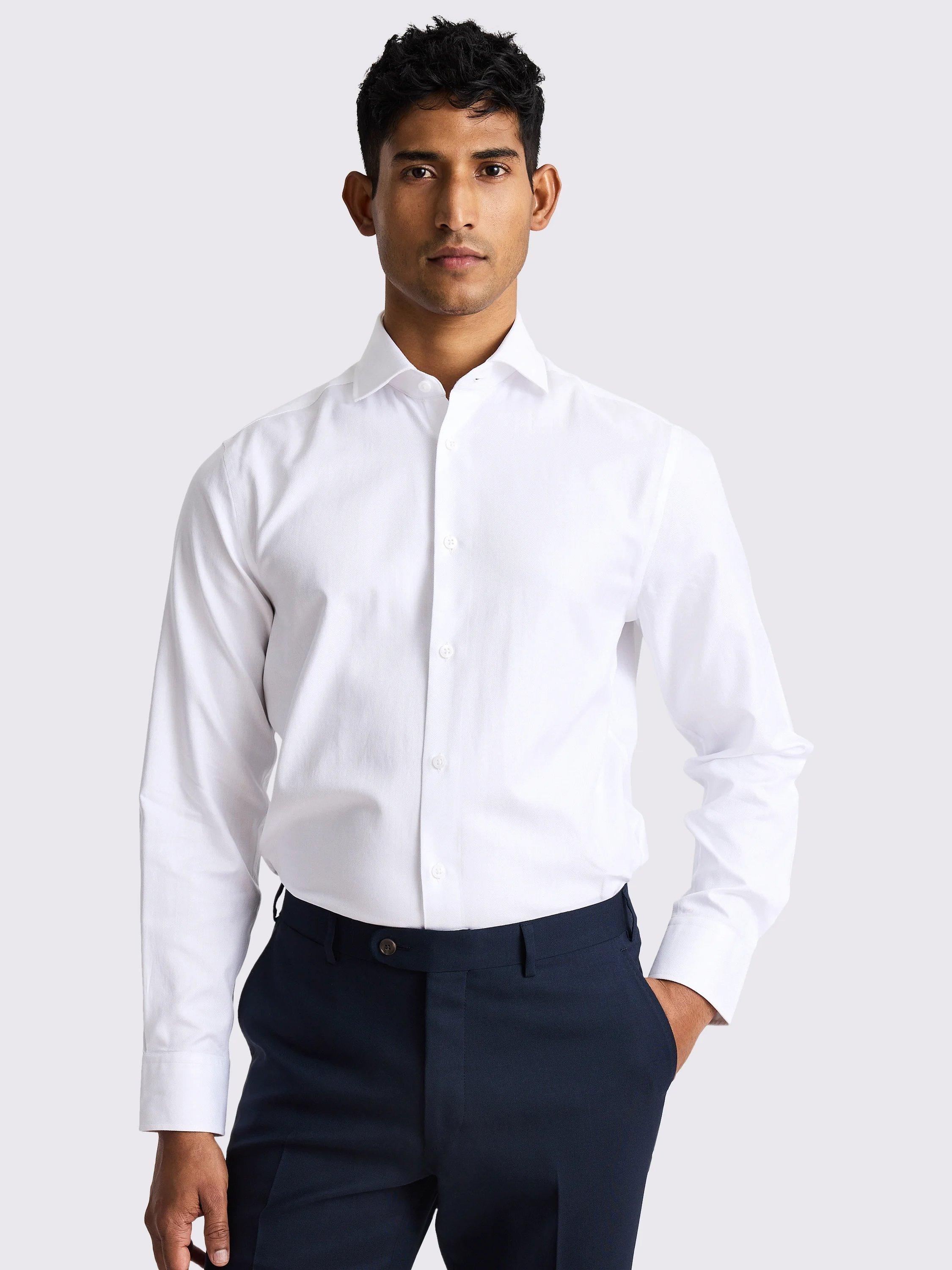 In a strong tailored fit, this white shirt is a cut above with its rich herringbone weave, soft cotton and matte finish. The details are simple but tucked in performance attributes including taped seams that'll lie flat and neat throughout your day. The easy-iron technology means it'll look sharp in no time - and stay that way.