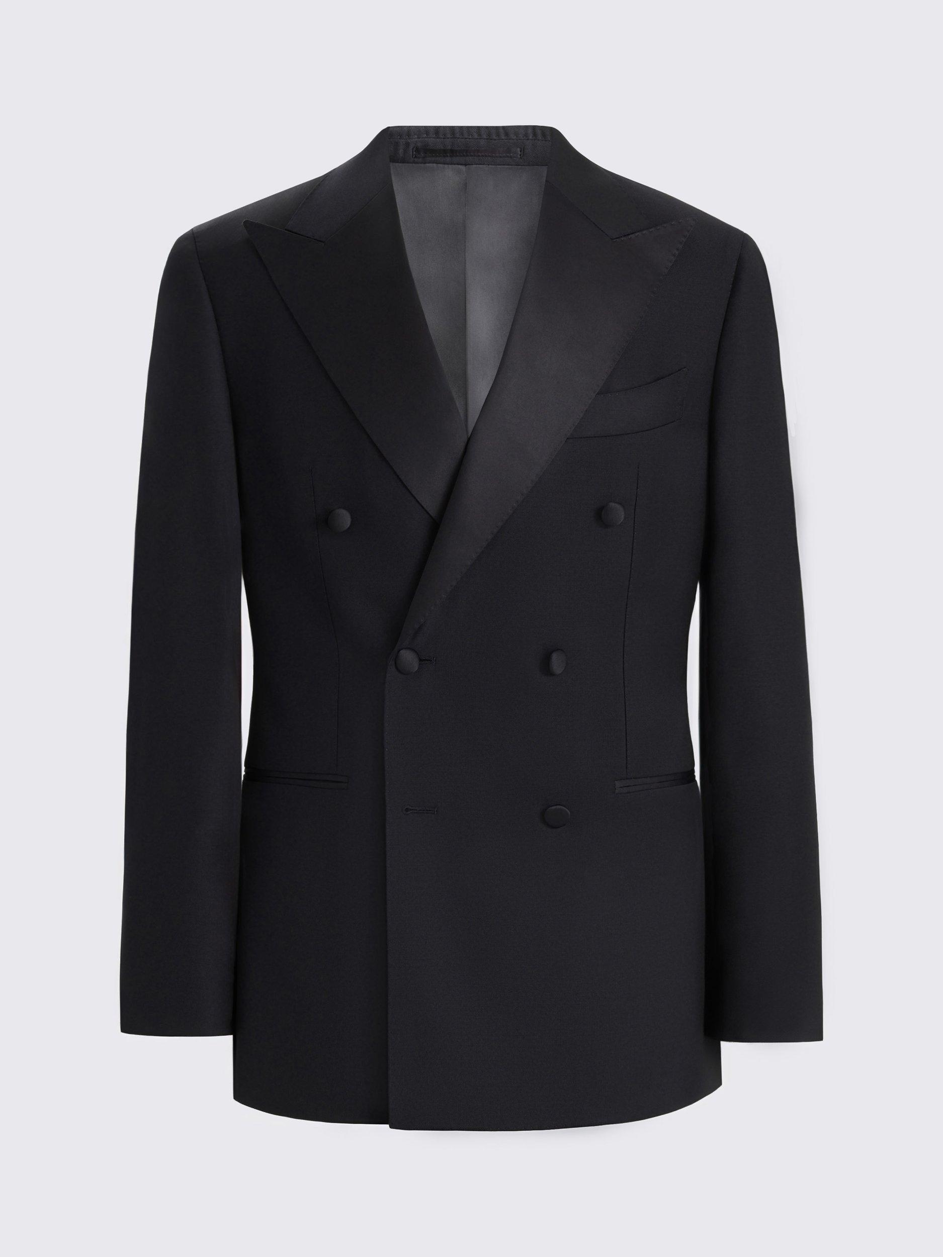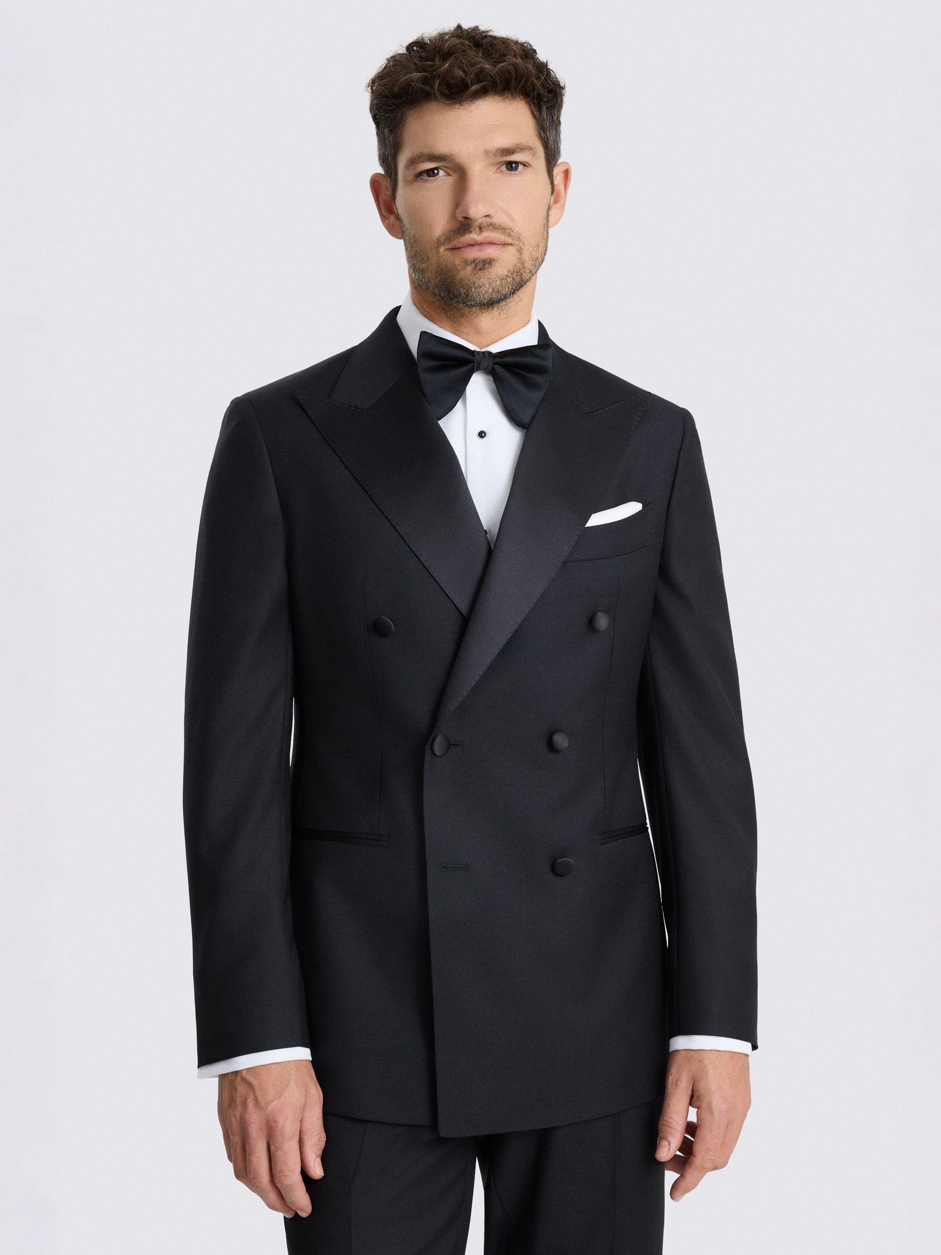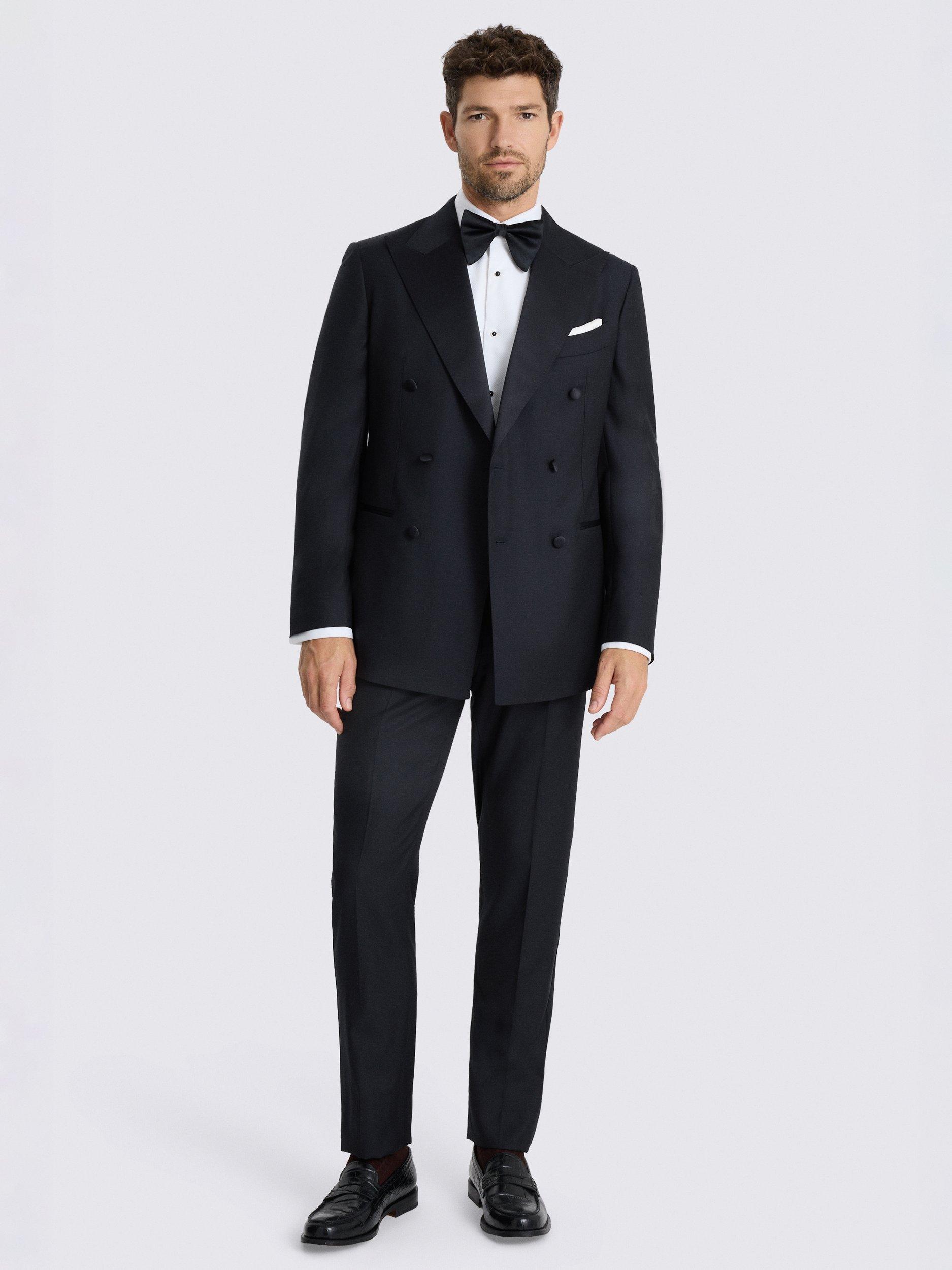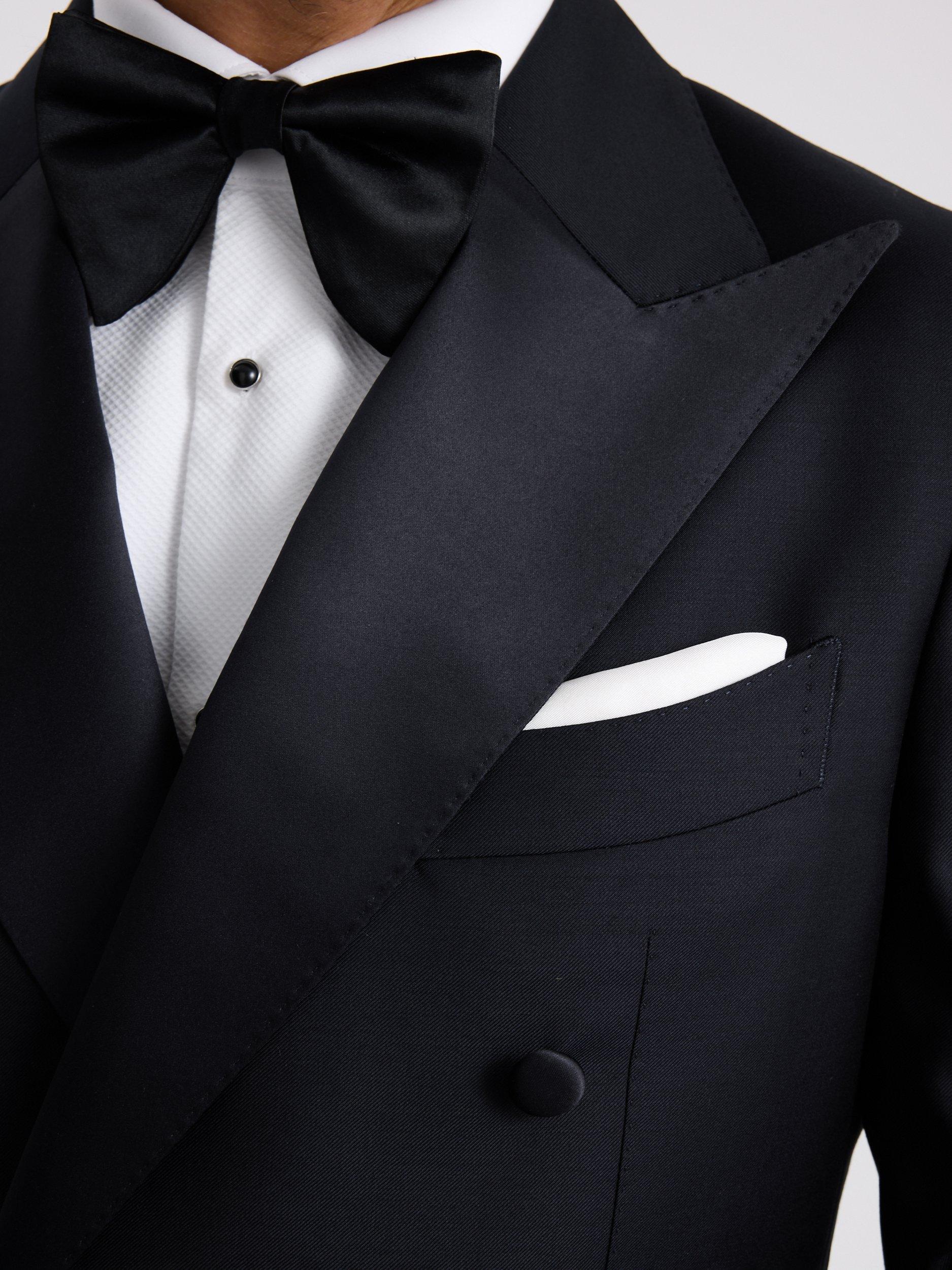 Cut to a tailored fit, this navy dinner suit is crafted in cloth made from Super 110s Italian wool for a soft touch that looks and feels extra luxurious. Trimmed with tonal satin to deliver that evening-ready finish you're after.