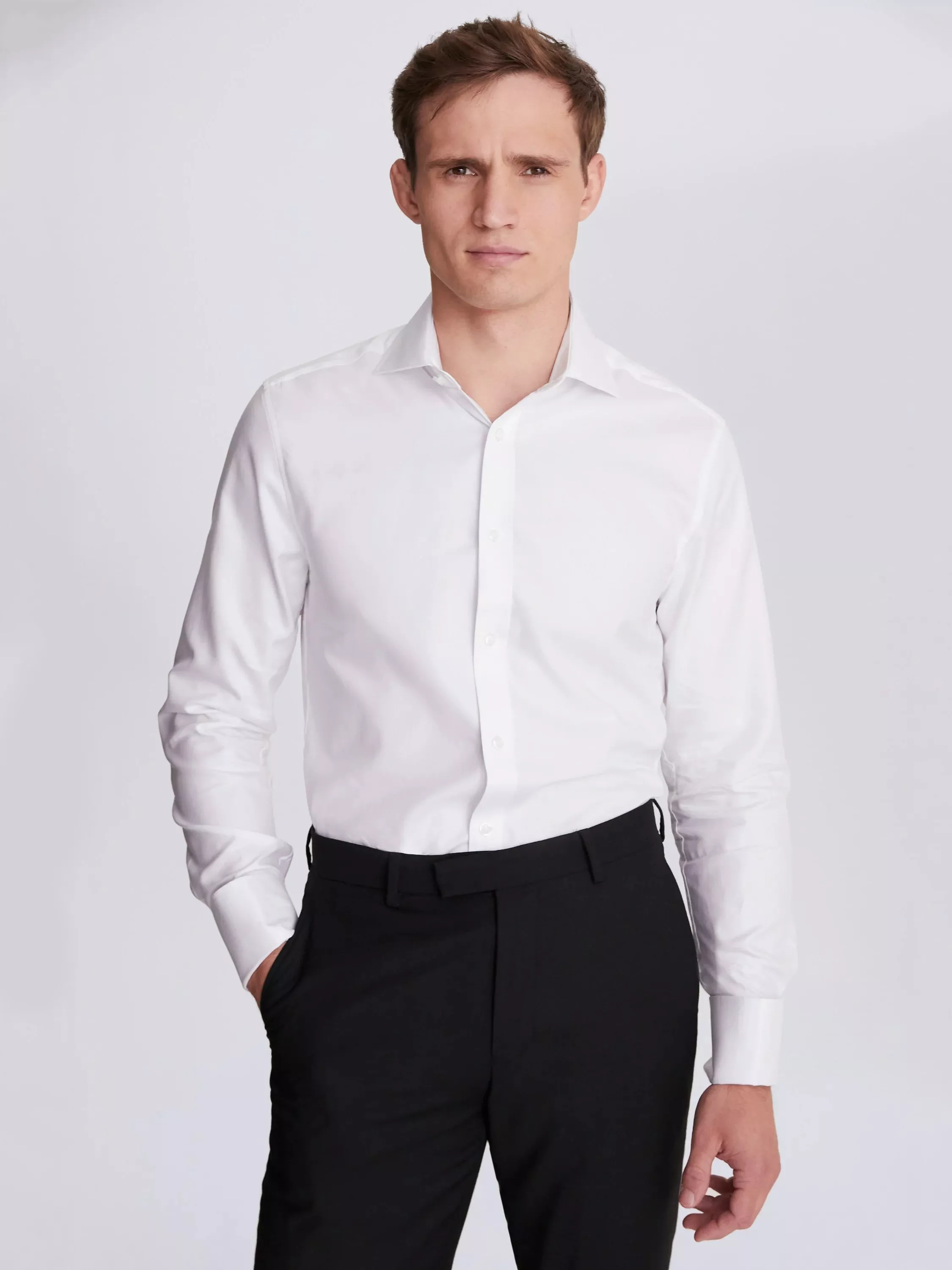 No wardrobe is complete without a fail-safe white cotton shirt, and you'll come to rely on this tailored fit version from Moss time and again.