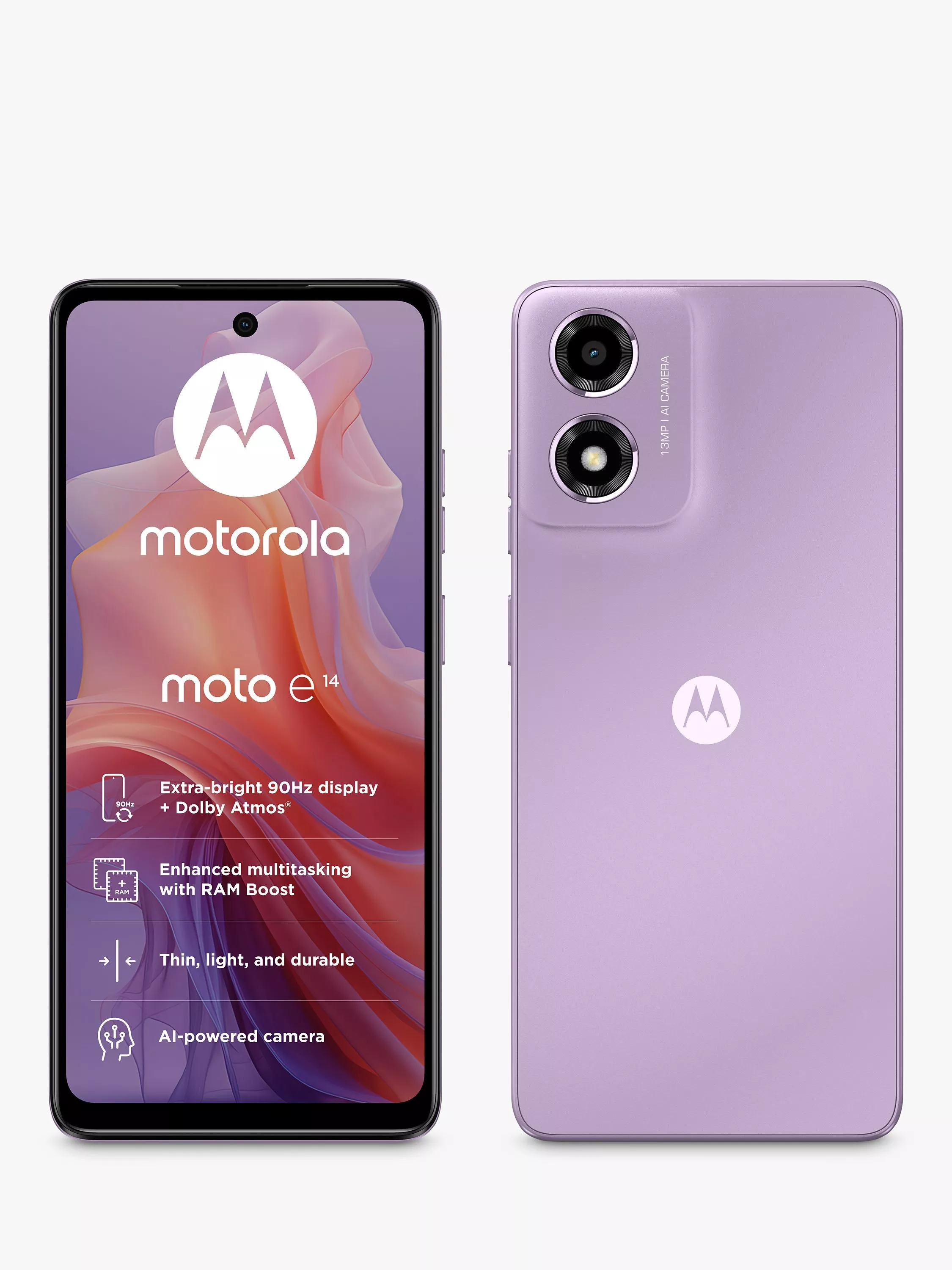 Fuel your passion for entertainment with the moto e14. Watch shows and movies come to life on an extra-bright 6.56" 90Hz ultra-wide display backed by Dolby Atmos sound. And do it all with a thin, lightweight phone that's built to last thanks to Corning Gorilla Glass 3 and an IP52 water-repellent design. Feeling inspired? Unleash your creativity with an AI-powered camera that makes it easy to shoot like a pro. Or binge watch your favourite shows to the finish with a 5000mAh battery. The new moto e14 gives your entertainment a boost.