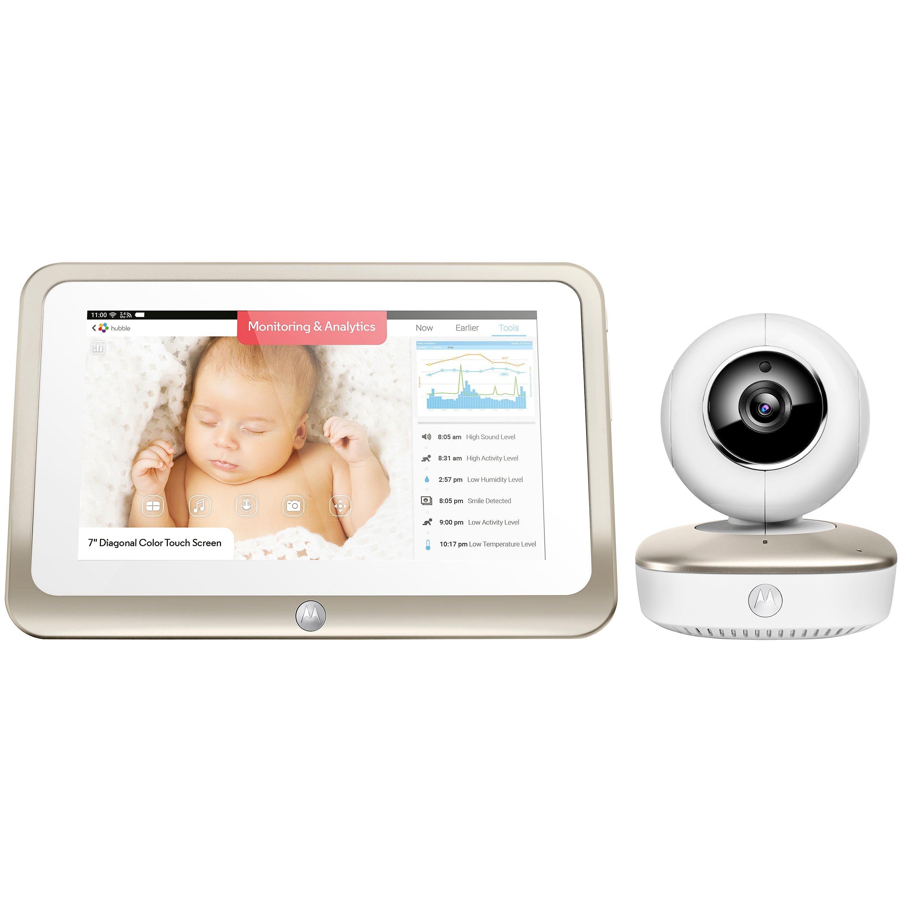 This is a super size 7'' Portable HD Touch Screen Portable Rechargeable camera, with remote pan, tilt and zoom Wi-Fi connectivity (for remote reviewing). All products can be controlled or monitored remotely through Smart Nursery 7 and it is able to analyse temperature, humidity, noise and activity monitoring with analytics. A specialised App called Hubble allows users to view camera on compatible Smartphone & Tablets and receive sound, motion, humidity and temp alerts, as well as remote HD (1080p) video streaming.