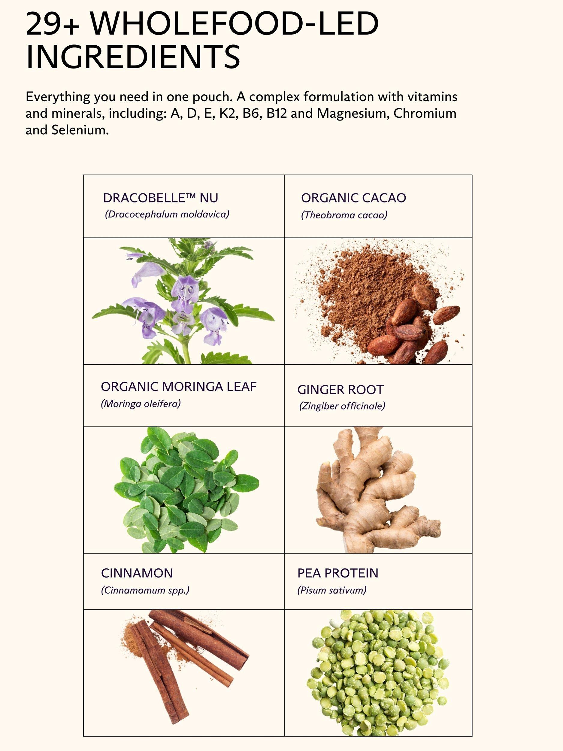 Therapeutic doses of magnesium, vitamin C and iron for the reduction of tiredness and fatigue are blended with organic cacao, which is rich in phenylethylamine (PEA for short) which can improve mood and reduce symptoms of anxiety.