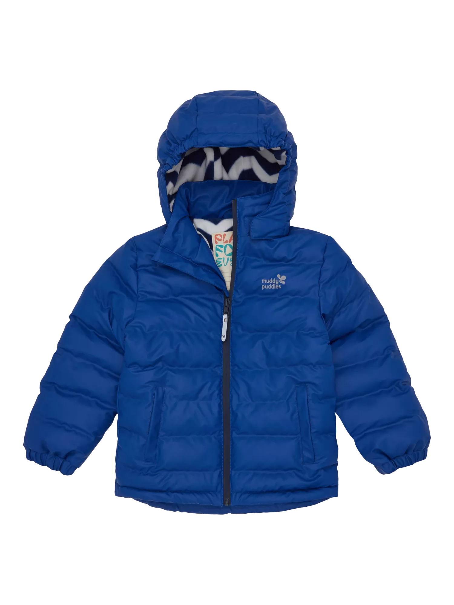 This cosy blue puffer is made for the chilliest and rainiest adventures. Fully waterproof to 10,000mm with welded seams and a waterproof zip, the jacket ensures not a drop of rain gets in. Featherless insulation and a fleece-lining keeps young explorers warm and snug. Reflective zip pulls boost visibility in low lighting and secure pockets are ideal for stashing found treasures.